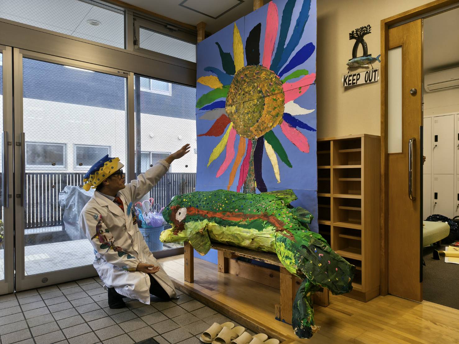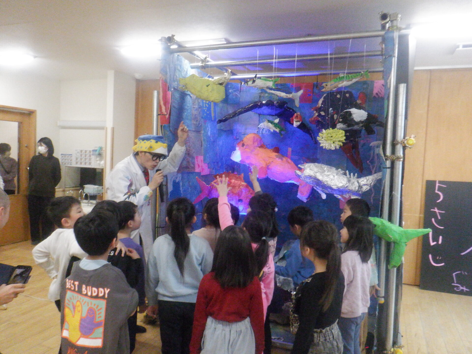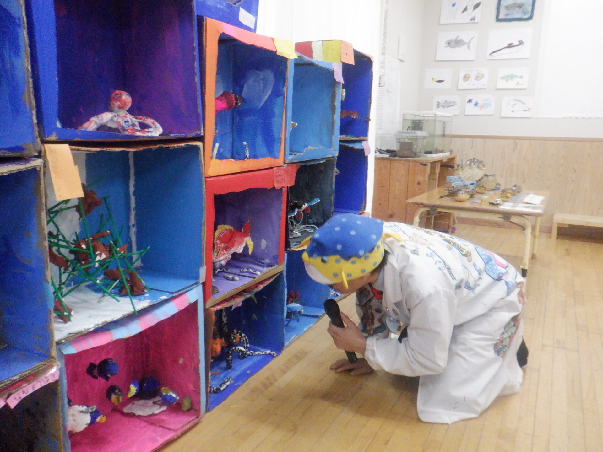 先日の作品展で展示した個人の水槽と、巨大水槽を保育室内に再現しました。