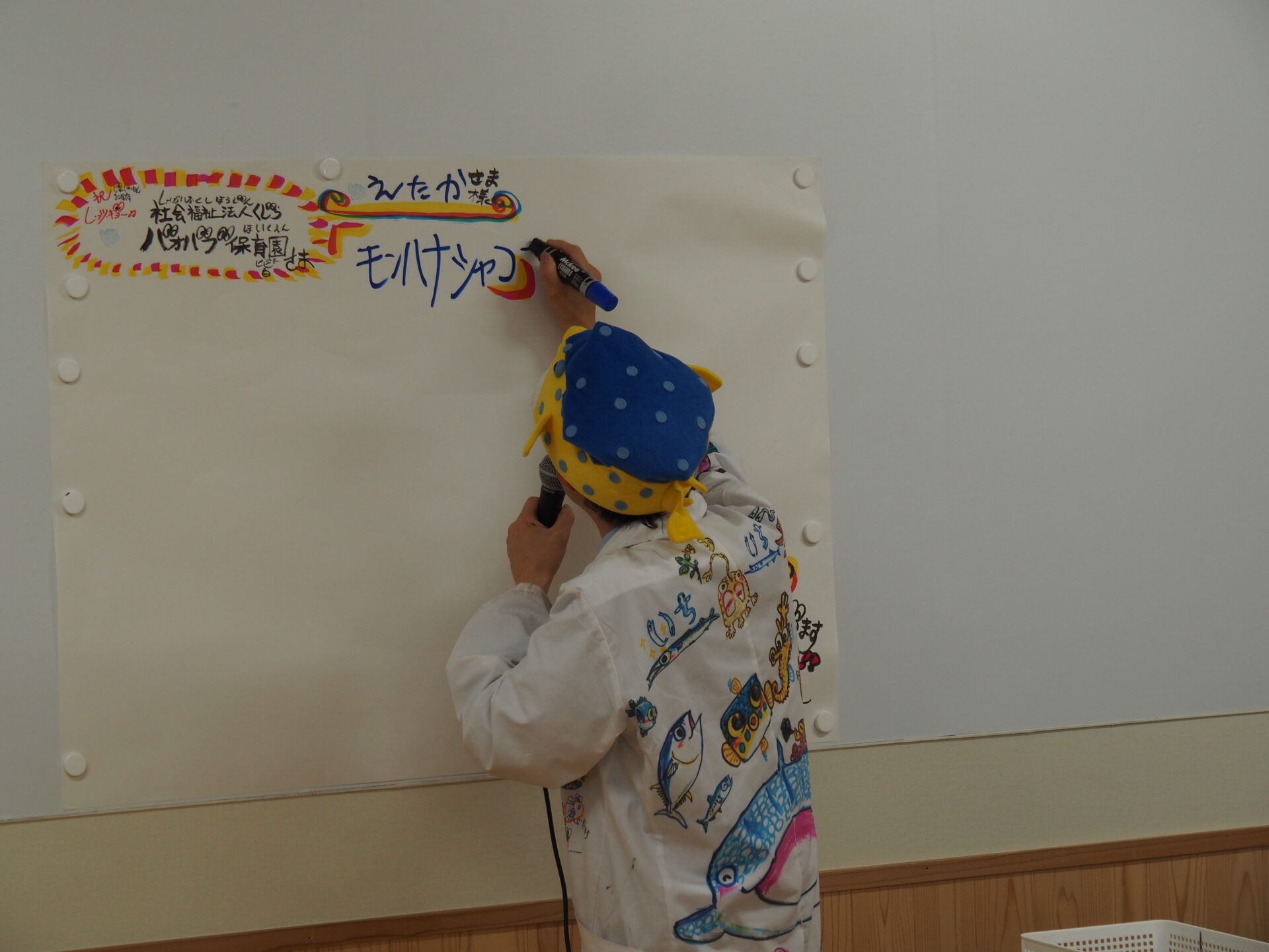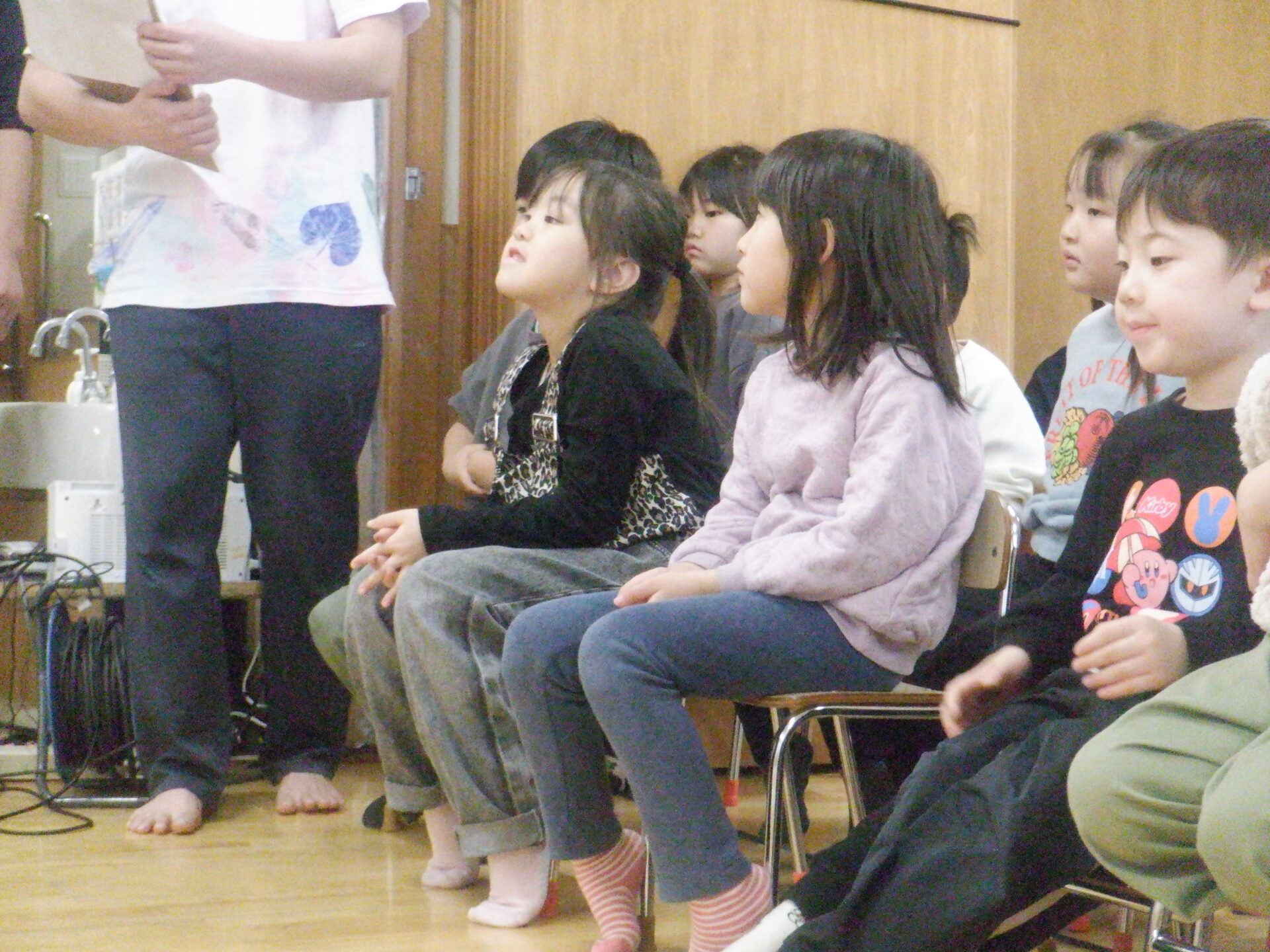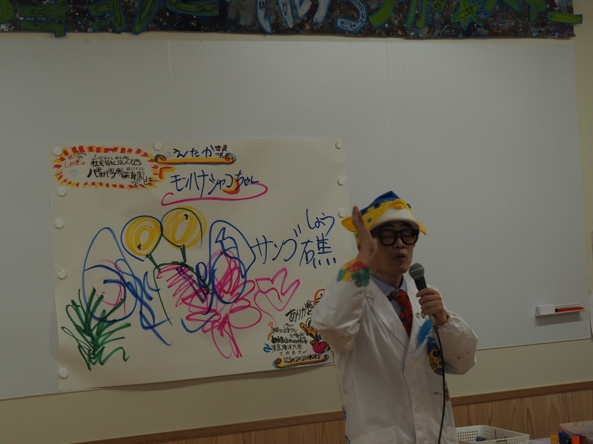 バオバブ組(5歳児)が以前作った巨大ニジマスも見て頂き、ニジマスが海に行くともっと大きくなってキングサーモンとなったり、富士山のふもとのきれいな水で育ったニジマスは”フジノスケ”という名前になるという事も教えて頂きました。
