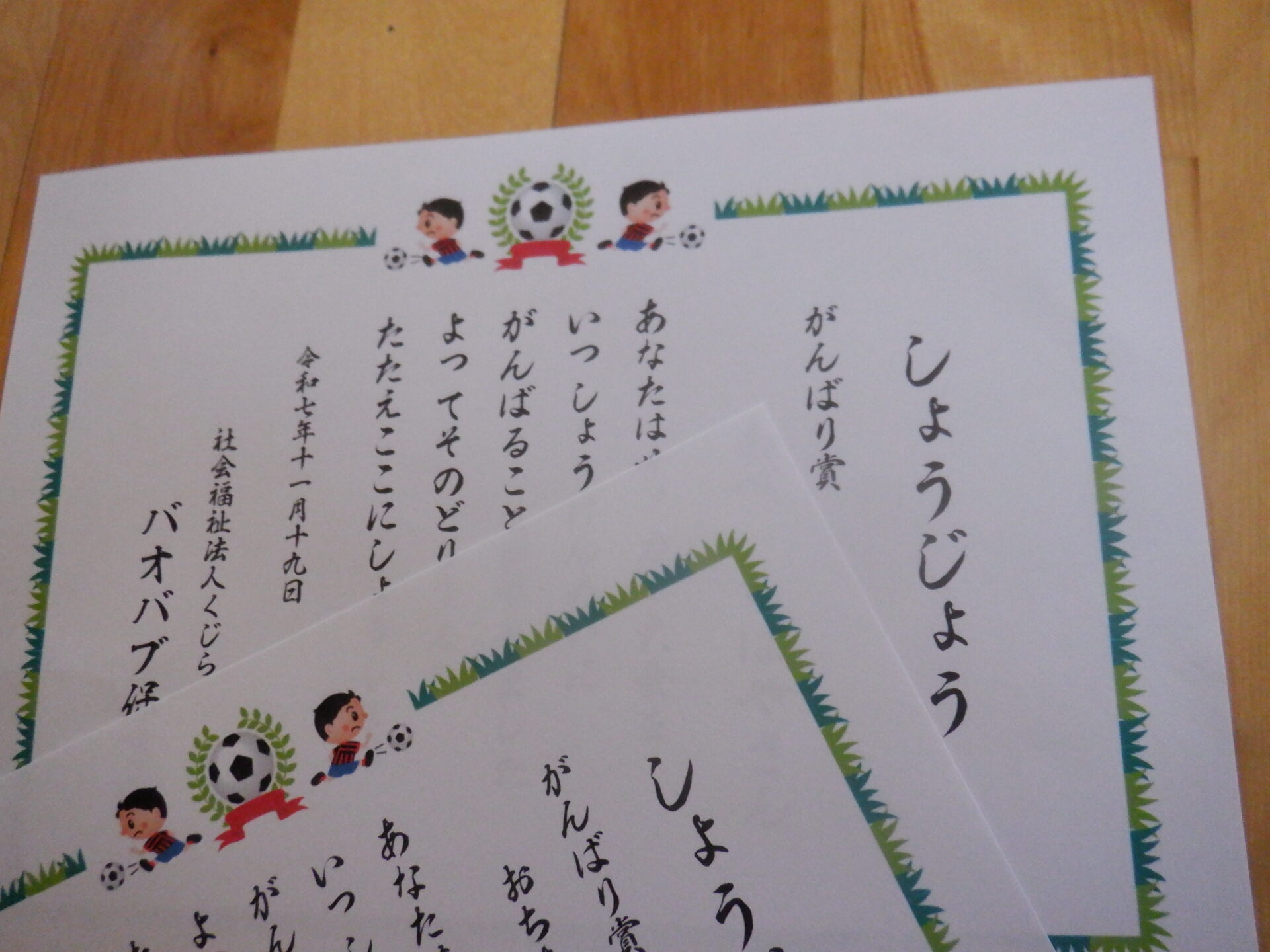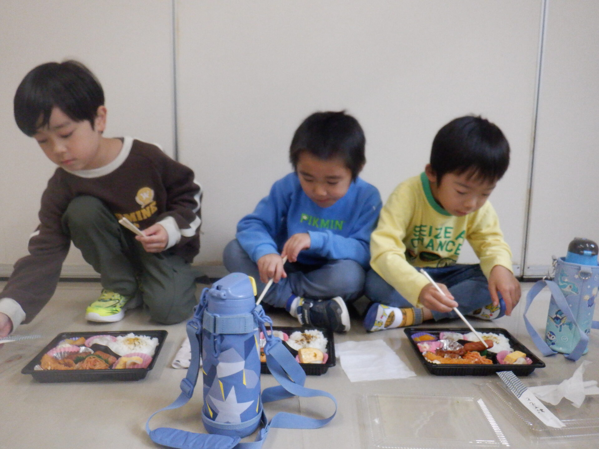 お弁当を食べながら、「トロフィーほしかったよね」「ぼくシュートできたよ!」