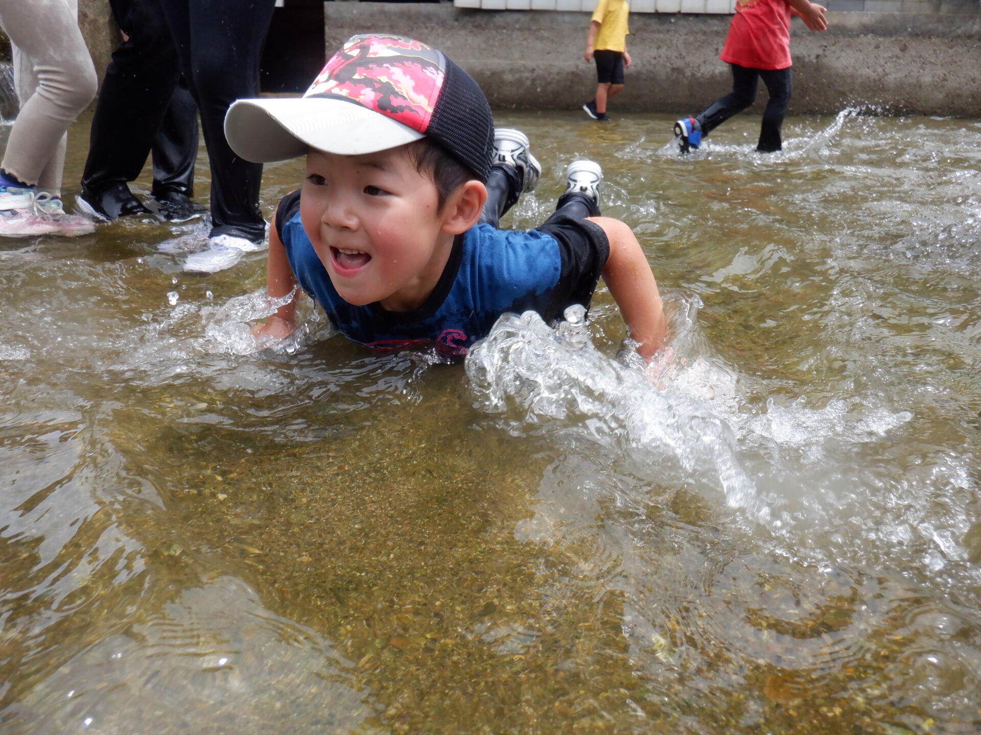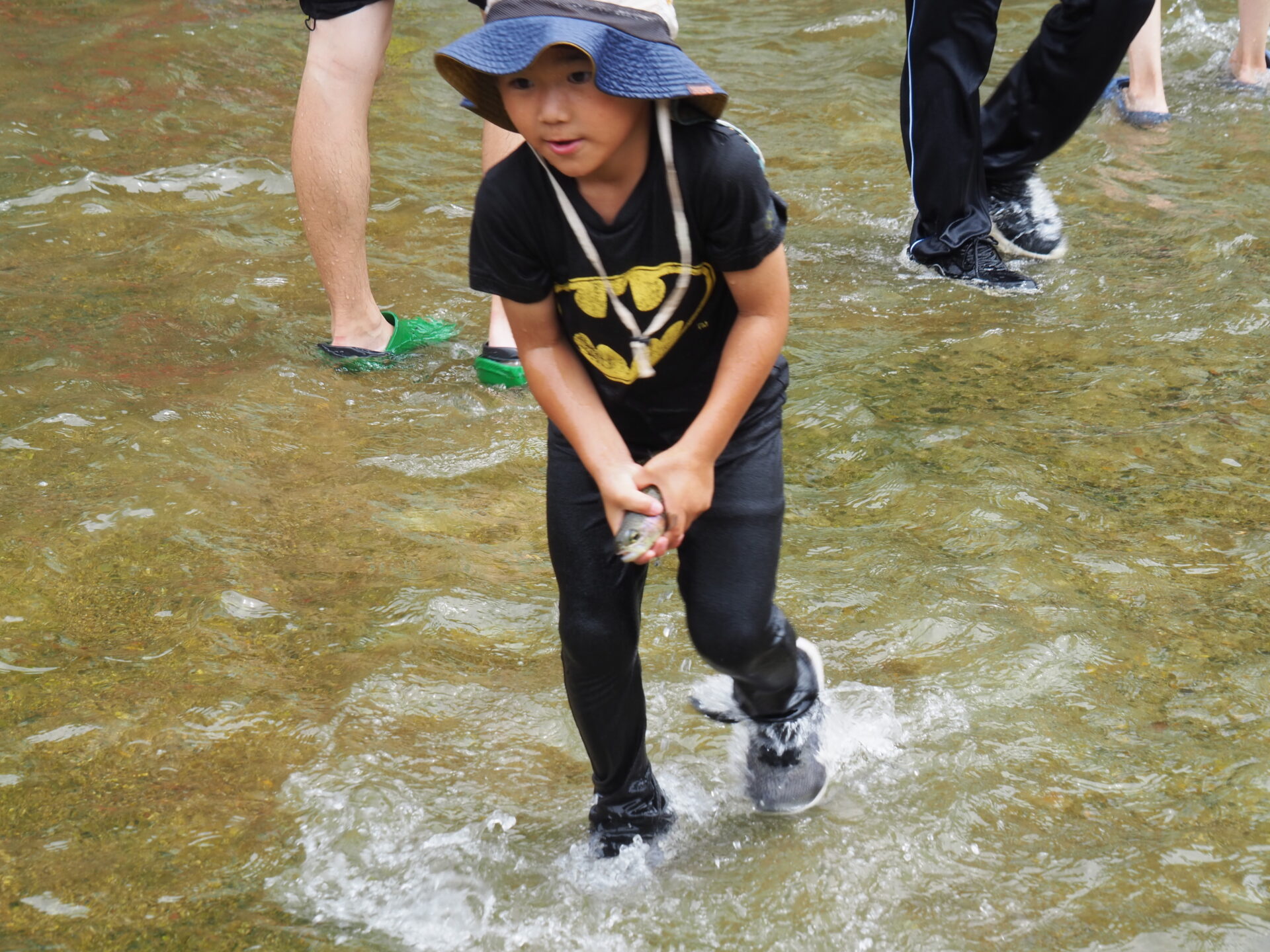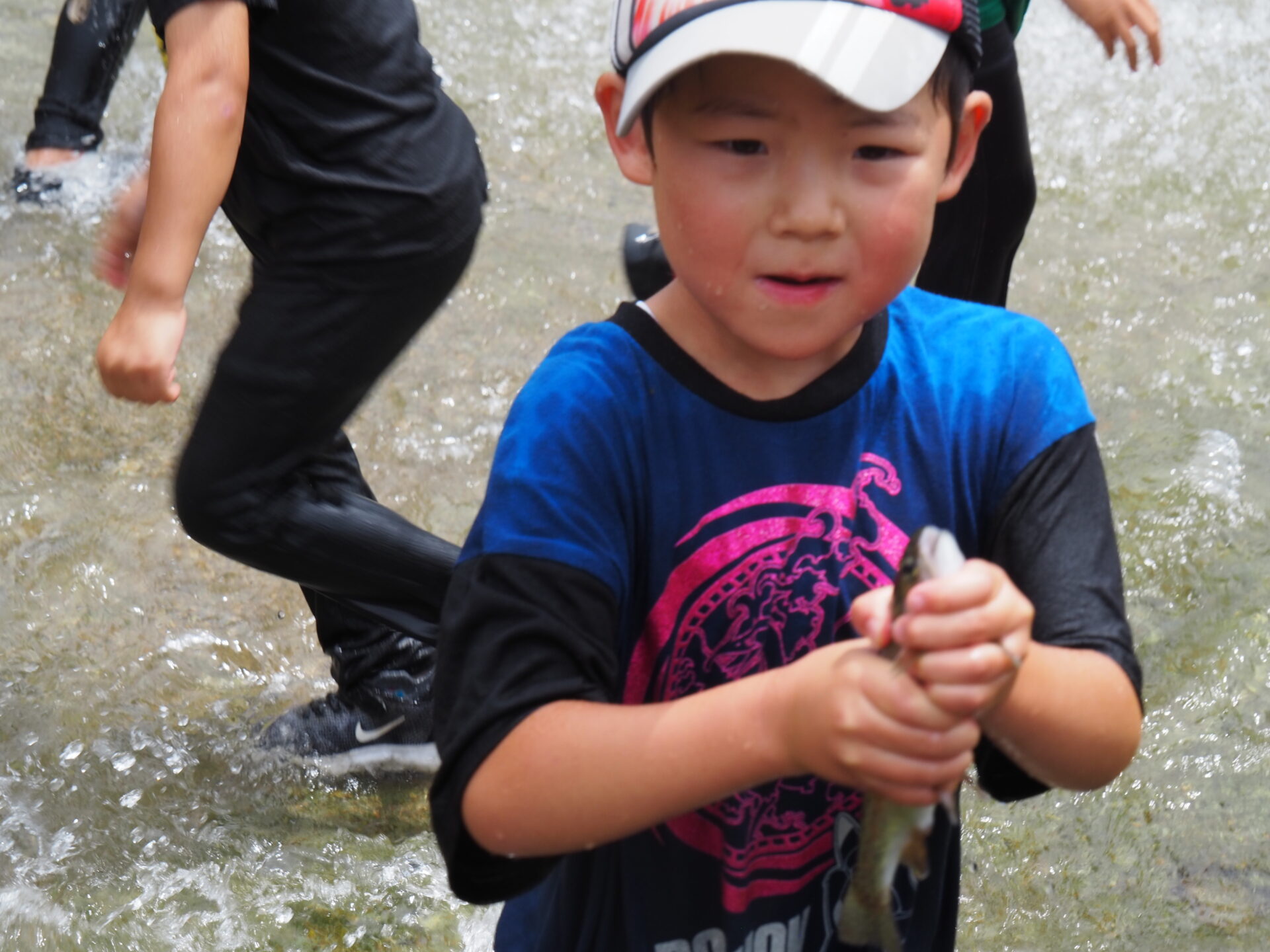 魚の速さに苦戦しながらも、一人でつかまえたり、友だちと協力しながらつかまえたり、