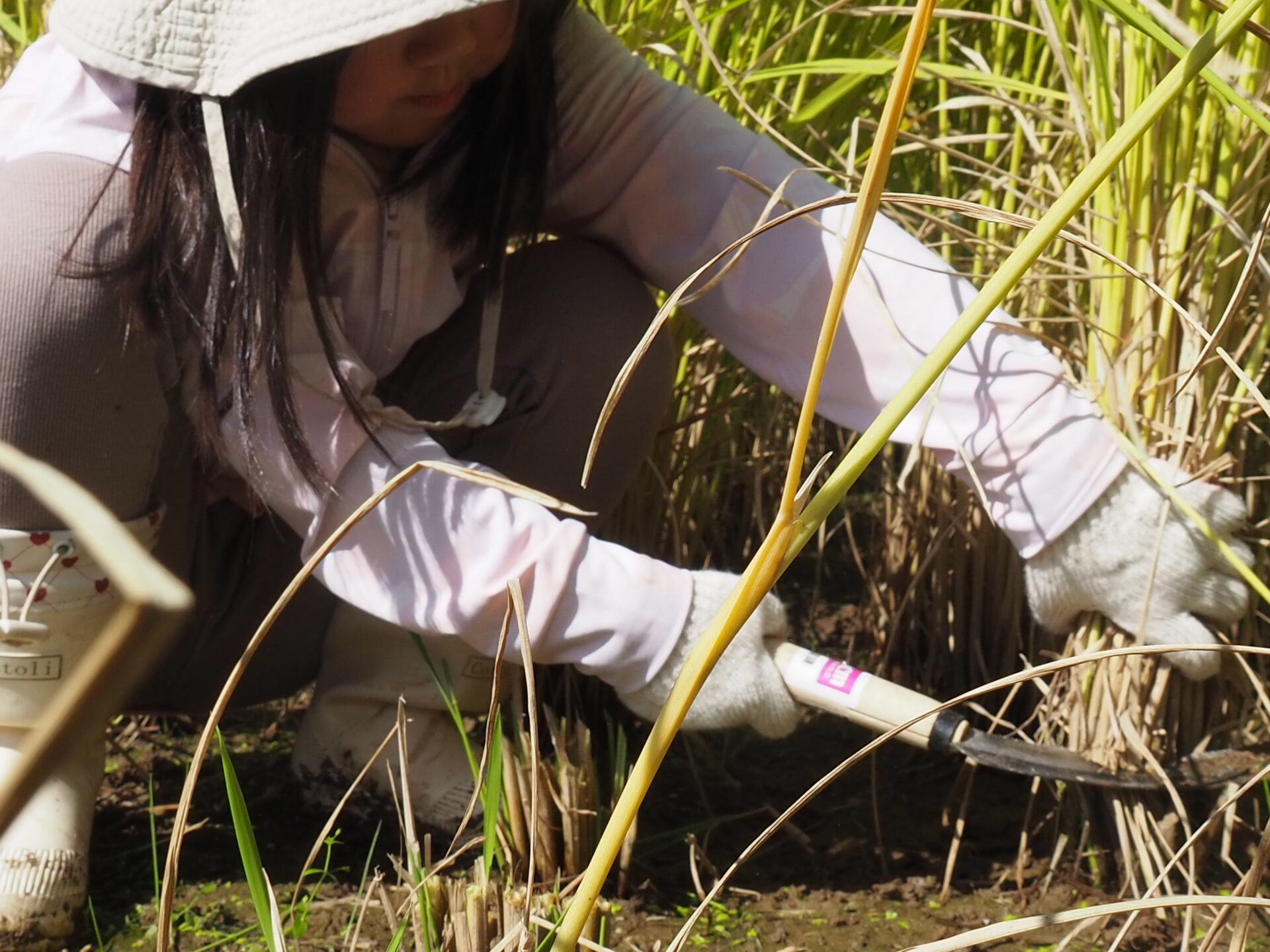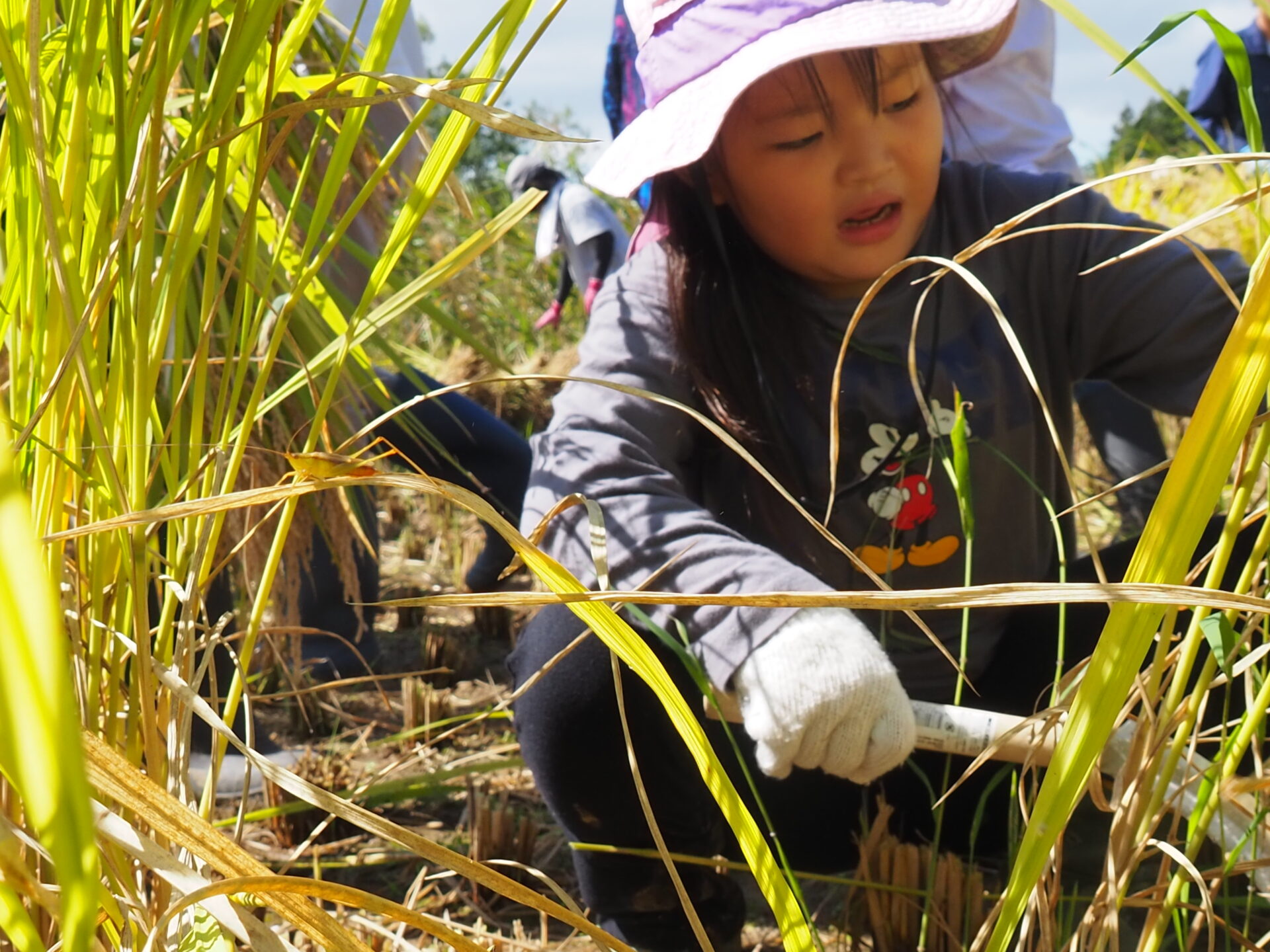 春に植えたお米の苗が収穫の時期を迎え、総勢親子合わせ62名で稲刈りをしました。