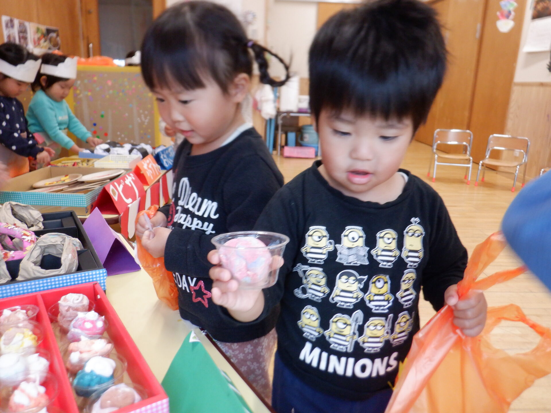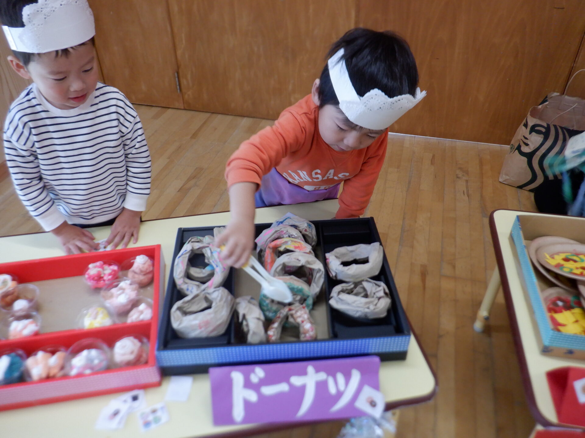 買ったものを友だちと椅子に座り、お話ししながら食べる真似をする姿があったり…。
