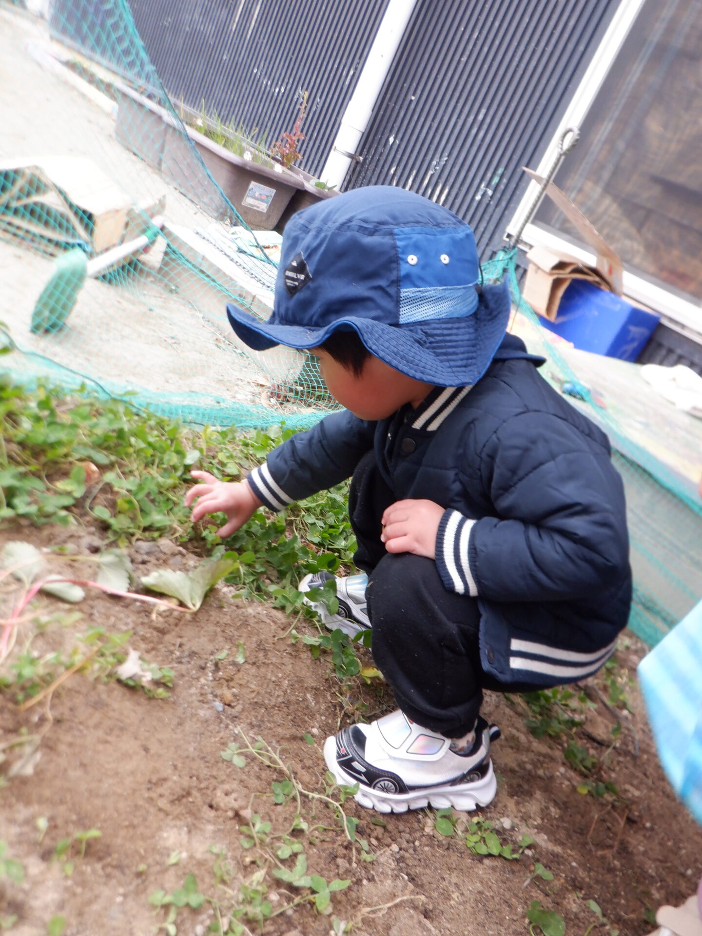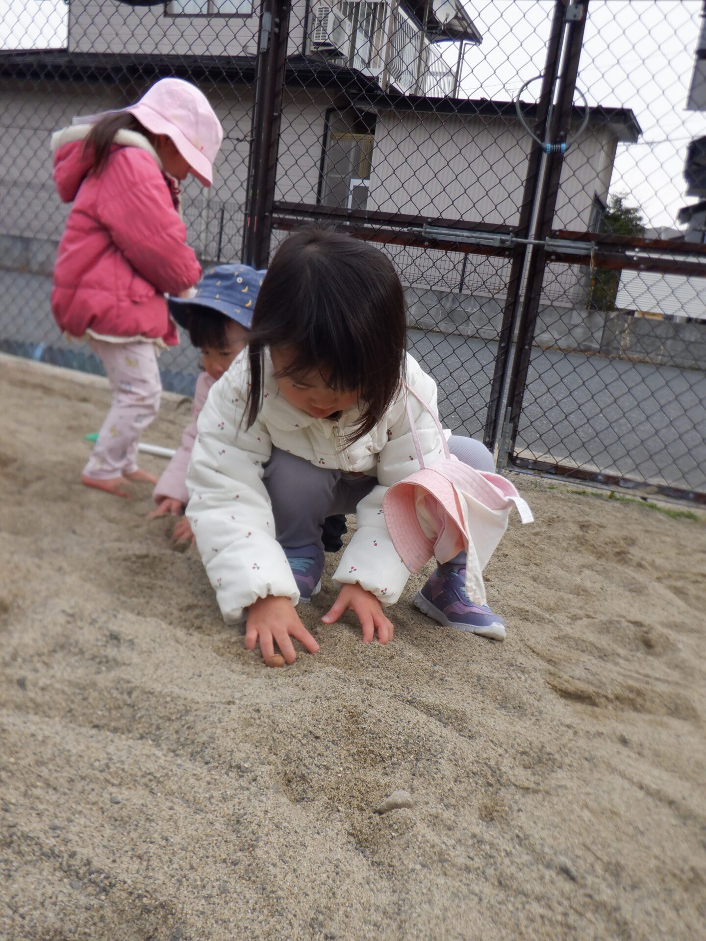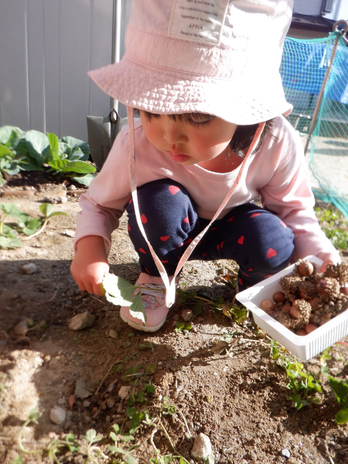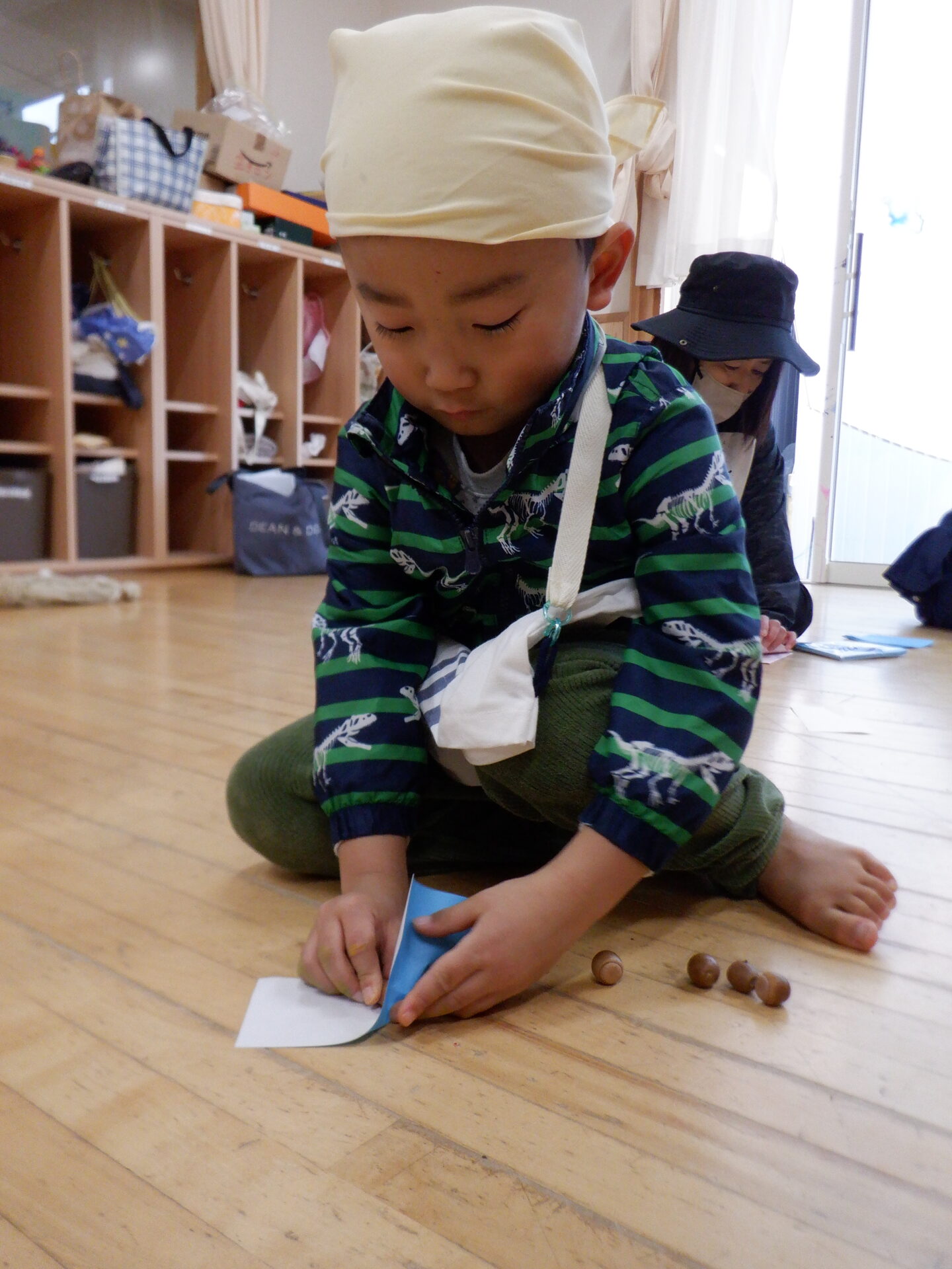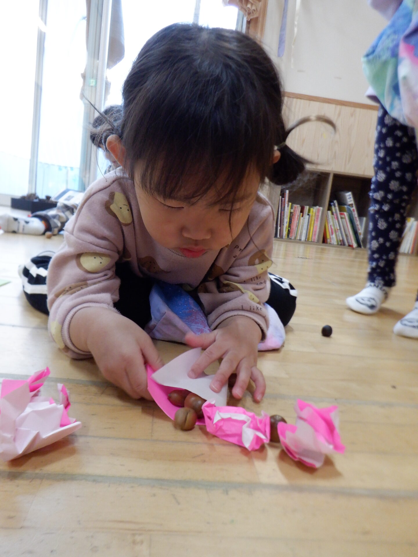 保育士が「ここになにかある。」と、どんぐりを隠すと、そこから宝探しスタート。