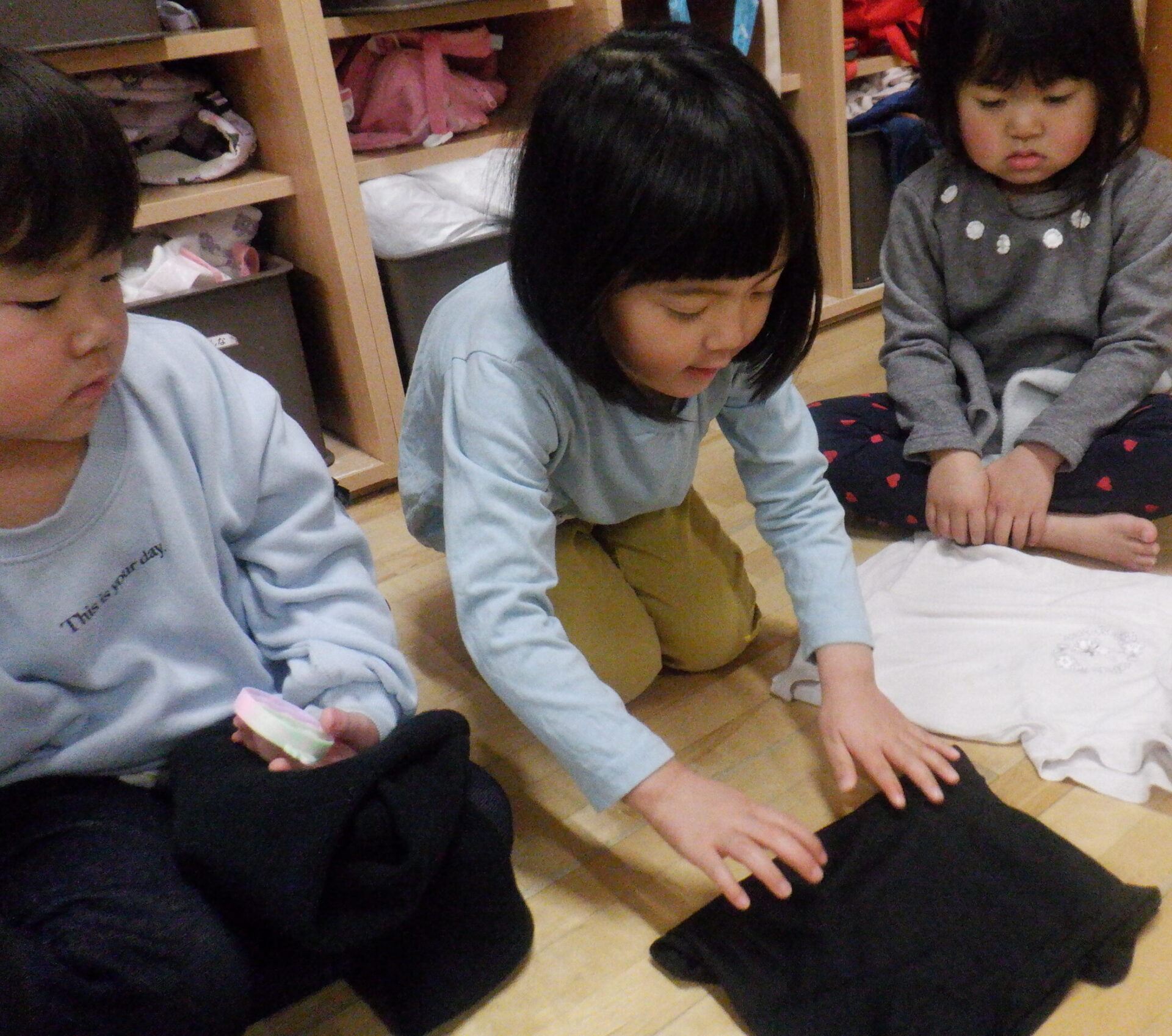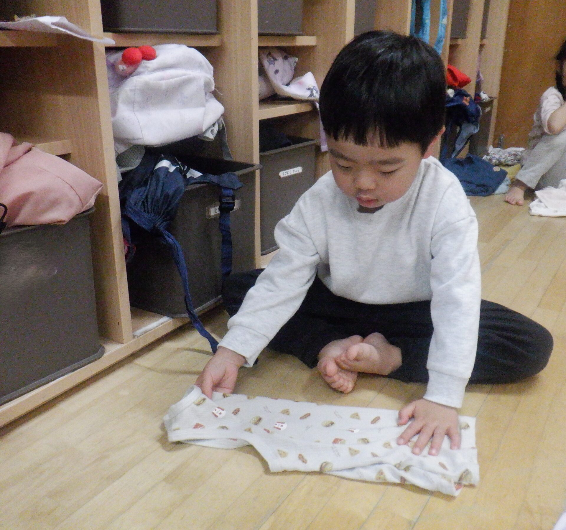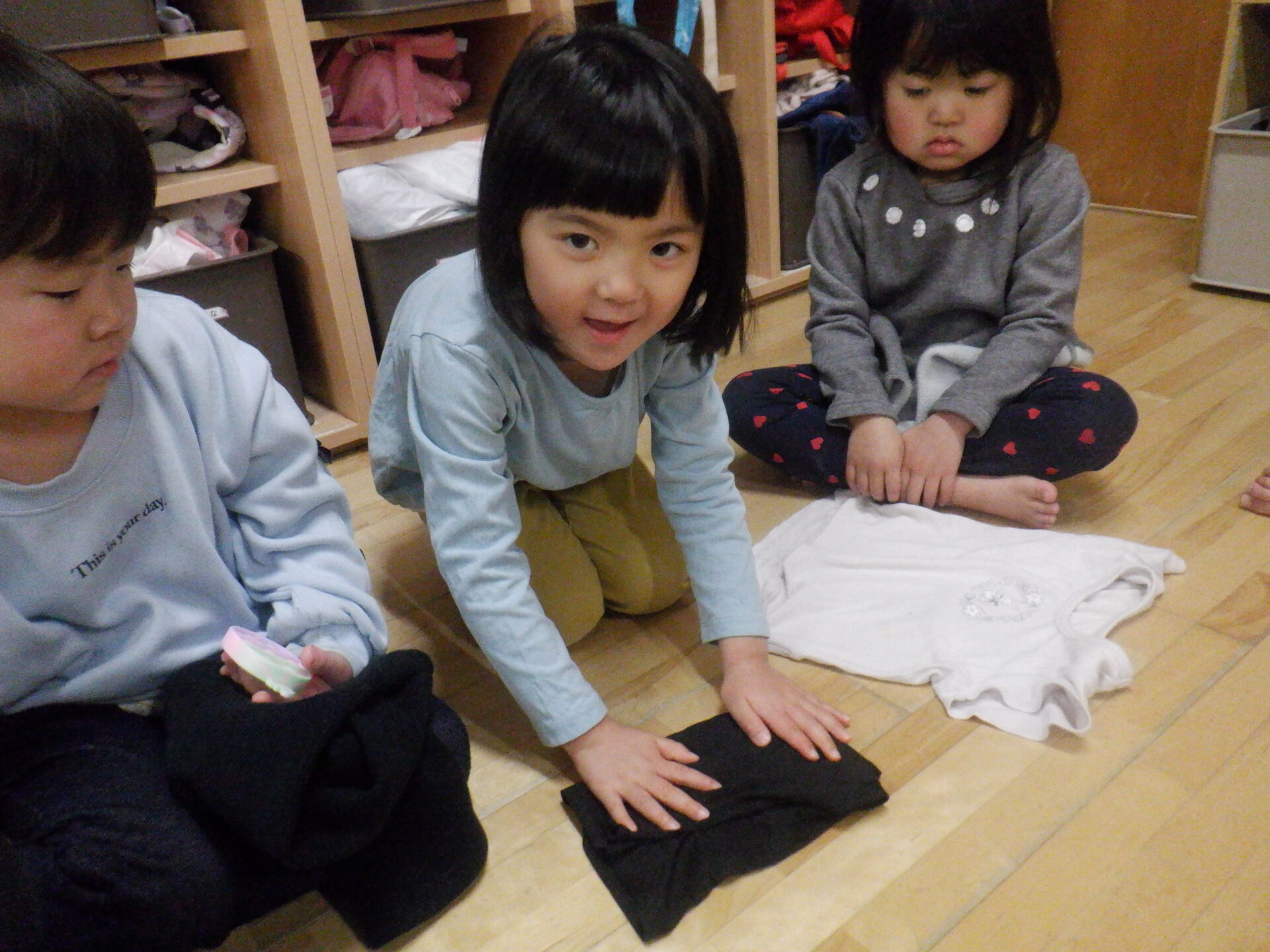 お昼寝明け、すっきりと目覚めて、着替えを済ませた後は脱いだ服もきれいに畳んでしまう事が出来るようになってきたひかり組の子どもたち。