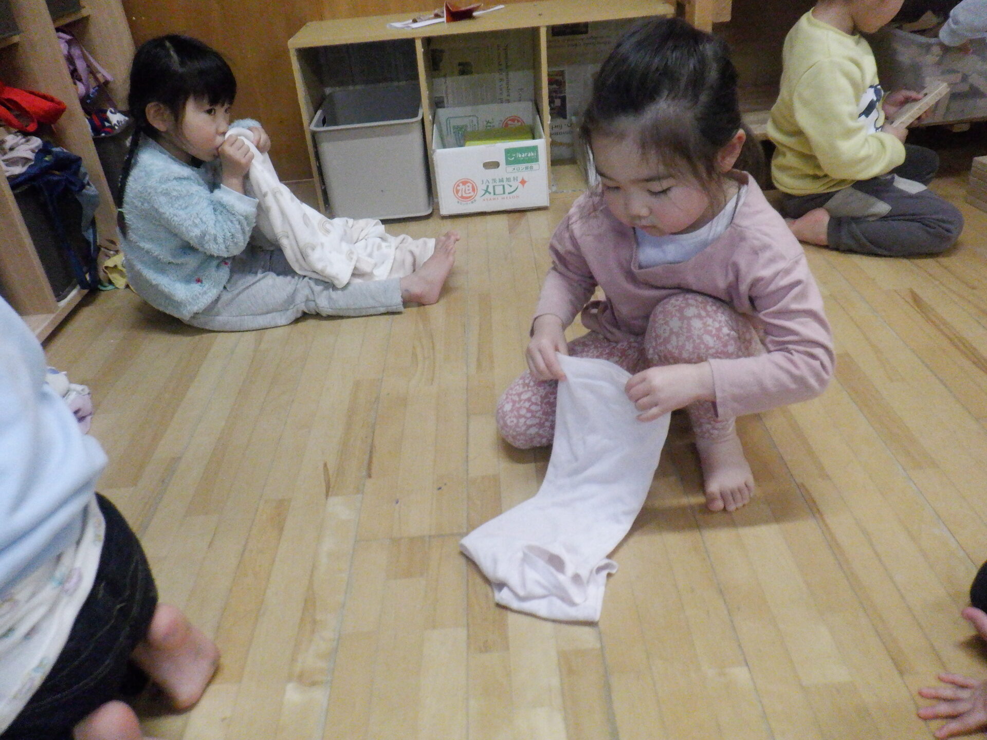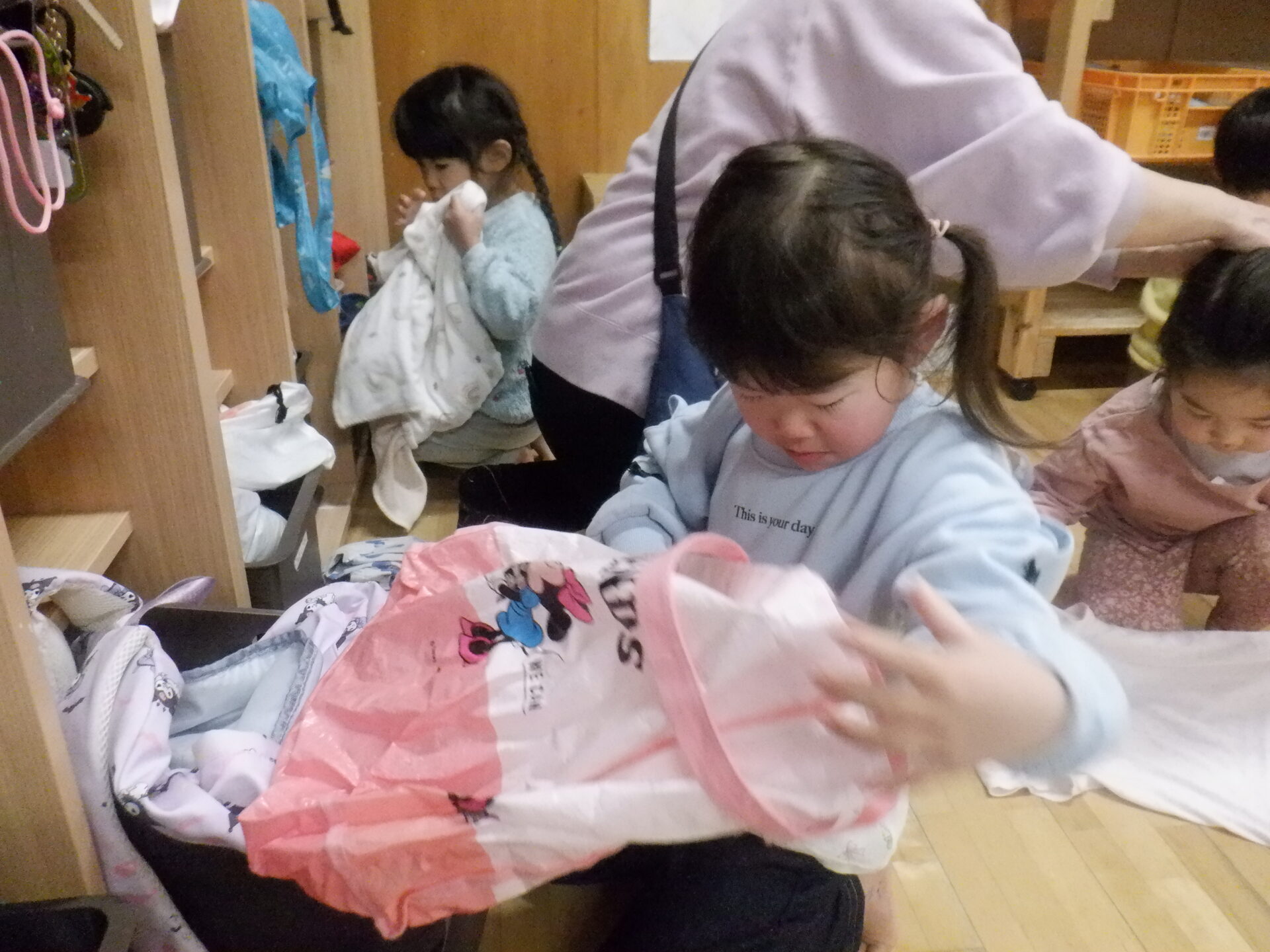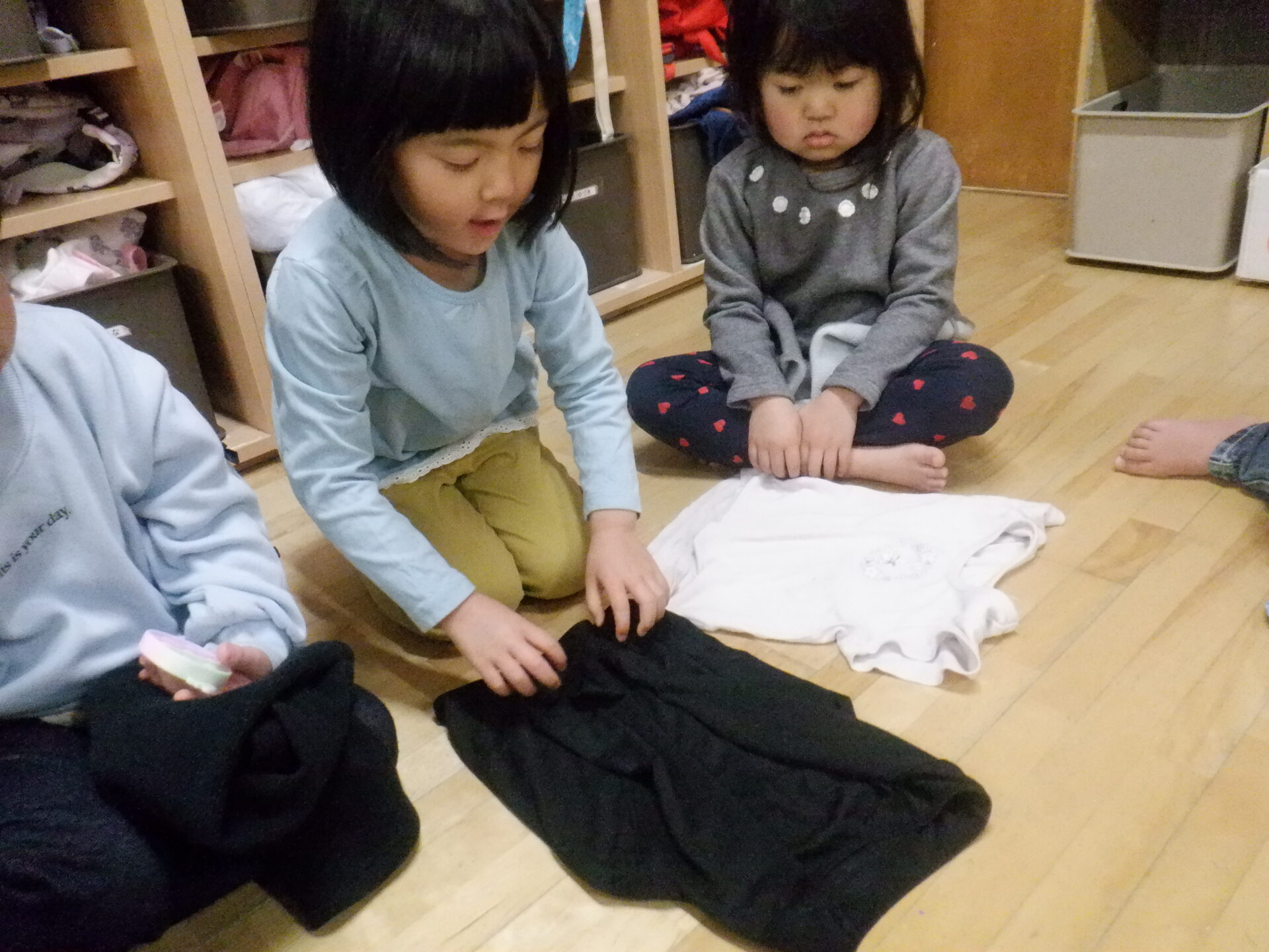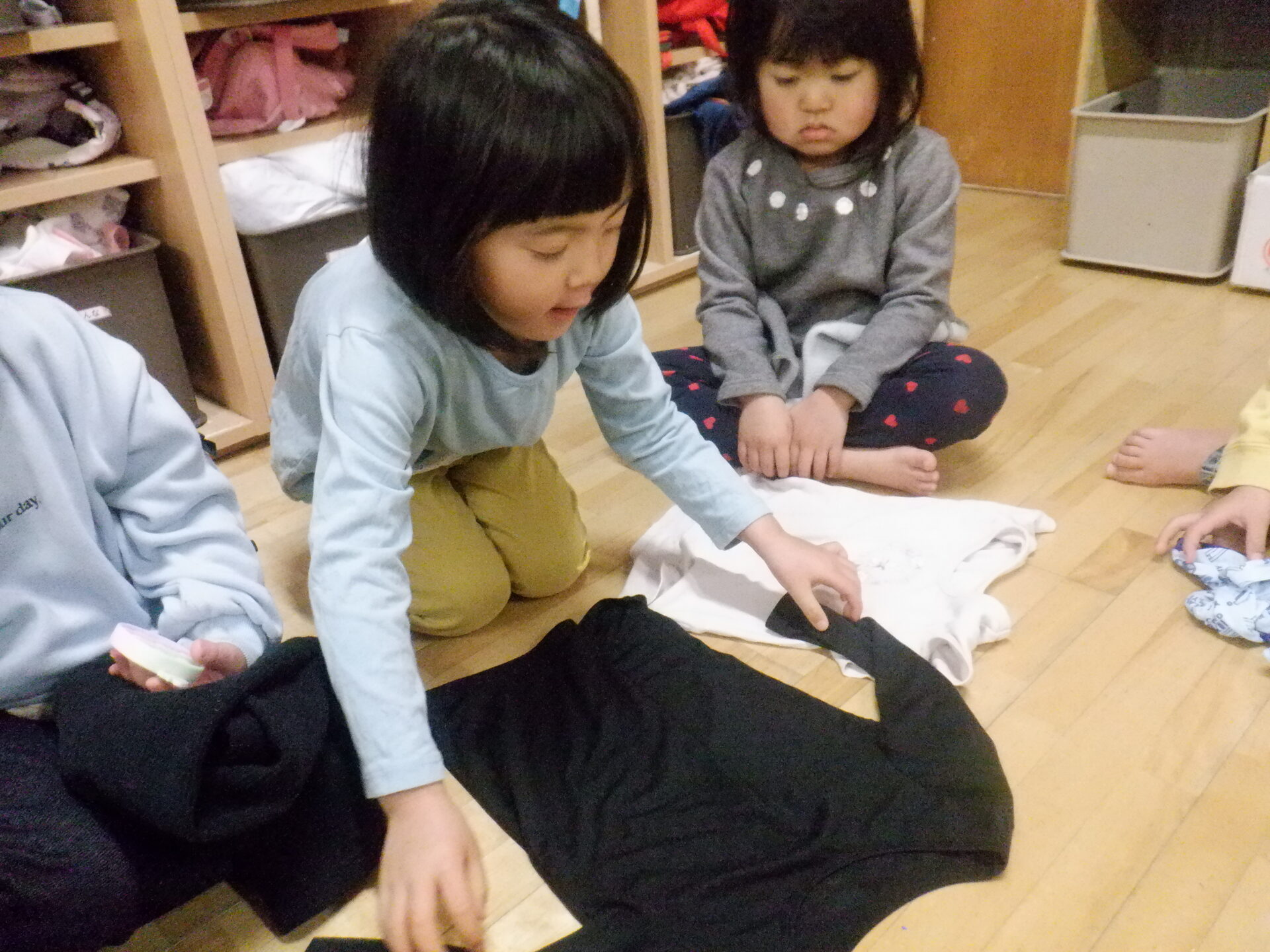 お昼寝明け、すっきりと目覚めて、着替えを済ませた後は脱いだ服もきれいに畳んでしまう事が出来るようになってきたひかり組の子どもたち。