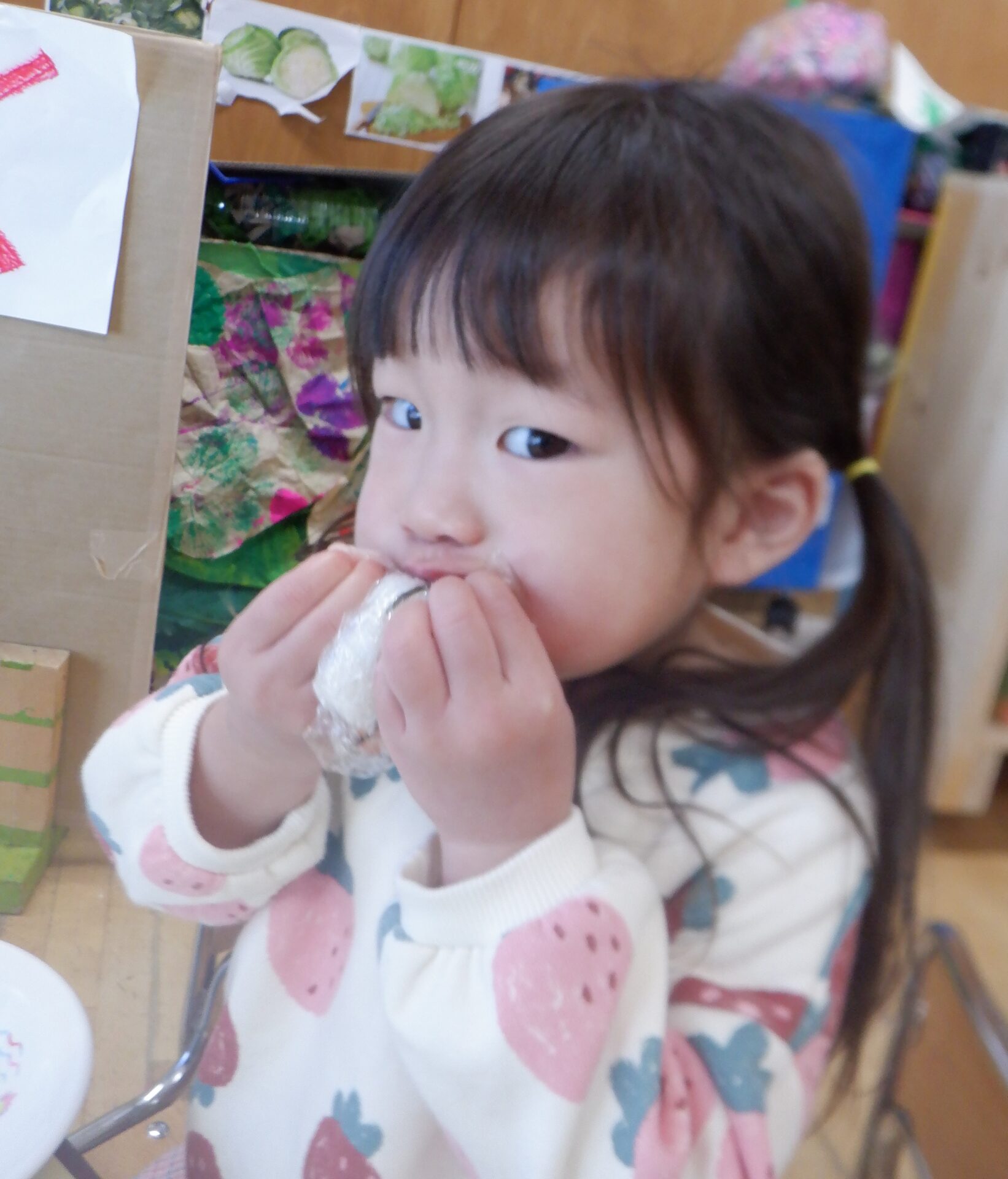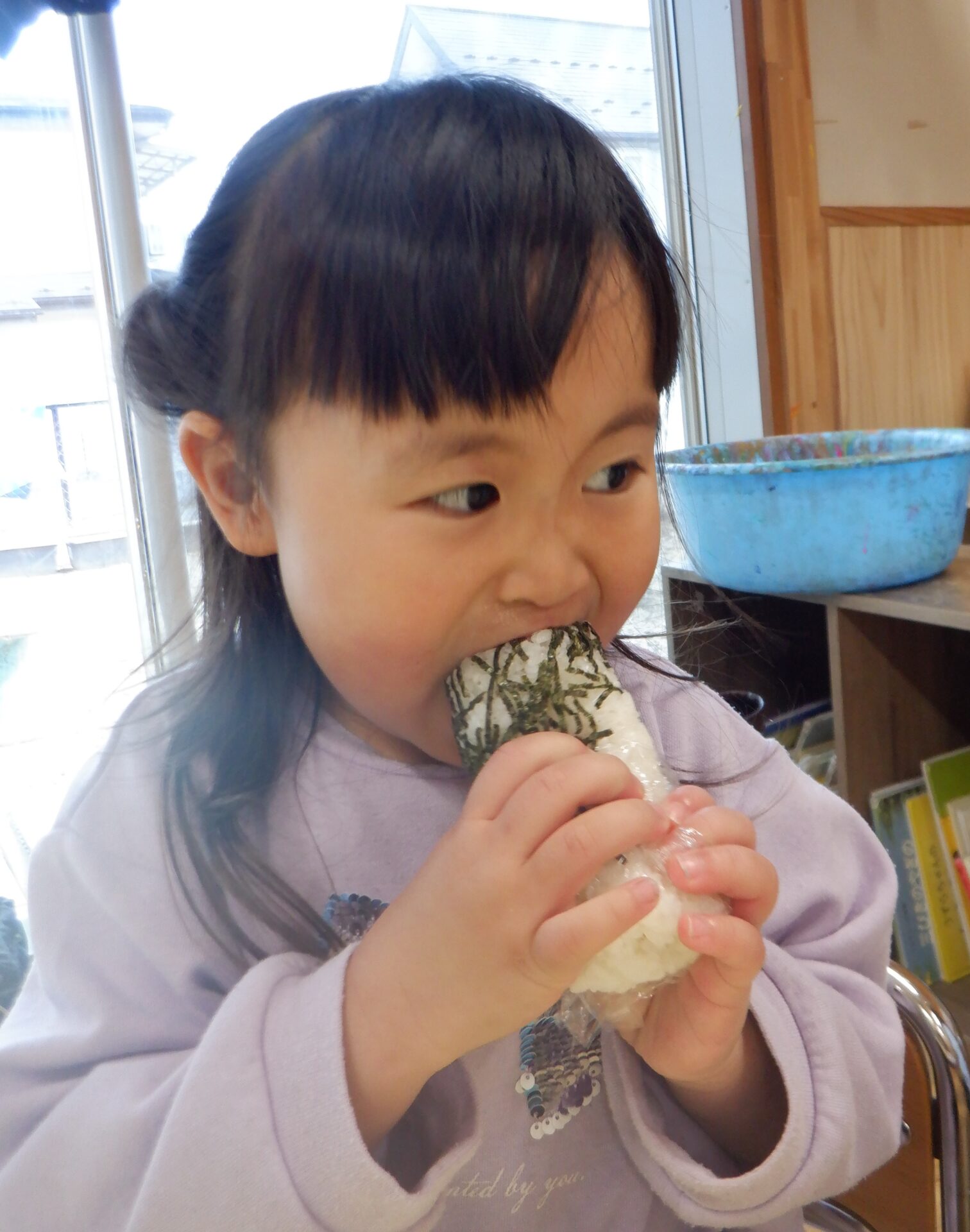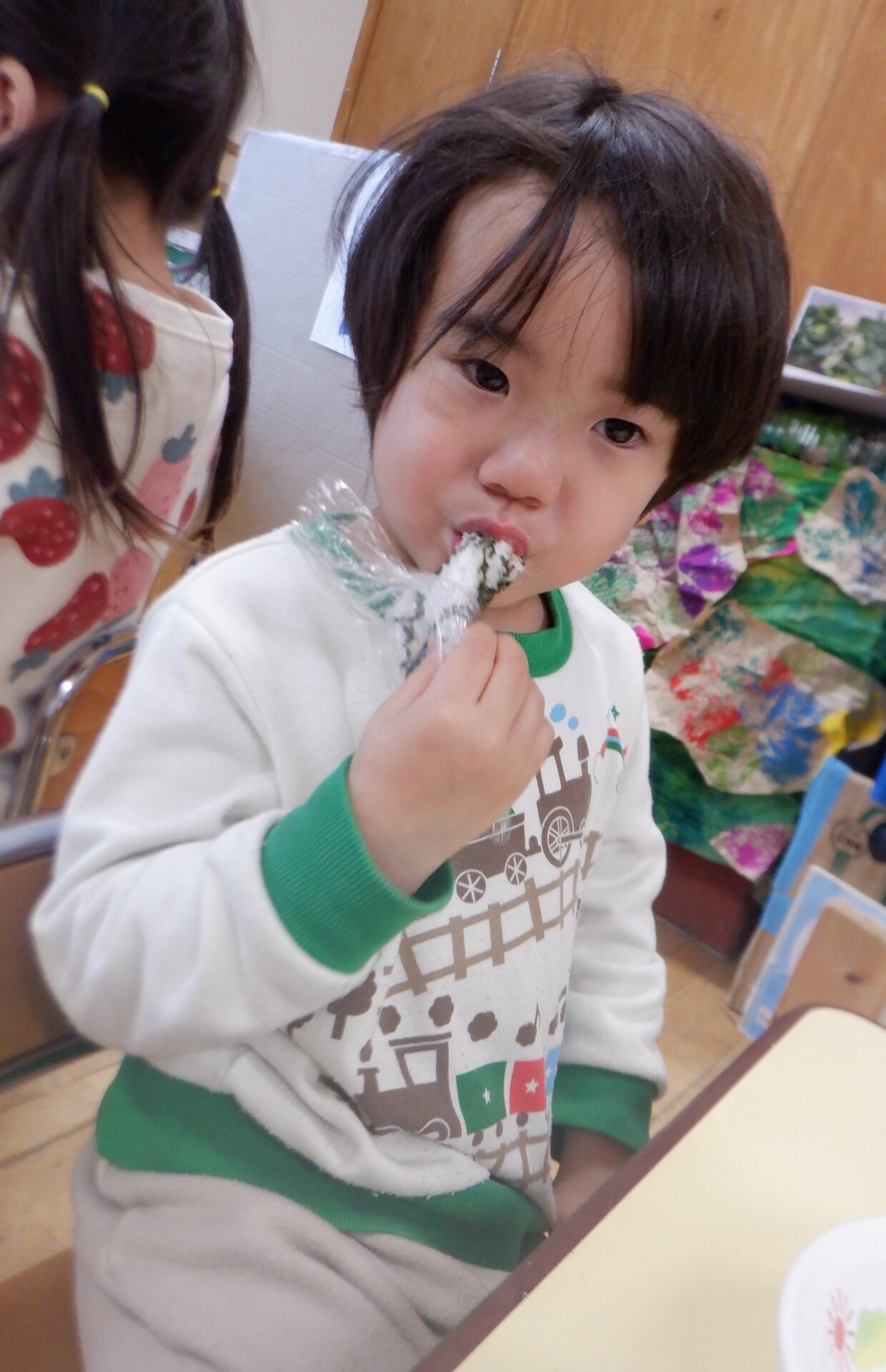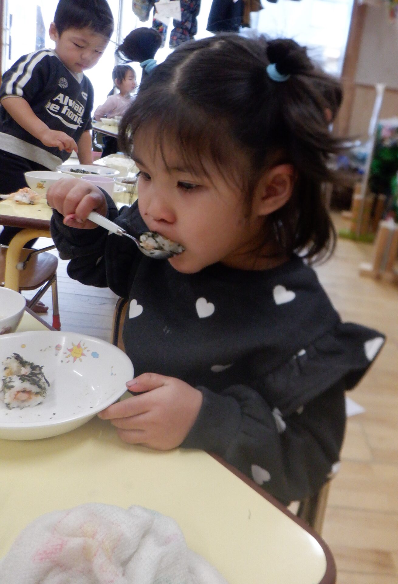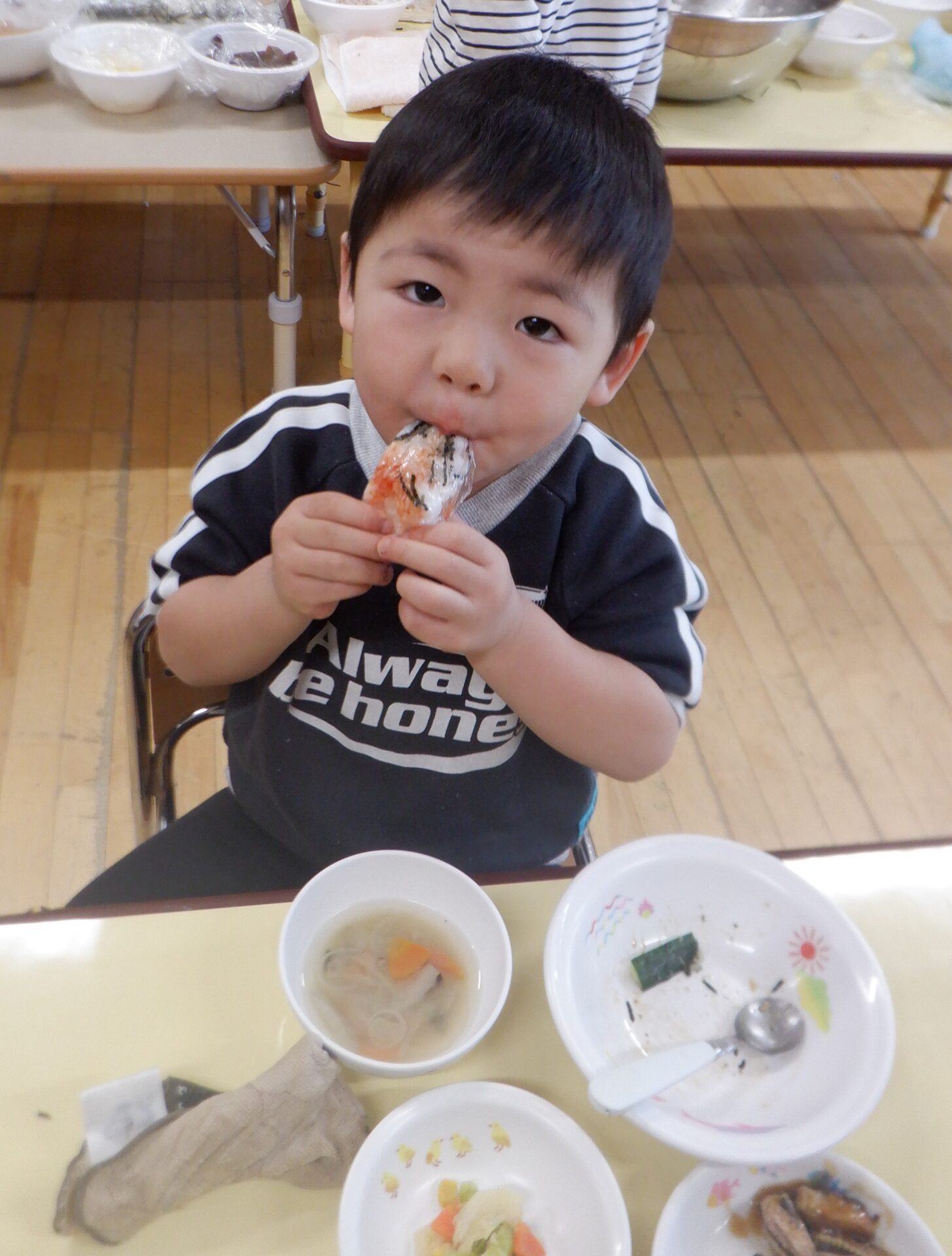 自分の席に座ると海苔巻きを両手にもって大きなお口を開けてパクッ!!