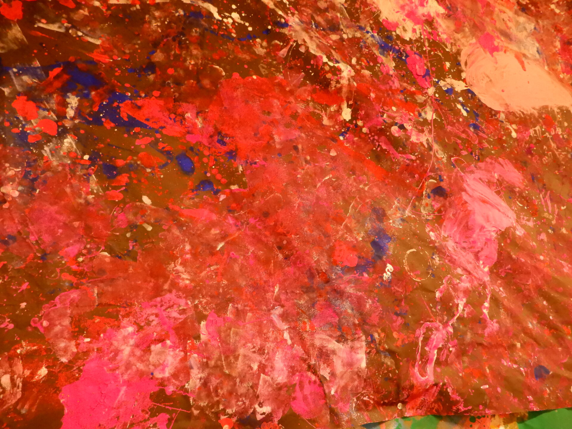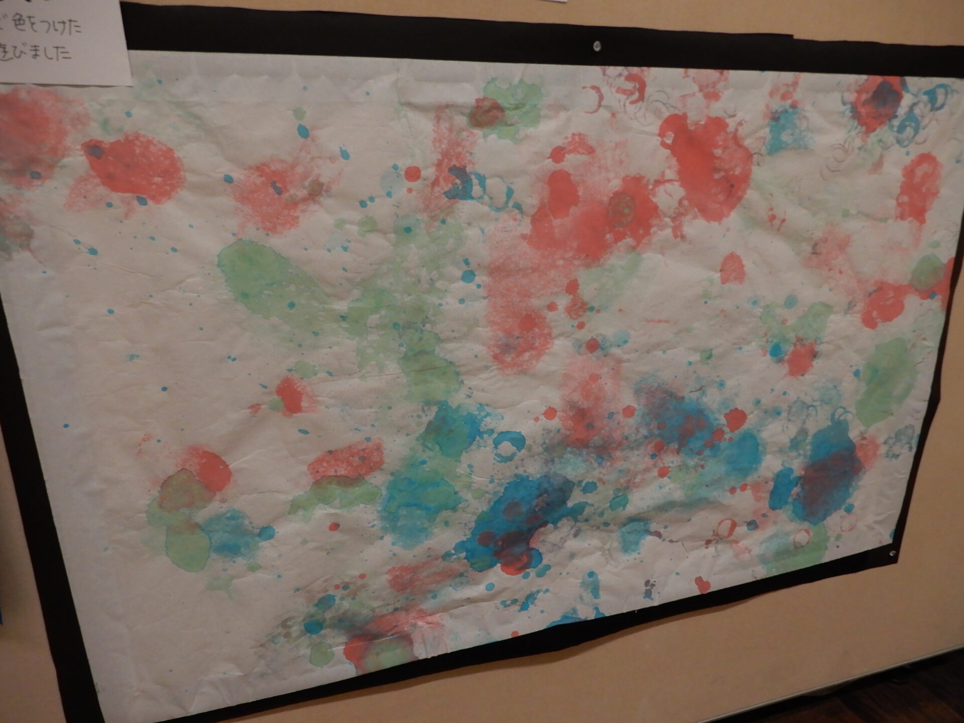 部屋中にどこに絵の具が飛んでも大丈夫なようにビニールシートを張っての絵の具遊びです。