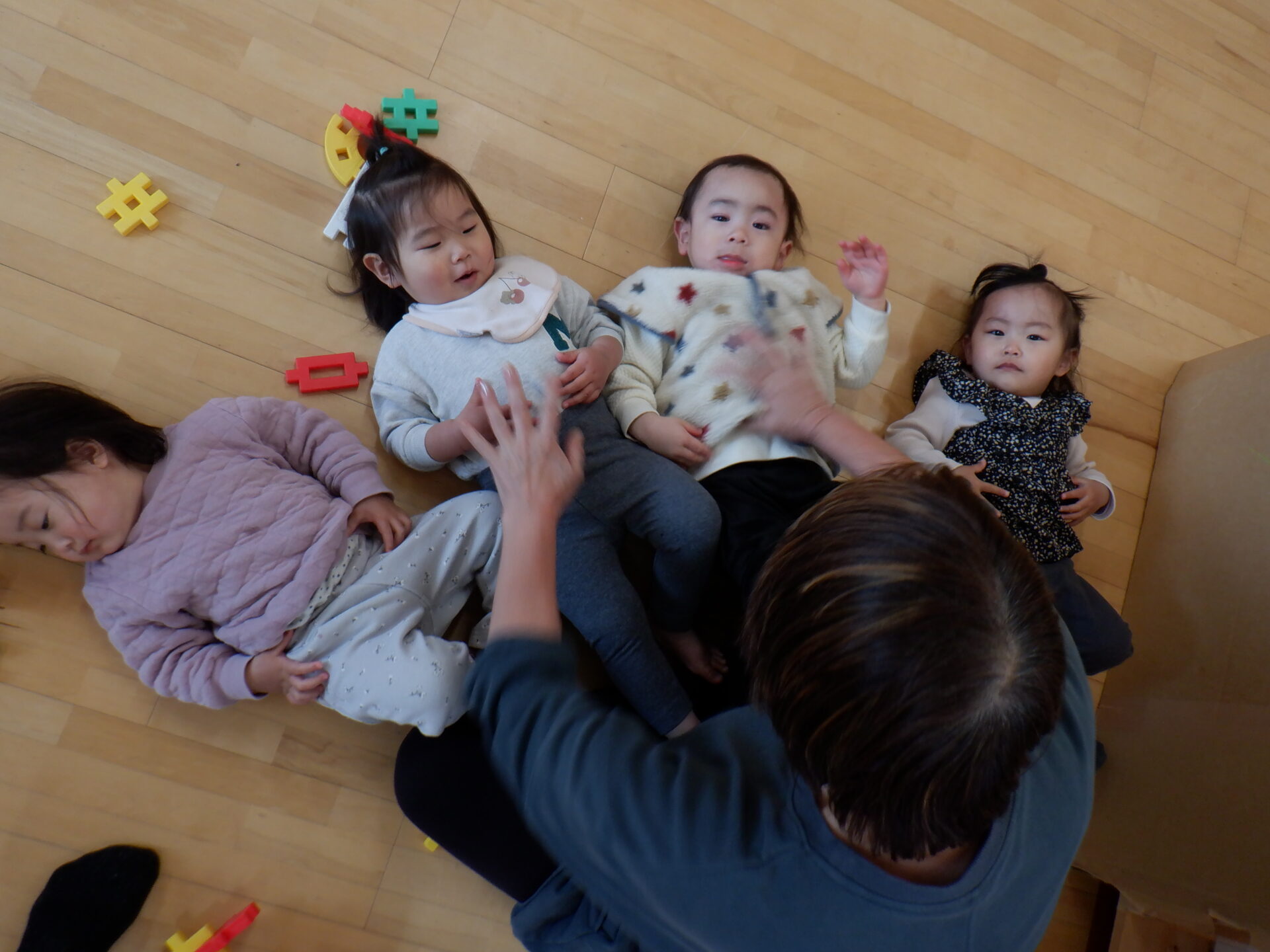 子どもたちが集まってきて、保育士の前にごろり。
