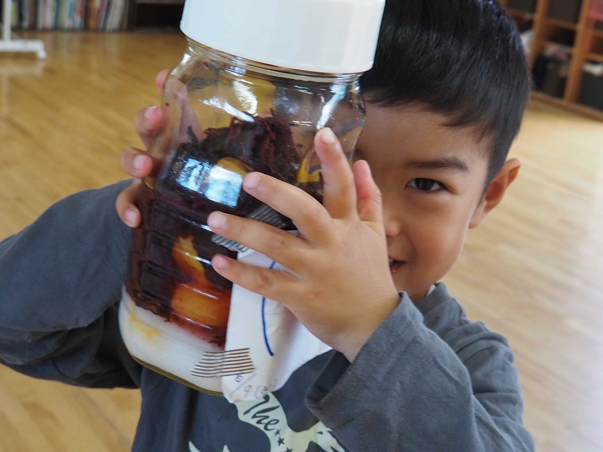「すっぱい」 「これに買ってきたシソを入れると梅干しできるかな?」と
