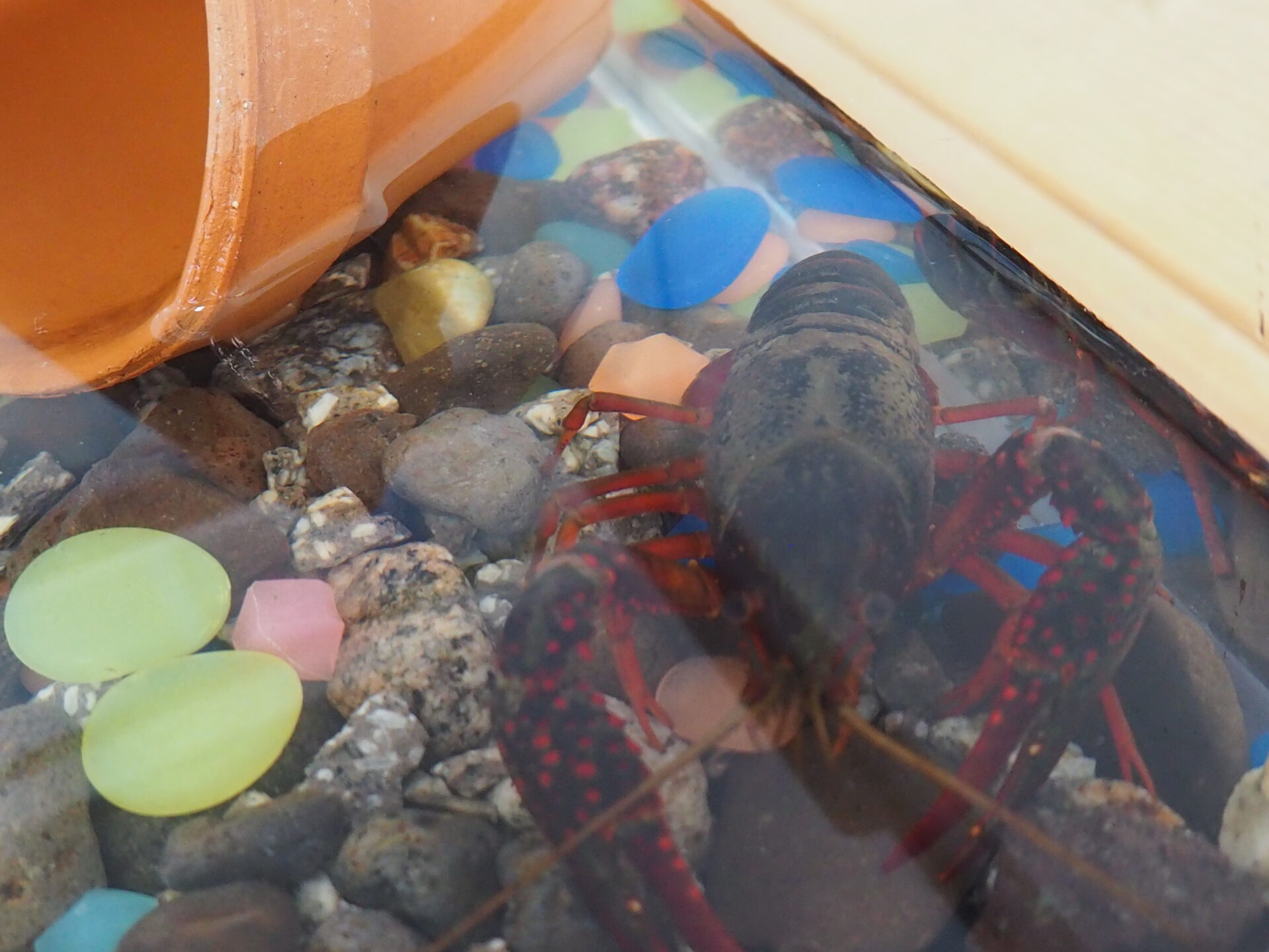僕たち、ザリガニ・金魚・どじょう・川エビ・スジエビが元気に過ごしています。