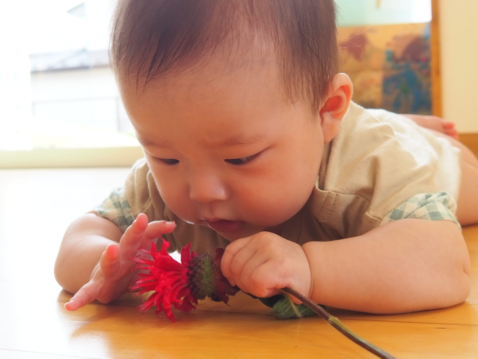 「はじめまして。こんにちは。」とでも語っているかのような0歳児と生花の出会いです。