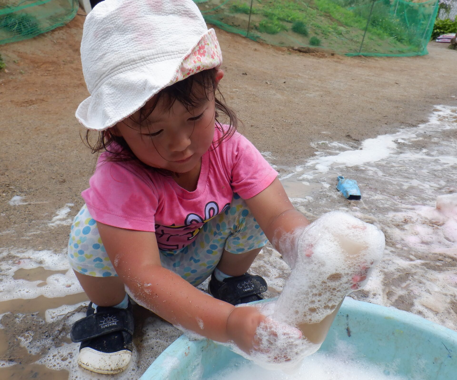 梅雨の晴れ間に、園庭で3・4歳児さんが