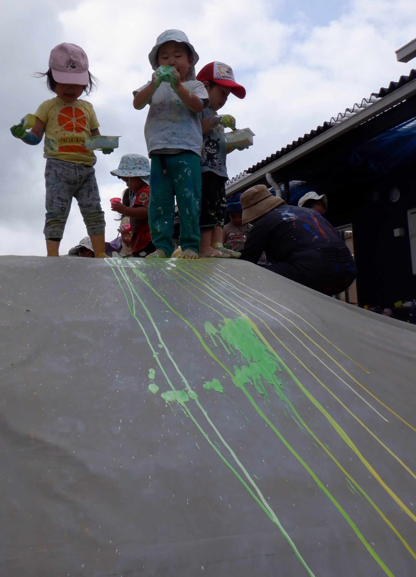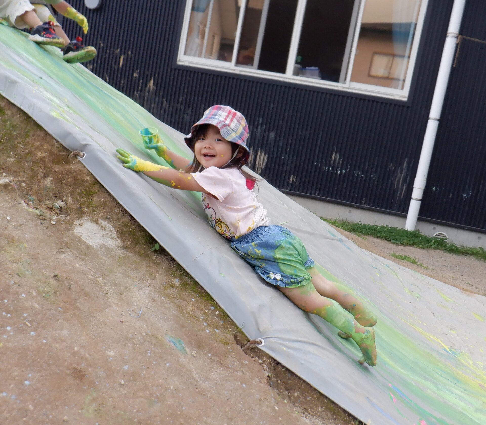 更に楽しくなってきた子どもたちの目についたのは築山の滑り台のシート。