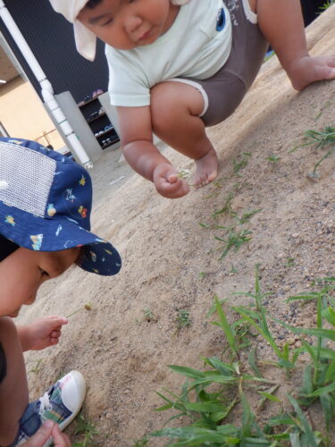しずく組(1歳児)がみ込んでじーっと何かを観察していました。