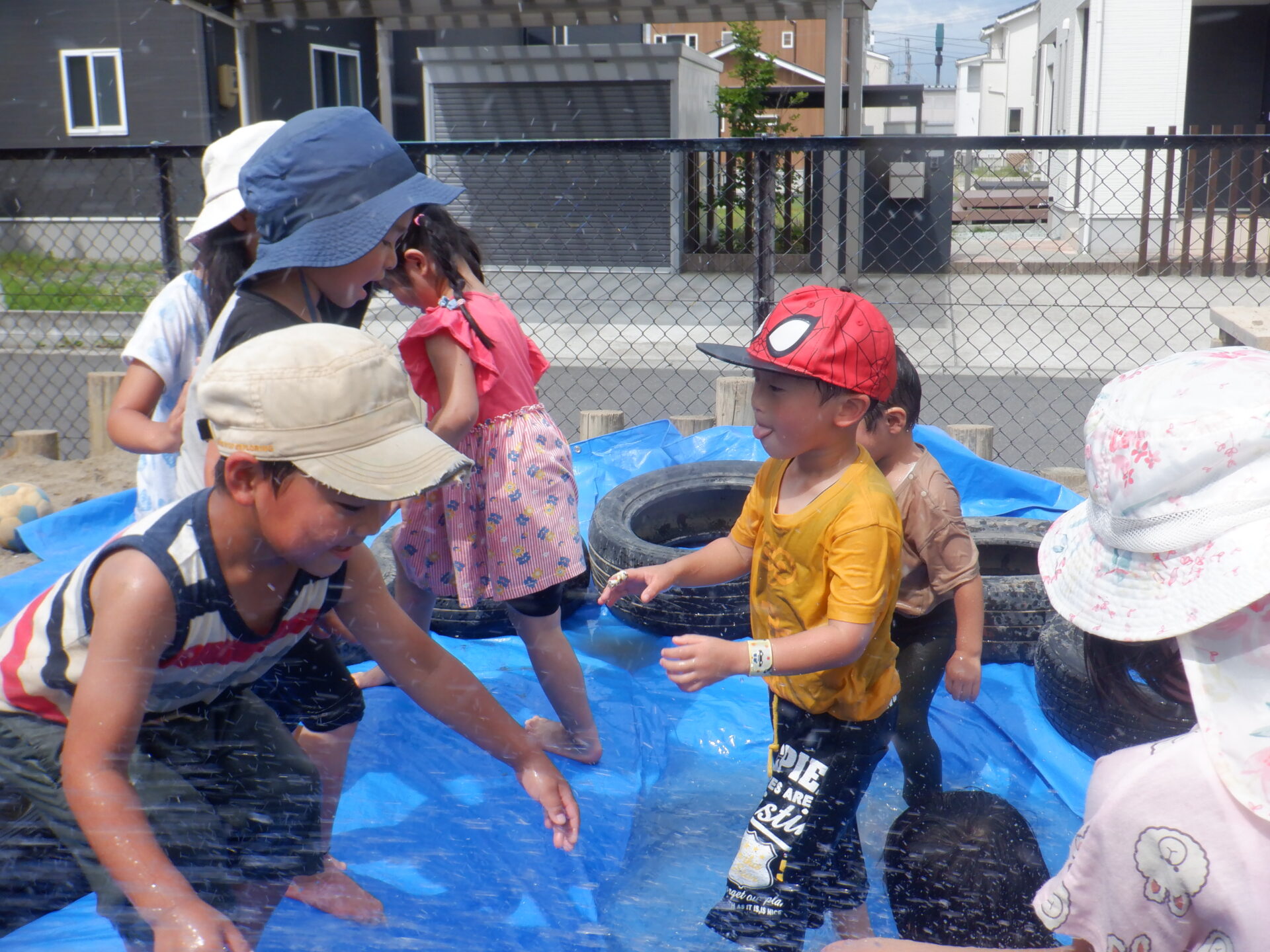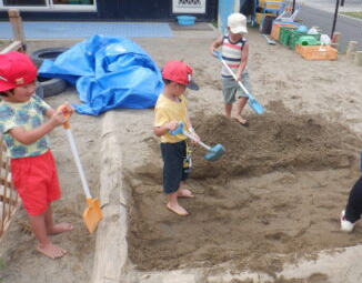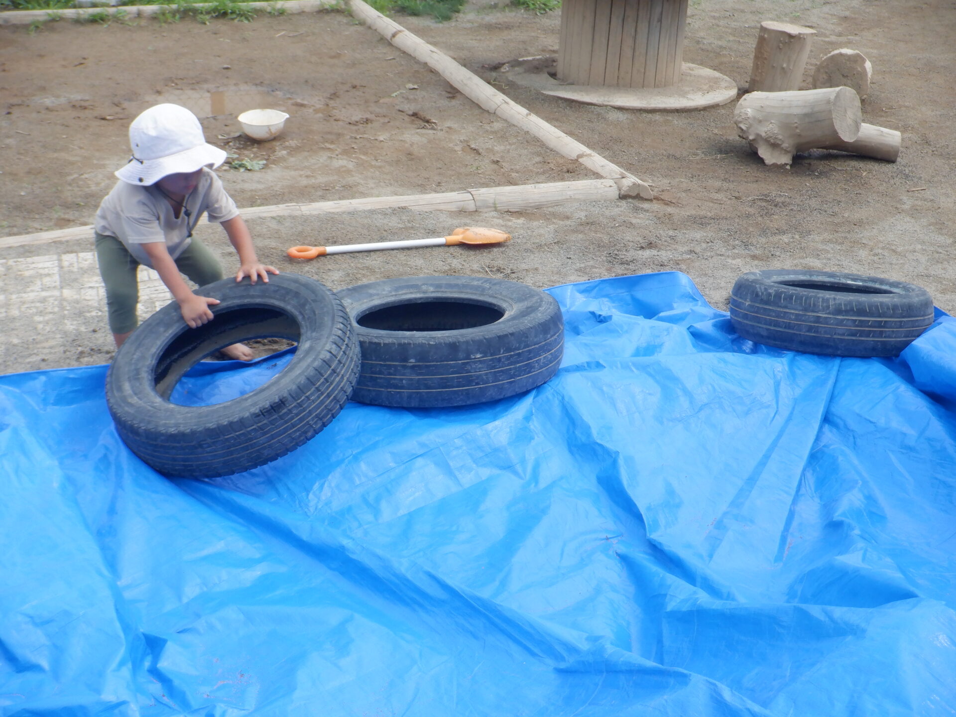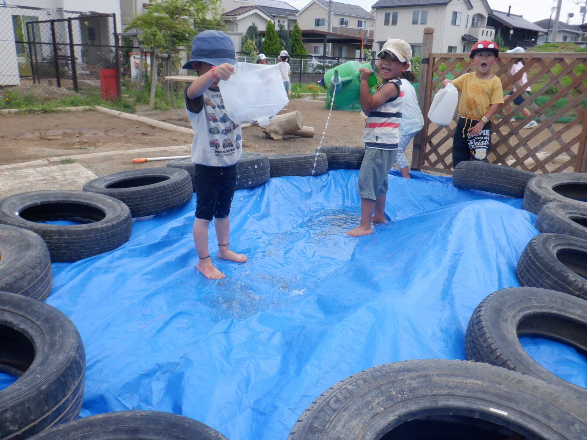 「プールに入りたい!」…そんな言葉が聞かれたにじ組さん(4歳児)。でも、園にプールがない事を伝えると、「じゃあ、作ればいいじゃん!」と早速プールづくりに取り掛かります。