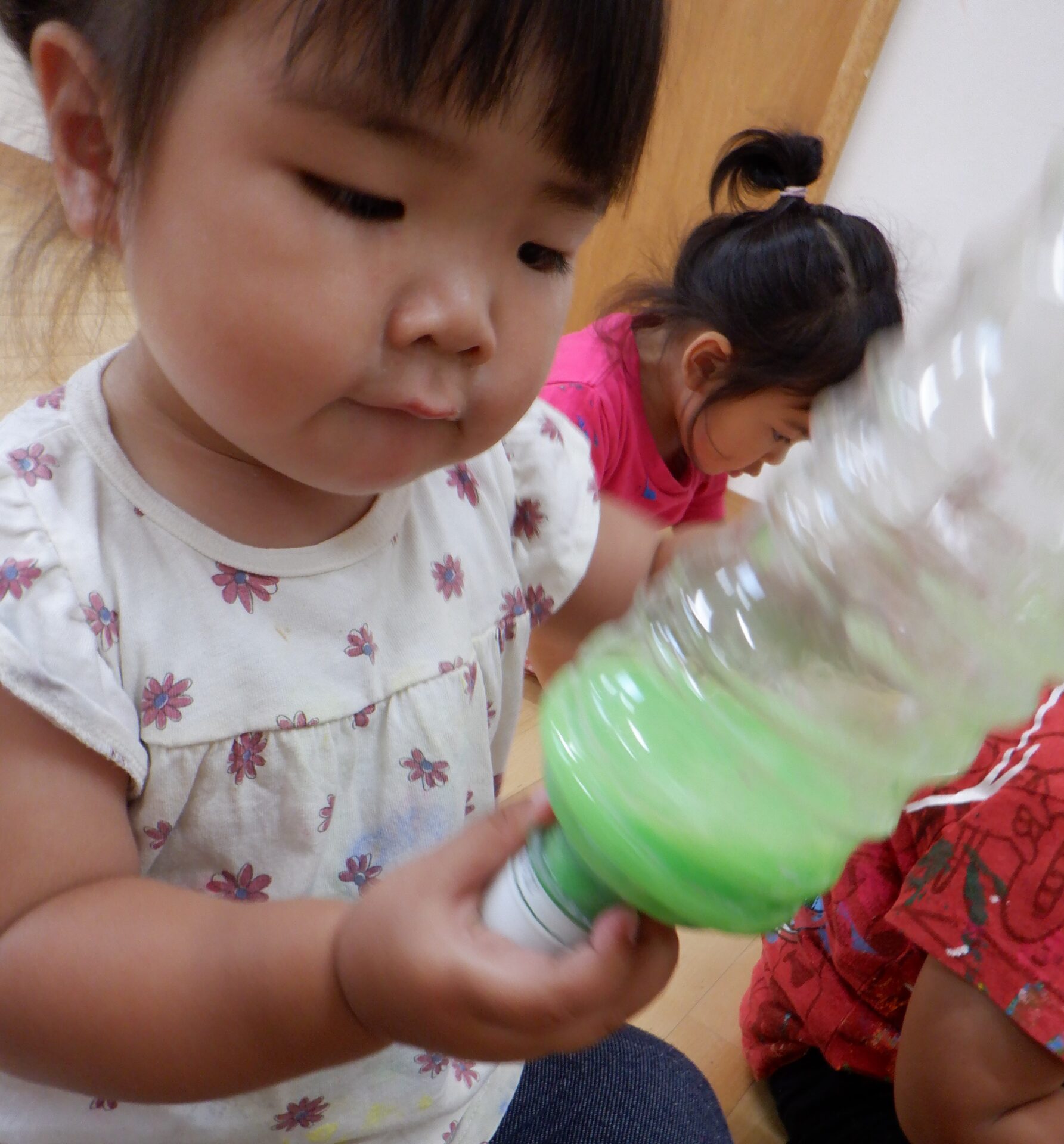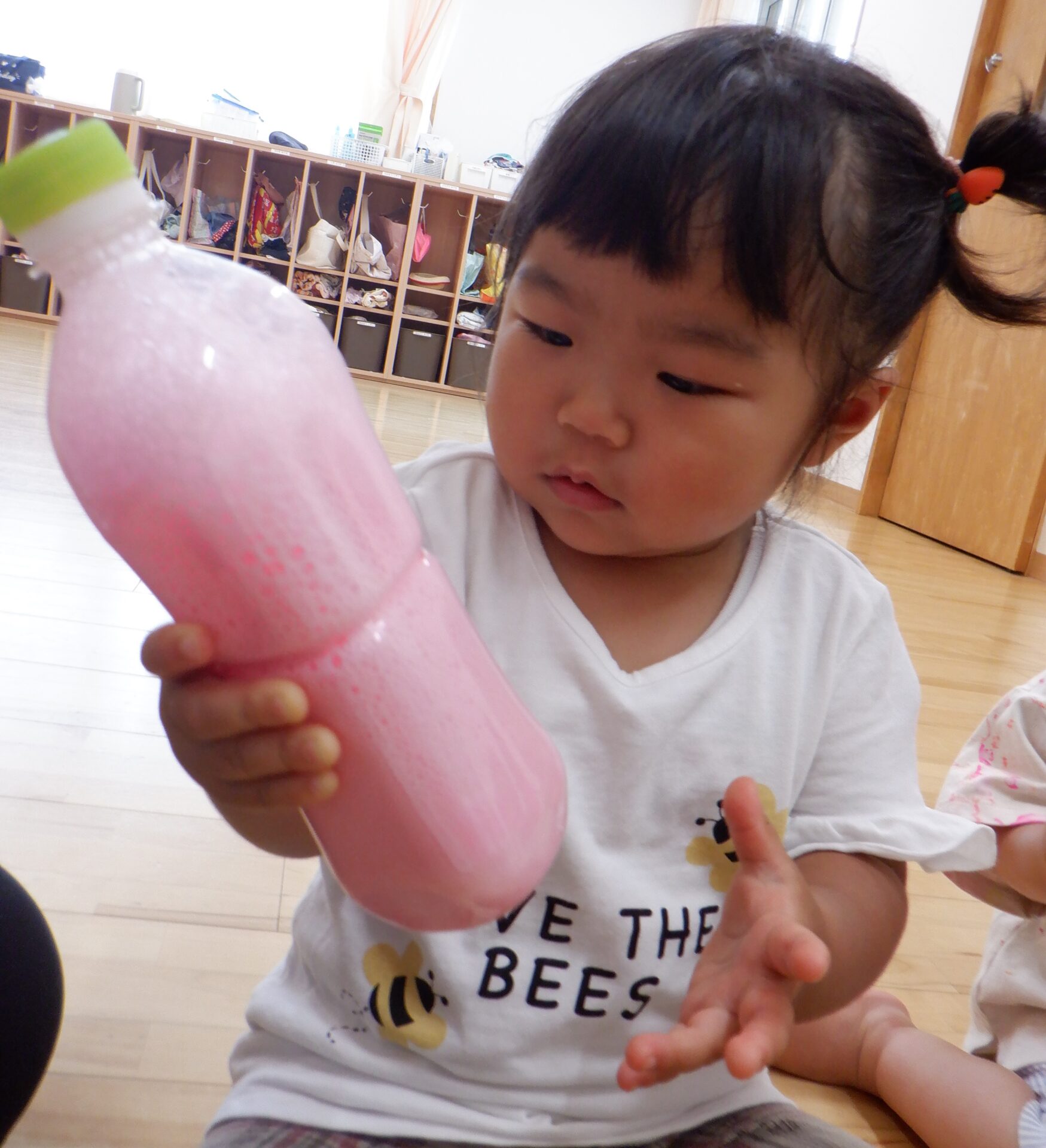言葉が話せるようになったお友達のなかには色水を見て「あか」「みどり」など覚えた色の名前を保育者に教えてくれたりもしました。