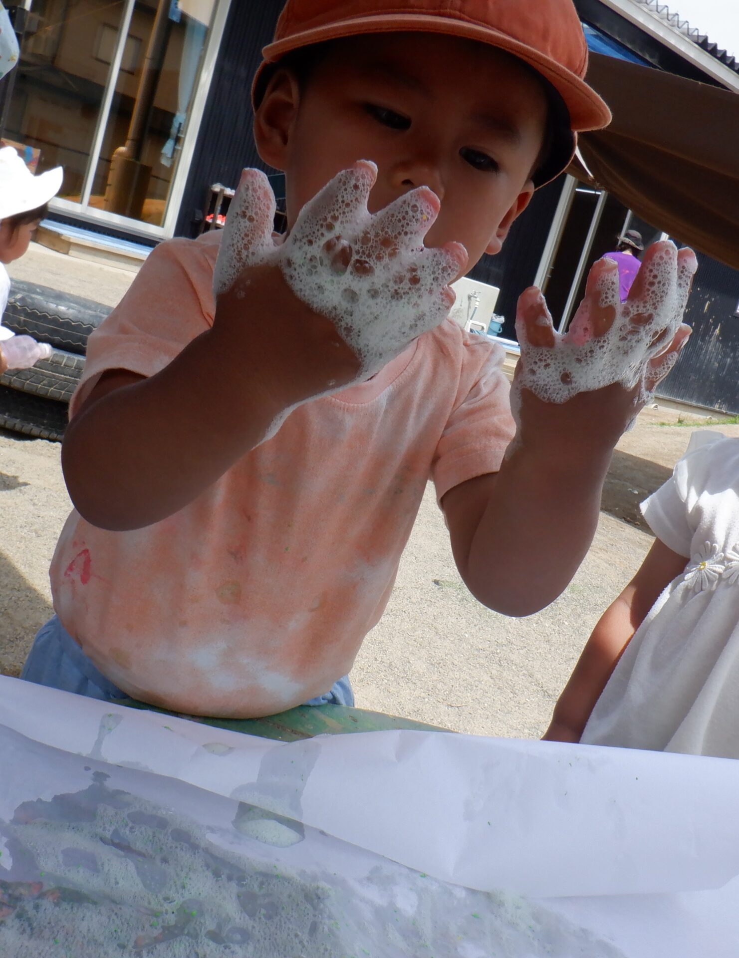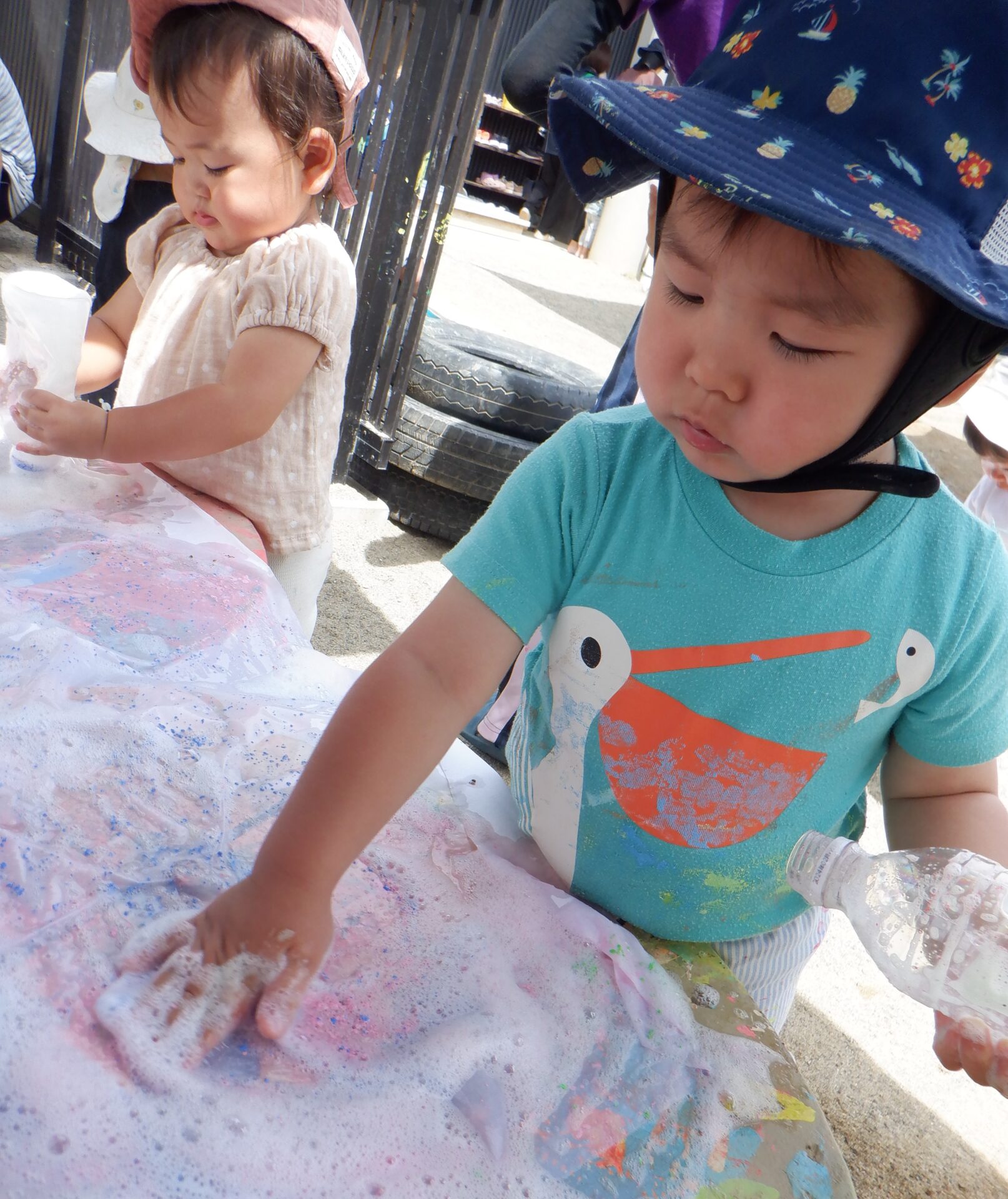 しずく組(1歳児)では、泡あそびをしました。