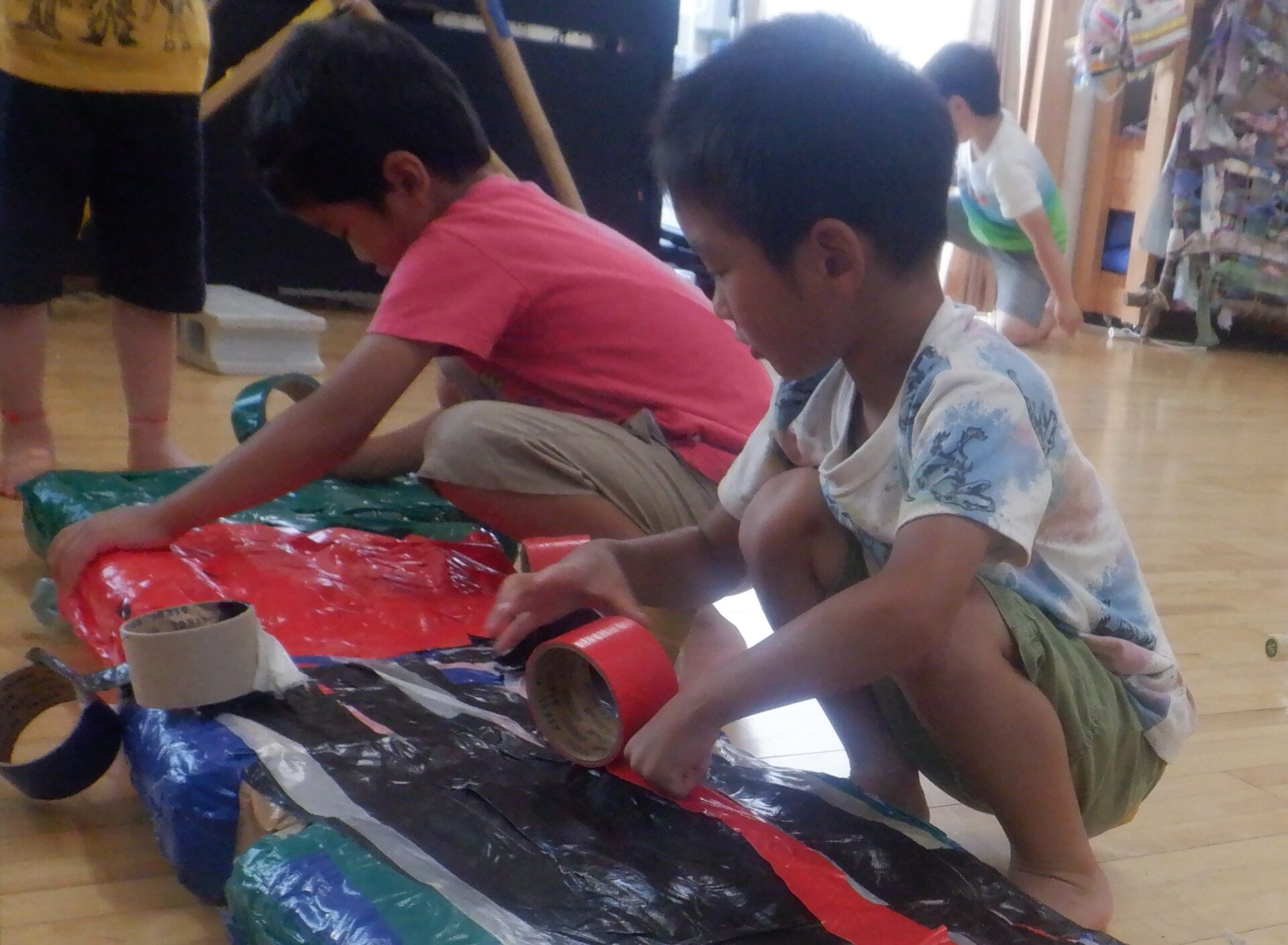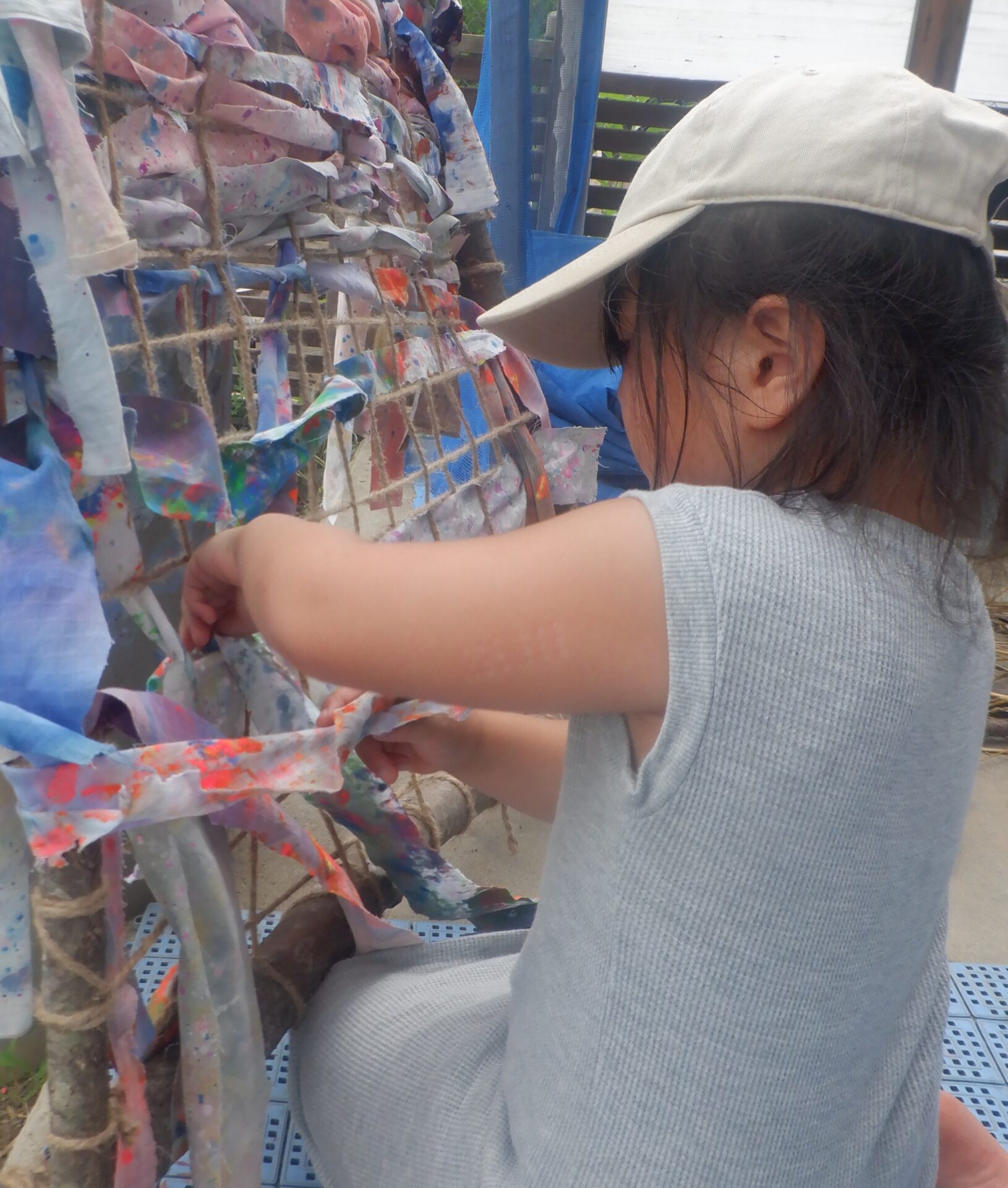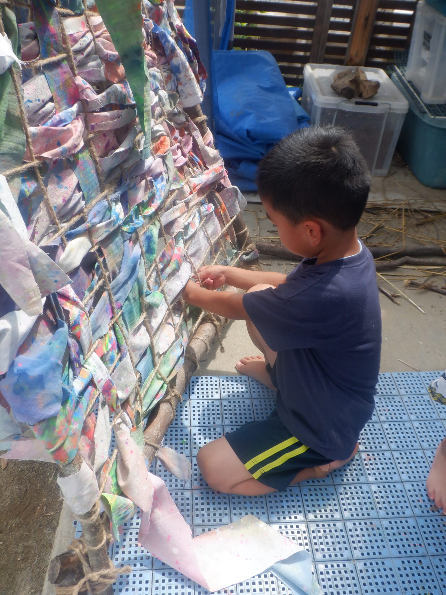 こちらはカラフルな布を使って何やら制作中。