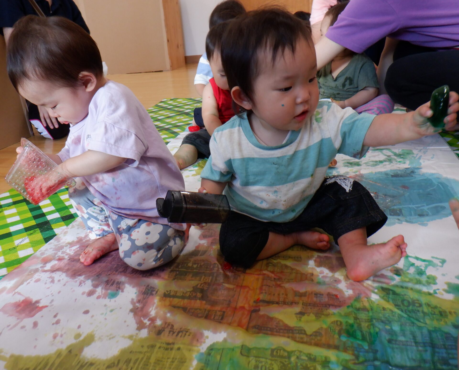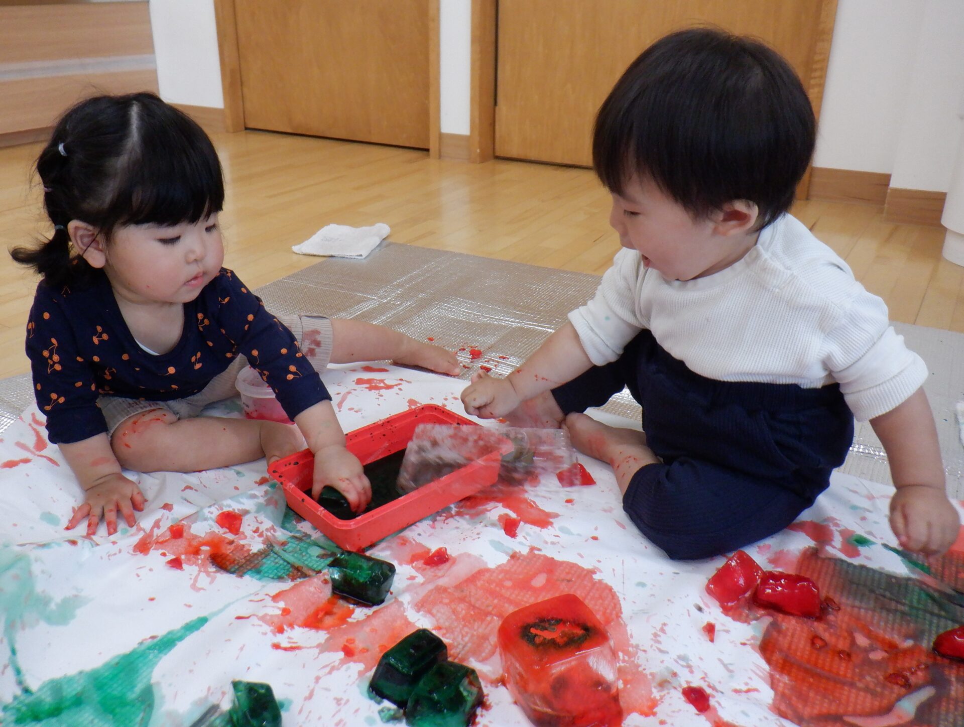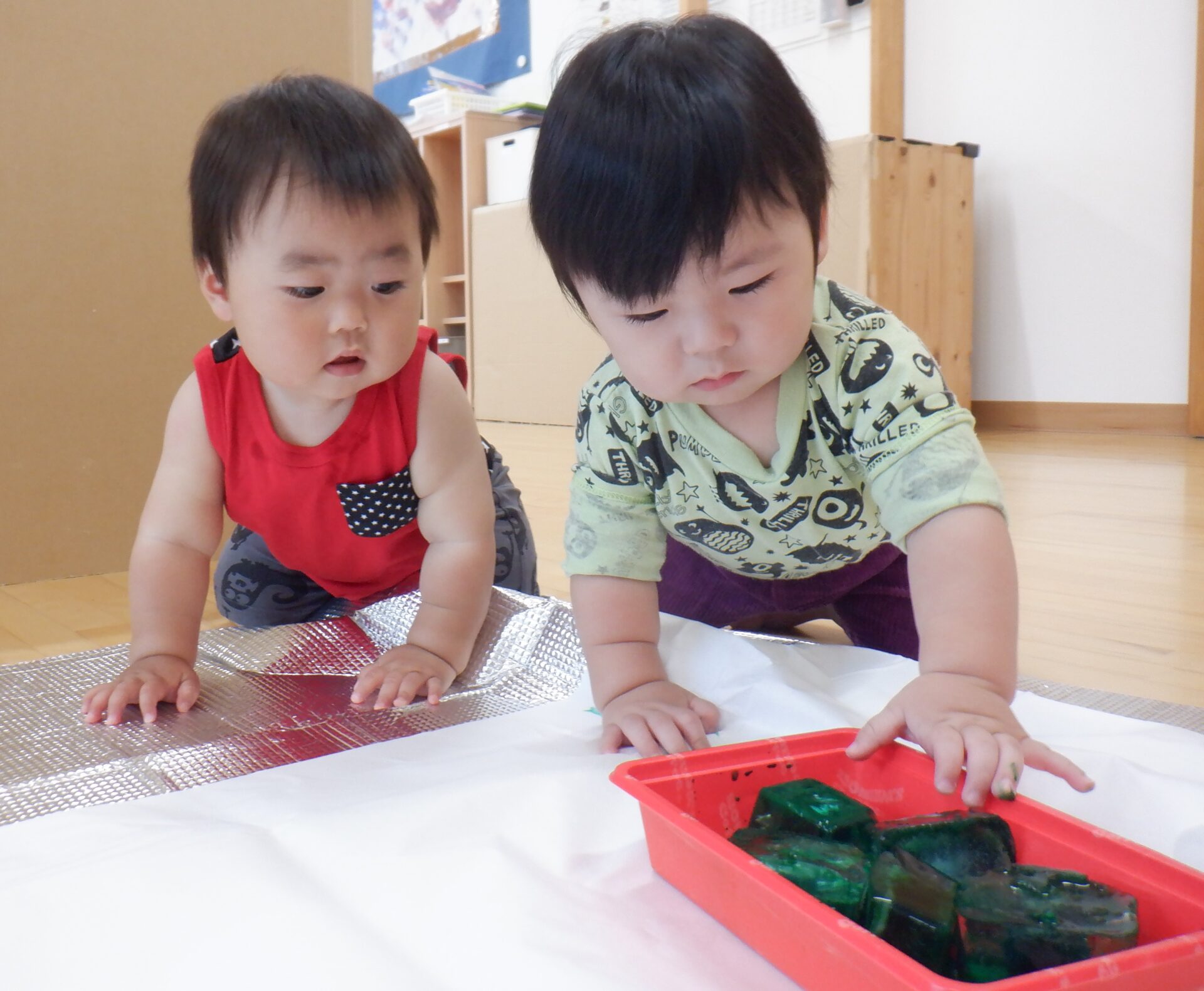 あい組(0歳児)では、色をつけた氷で遊びました。