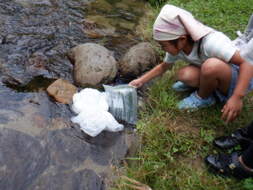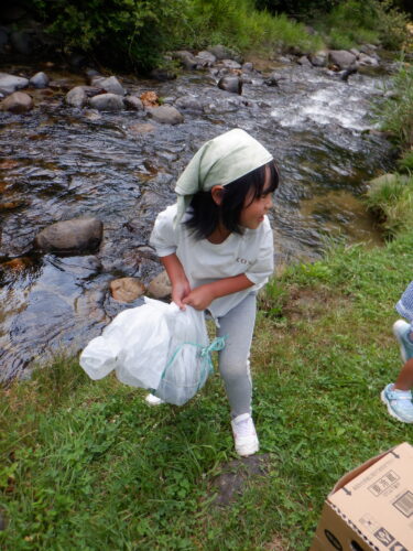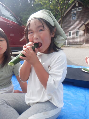 川で冷やしていた重いスイカときゅうりも、お友だちと力を合わせて運びます。