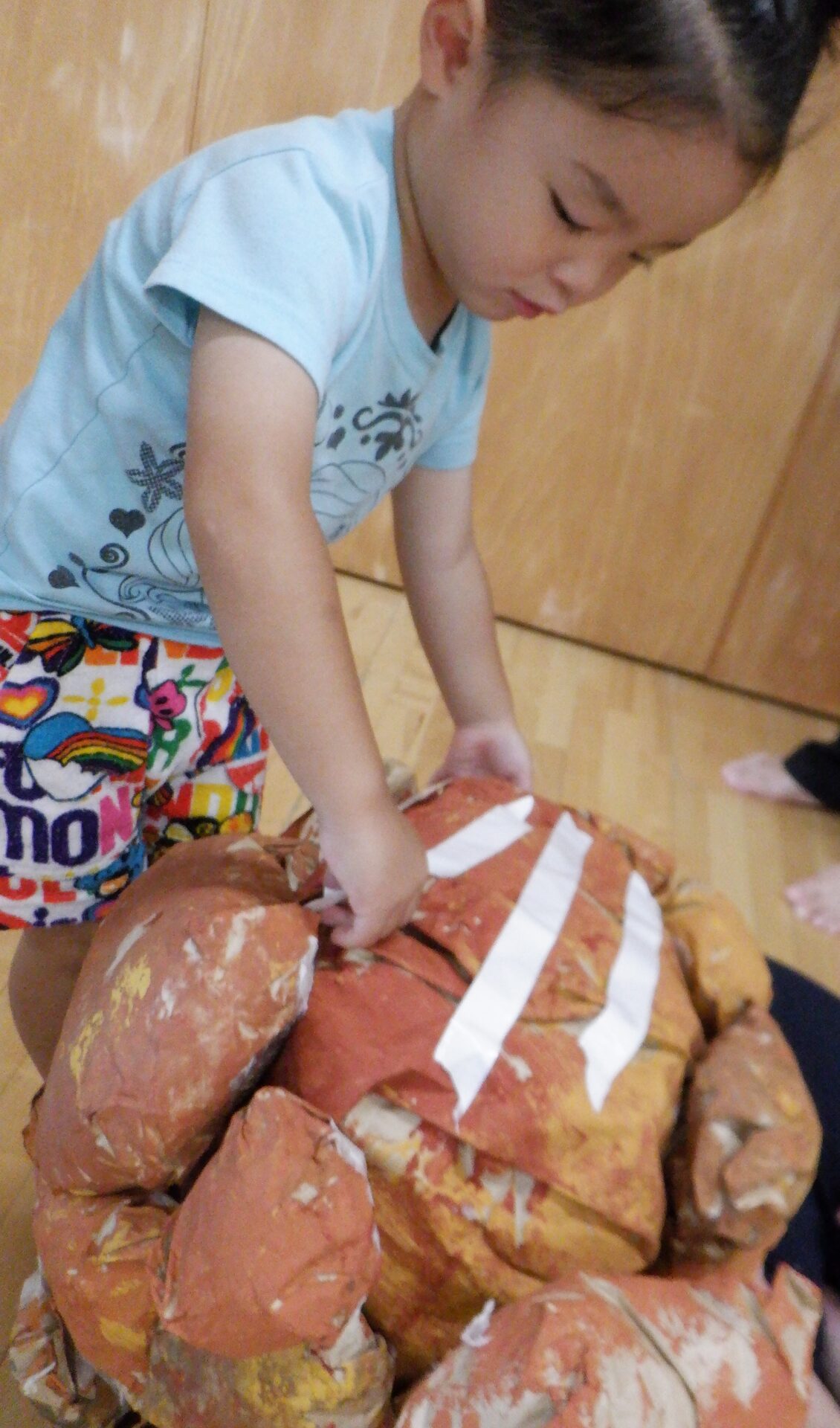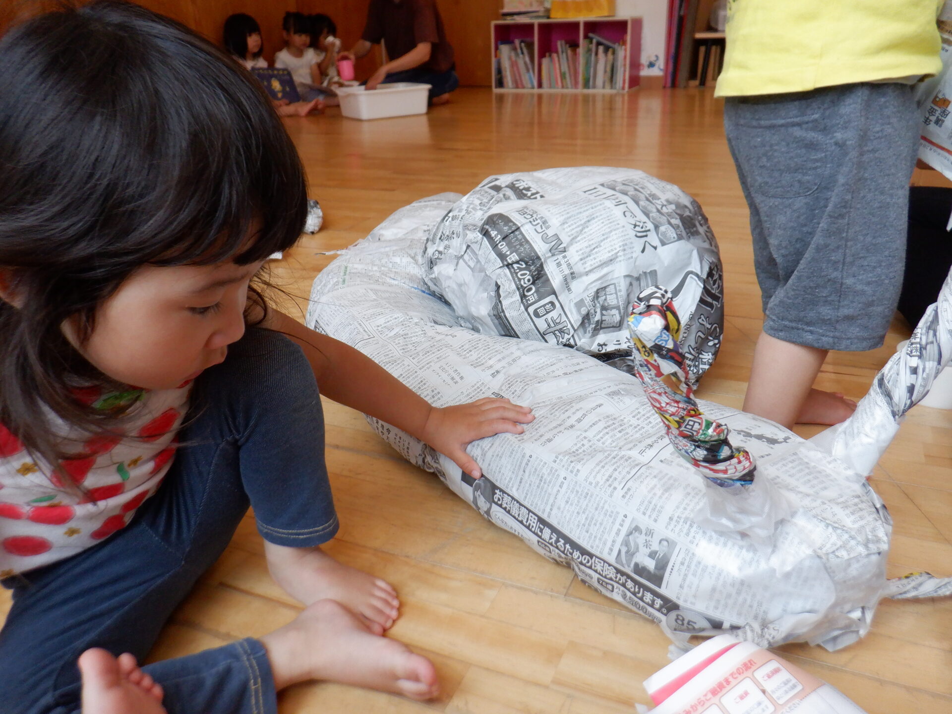 新聞紙をギュッギュッと丸めて形を作っていきます。一生懸命新聞紙を丸めていました。