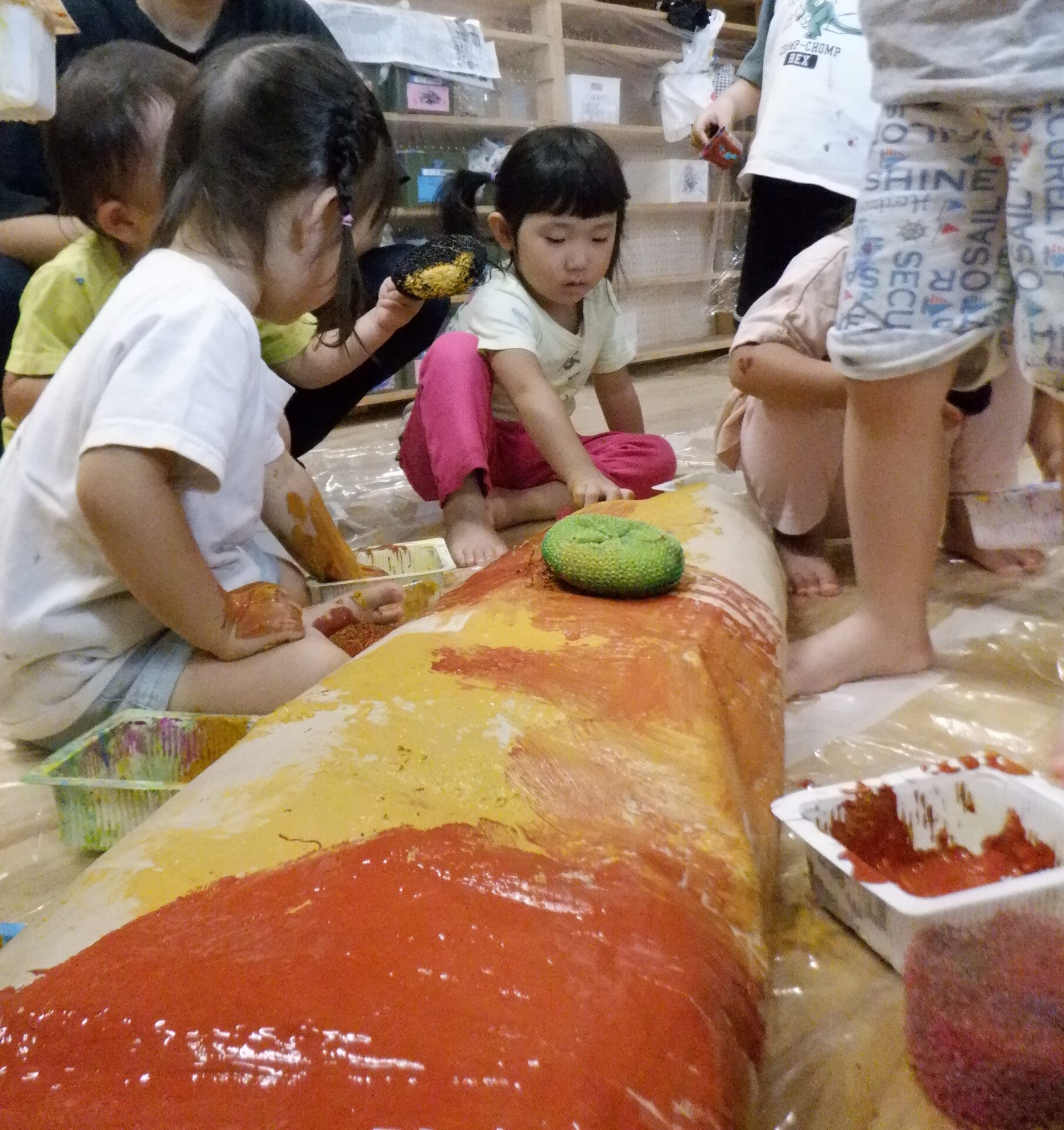 作ったカタツムリに色塗り開始!!手やスポンジを使ってペタペタと上手に色を塗っていきます。