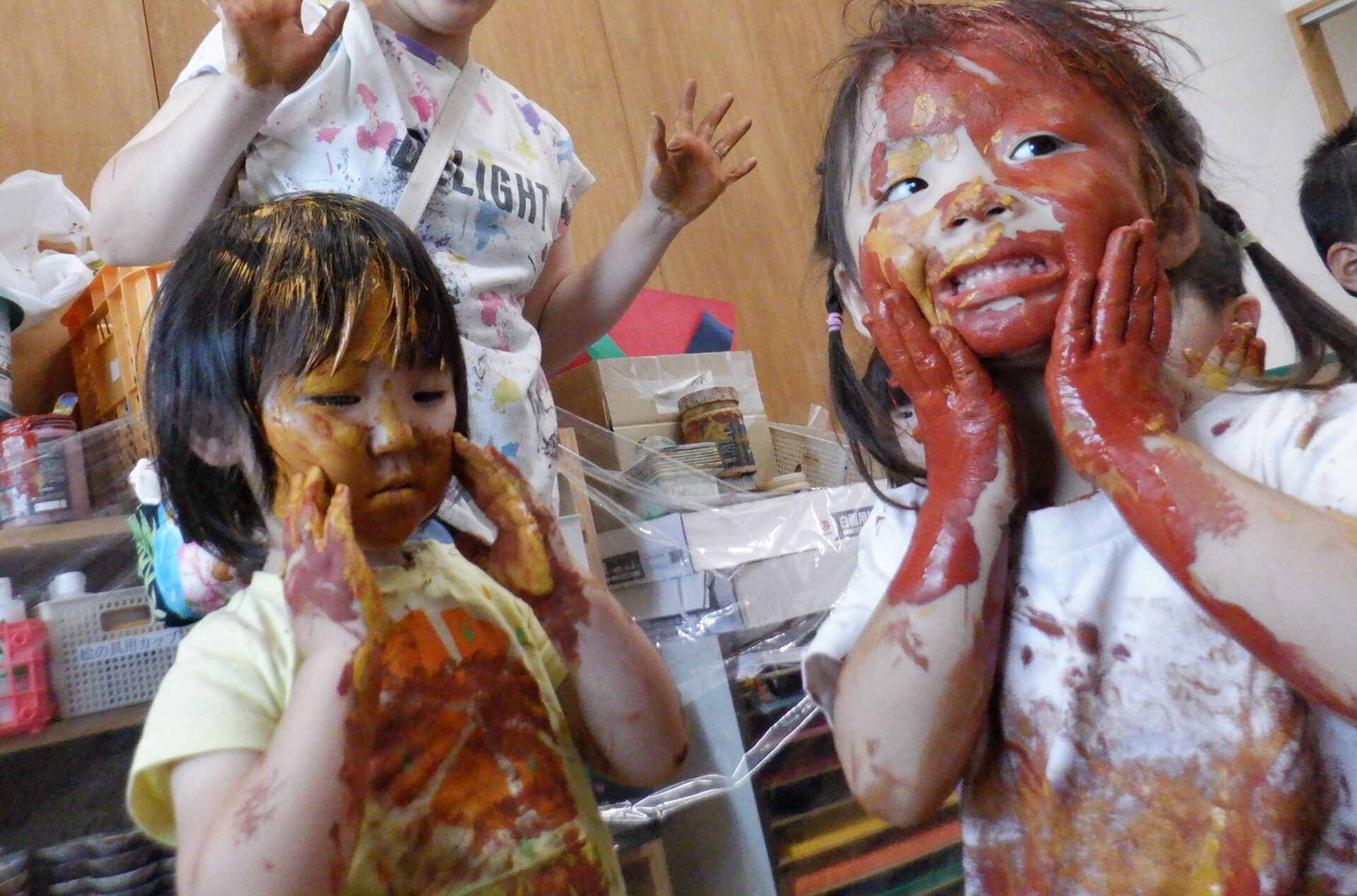 最後は自分の顔や手足にも絵の具をペタペタ・・・。