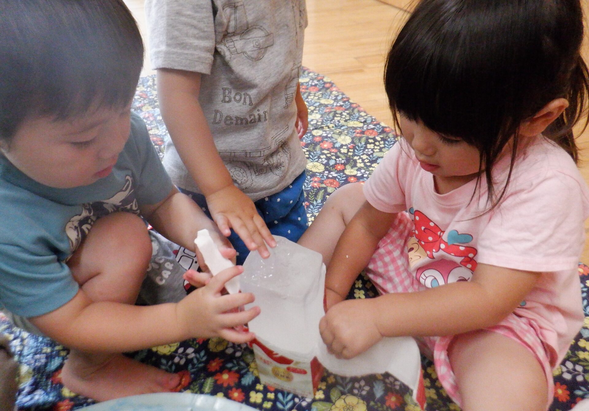 と興味津々の子どもたち。牛乳パックに触れてみると・・あれ?つめたい!?
