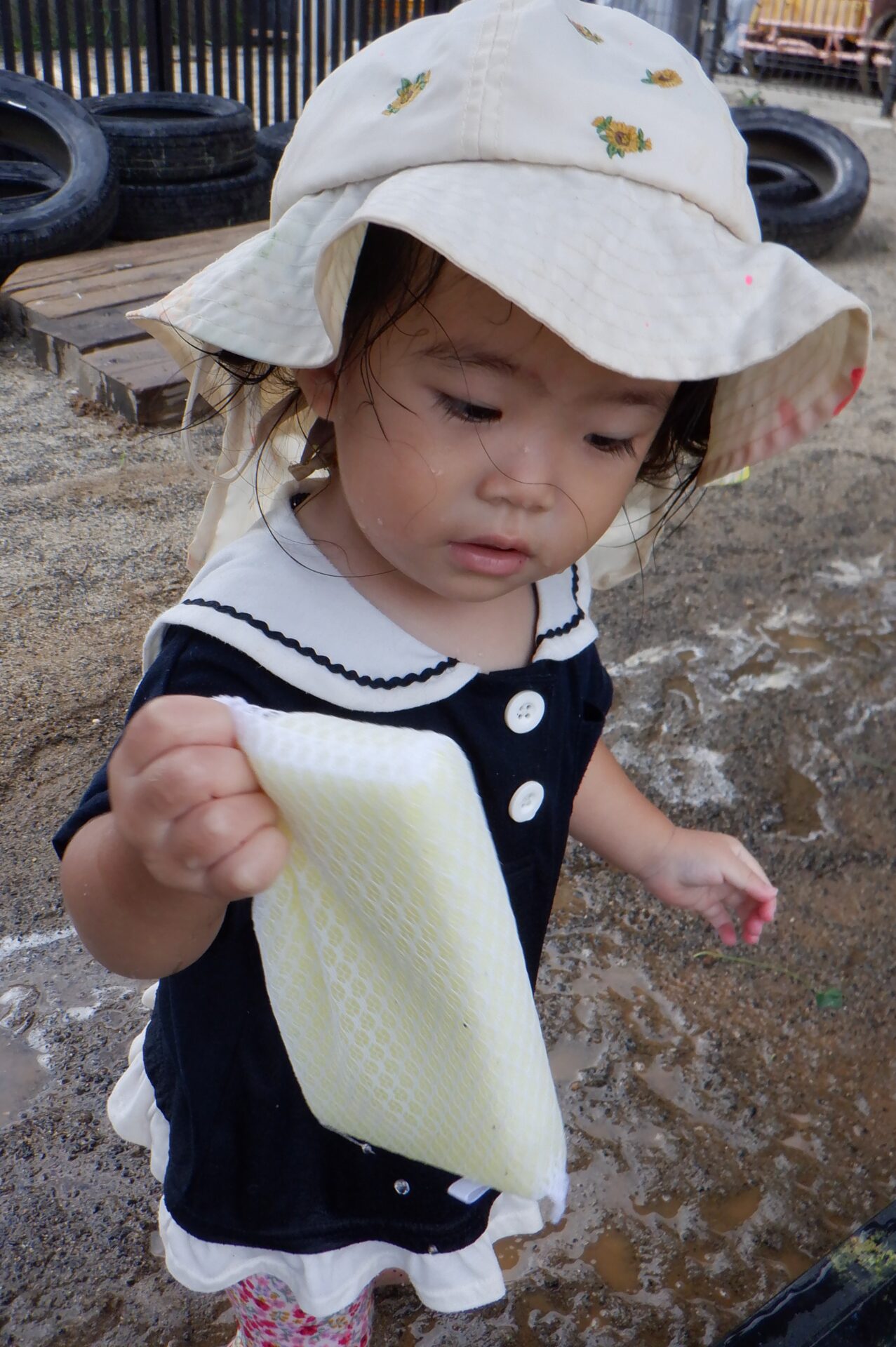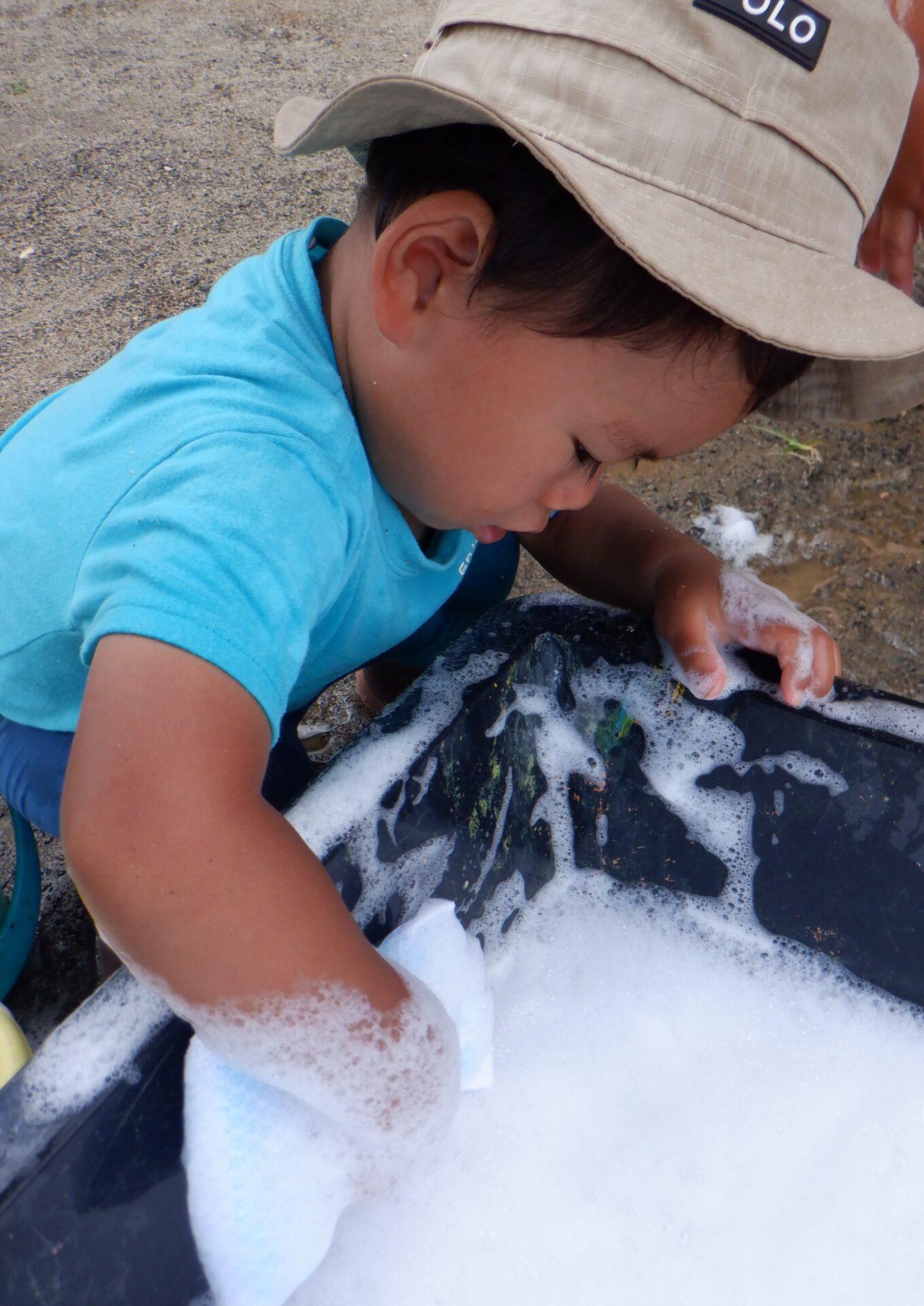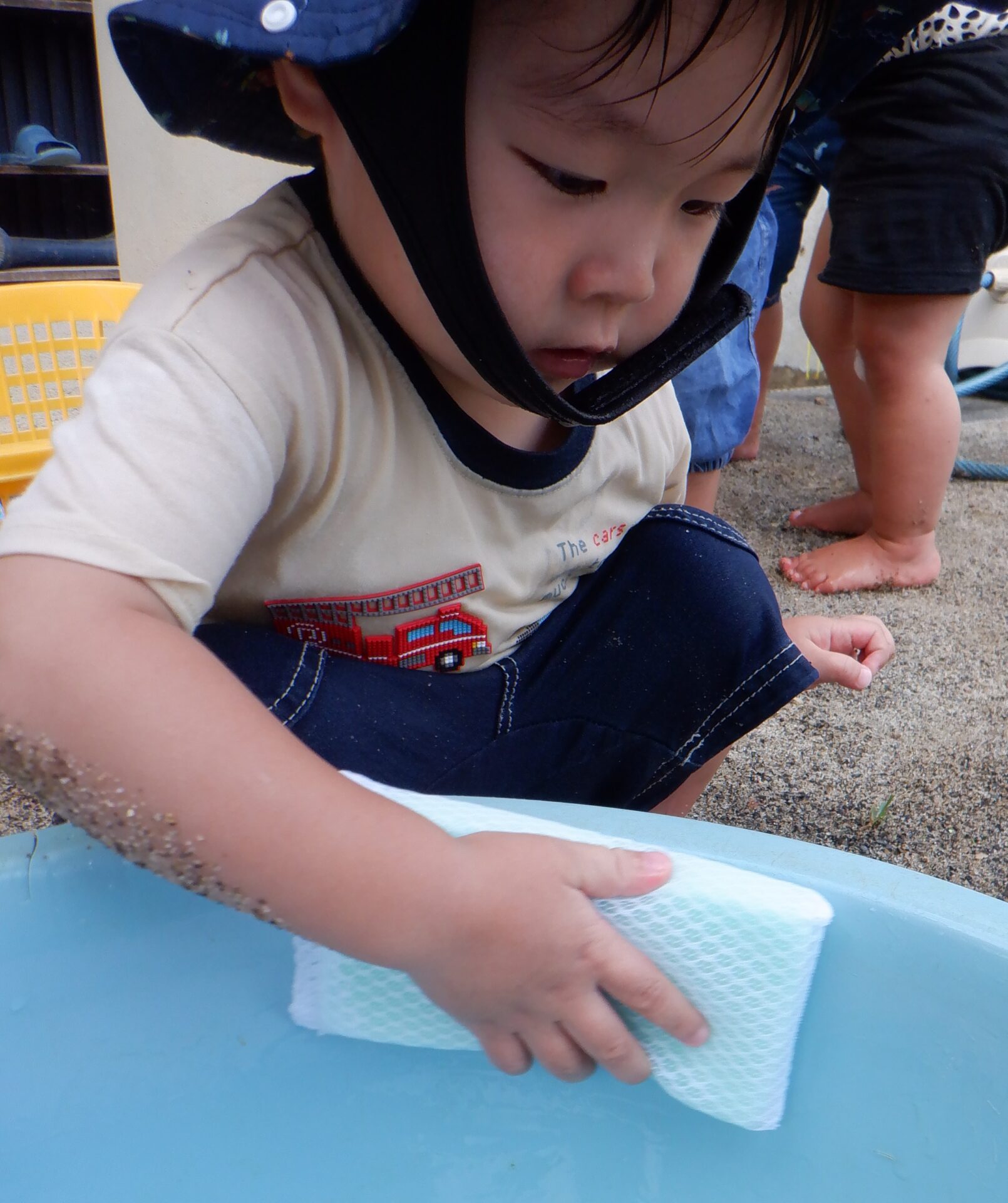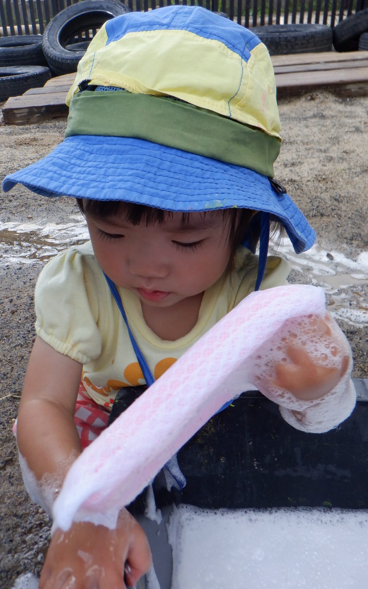 この日は、いつもの楽しい泡あそびに加えて、スポンジを使ってお掃除ごっこが始まりました!