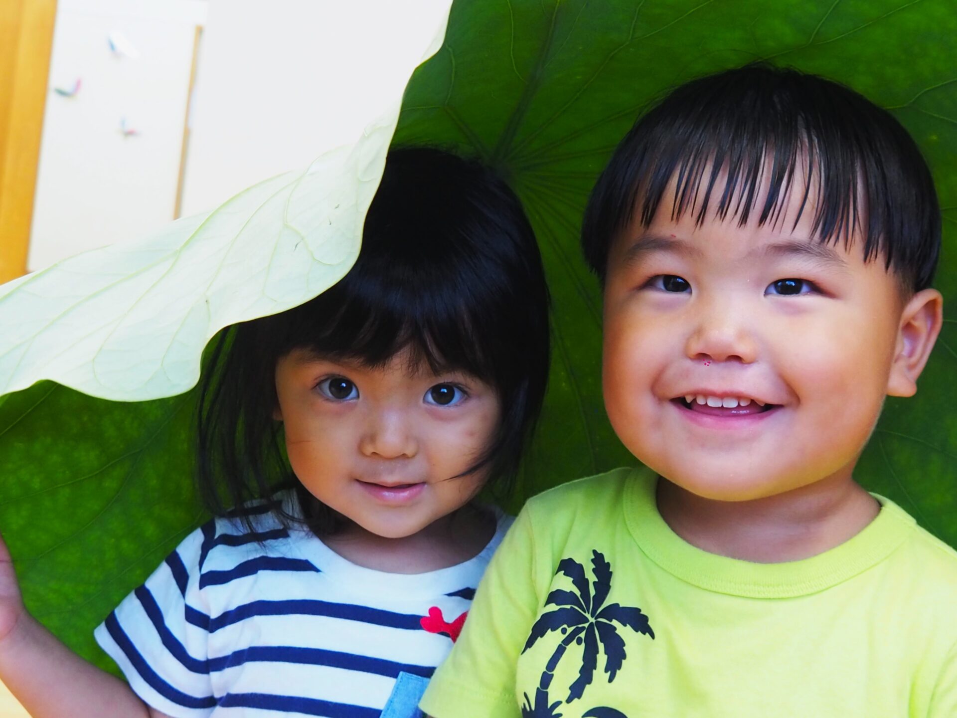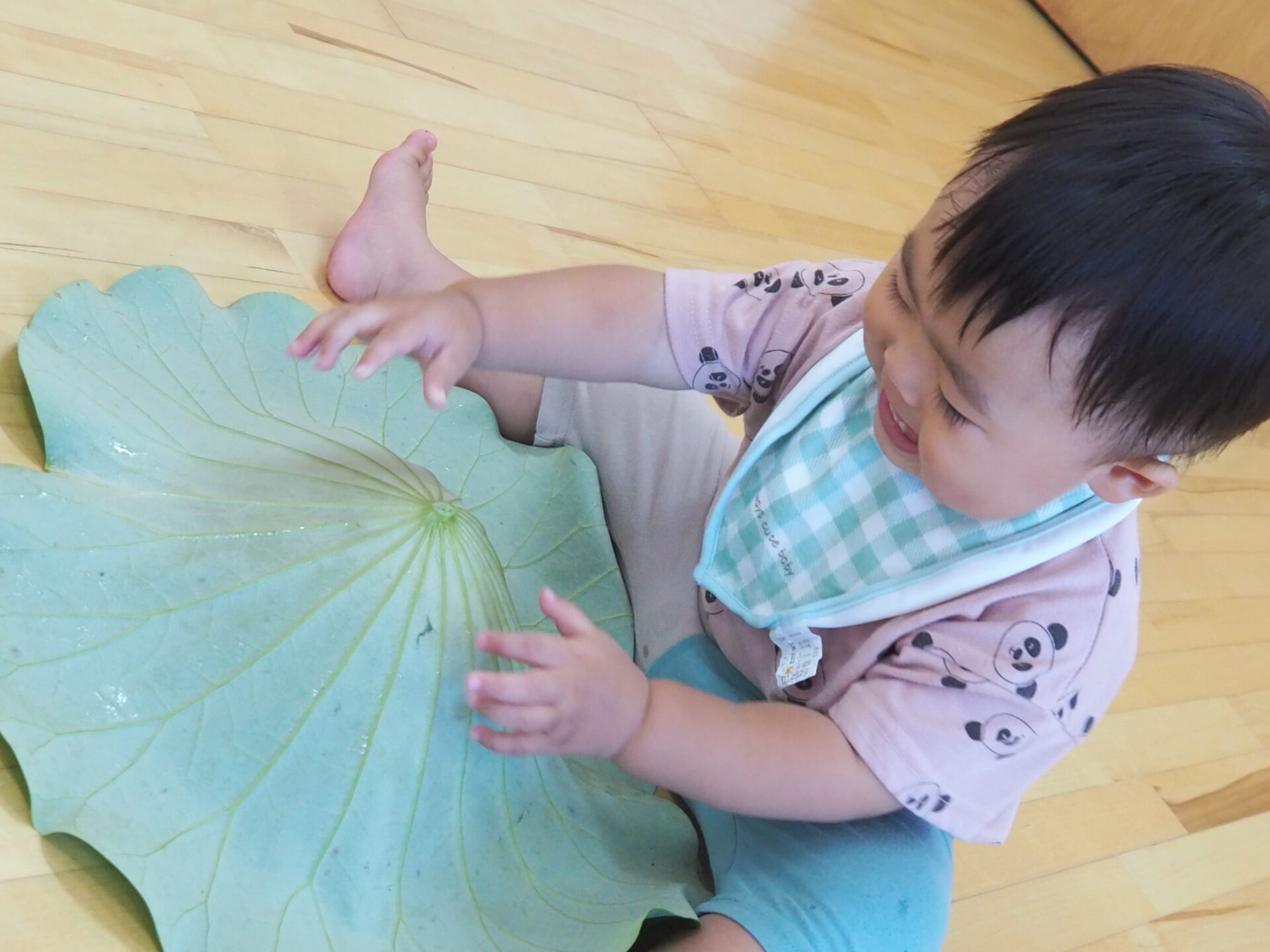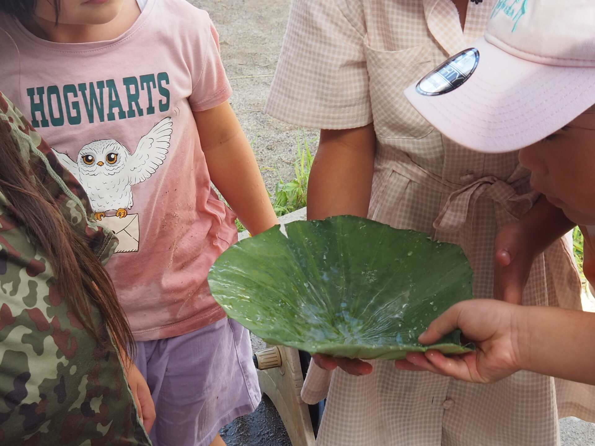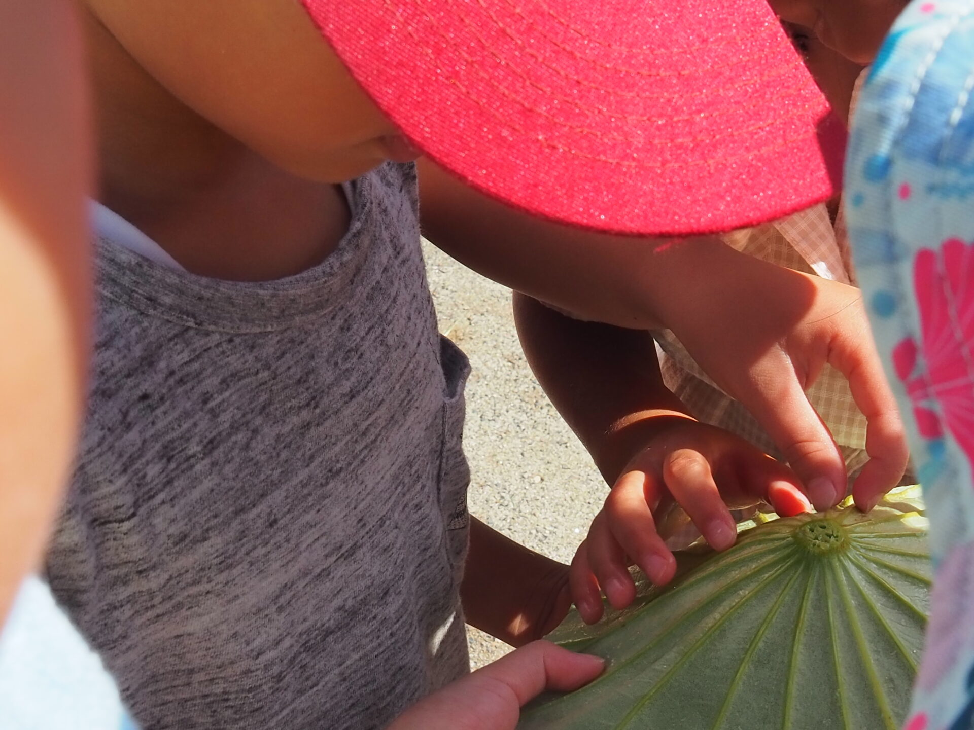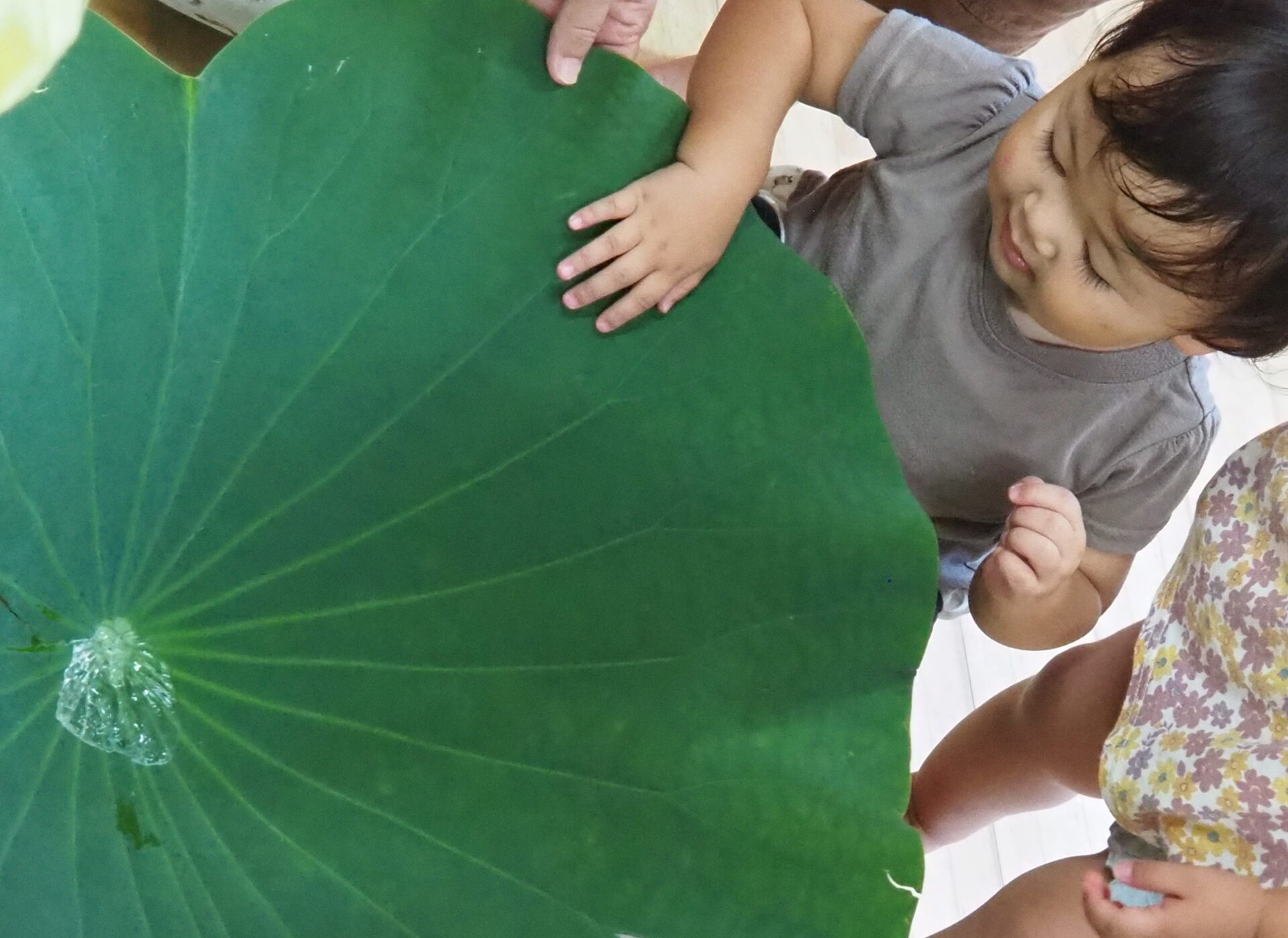人生初であろう巨大な蓮の葉に、小さいクラスの子ども達は驚きを隠せない様子です。