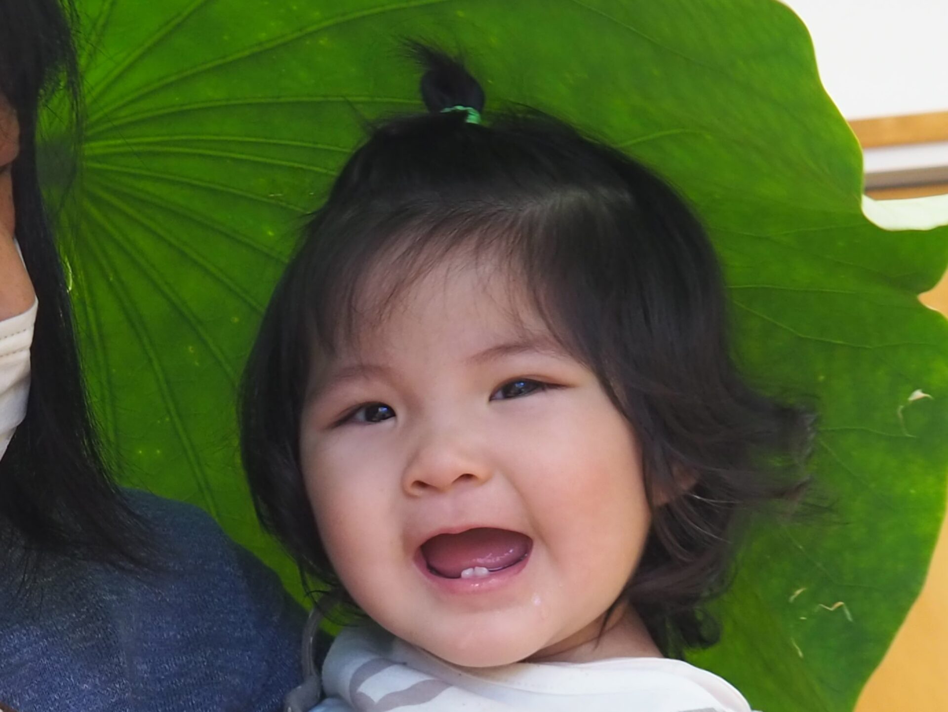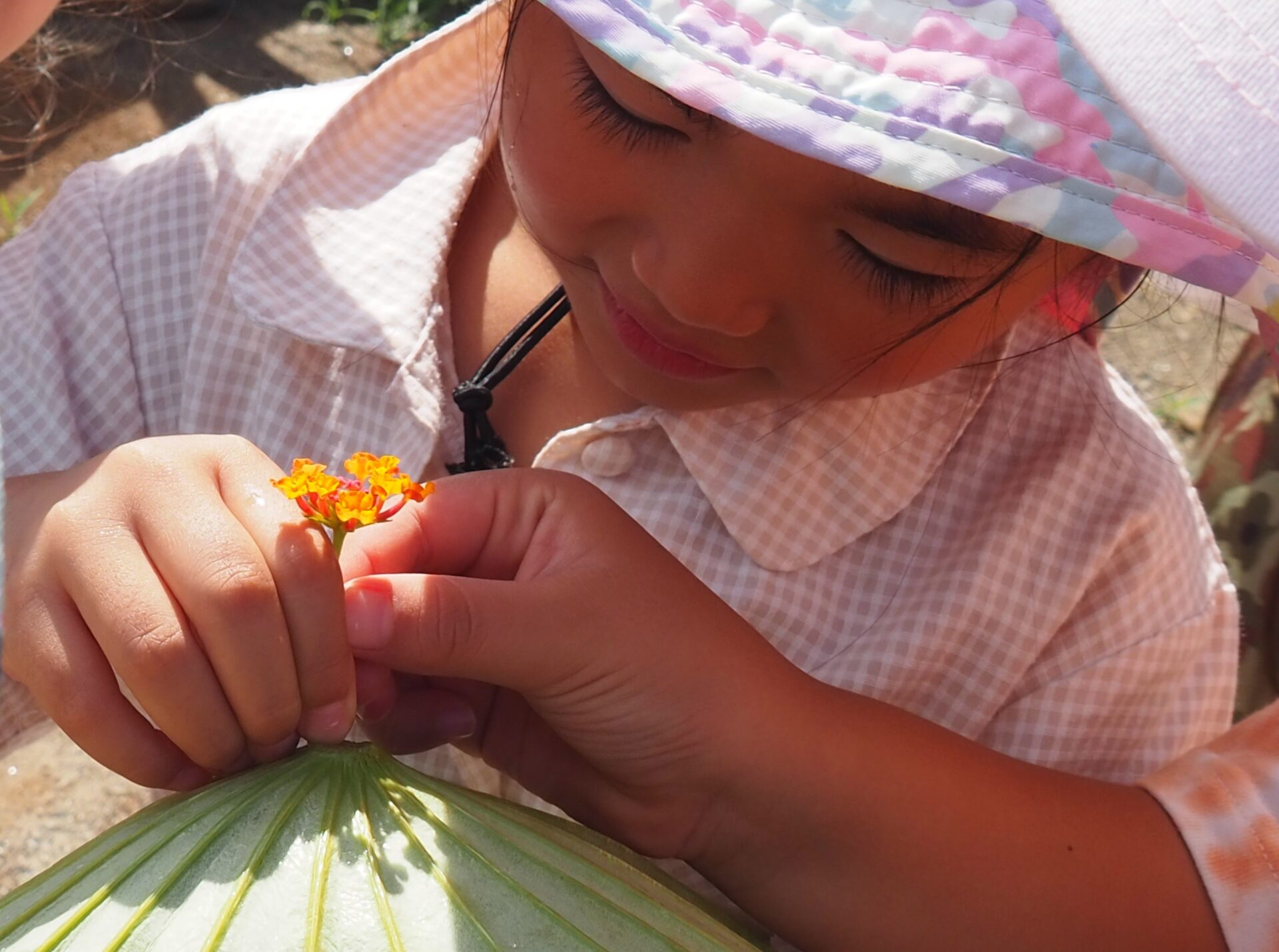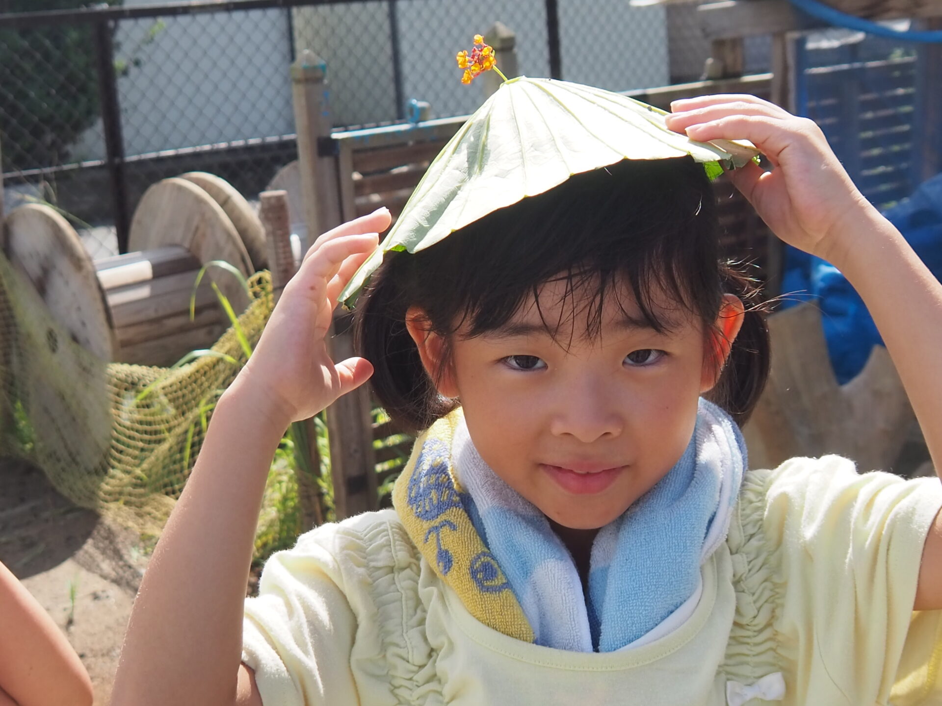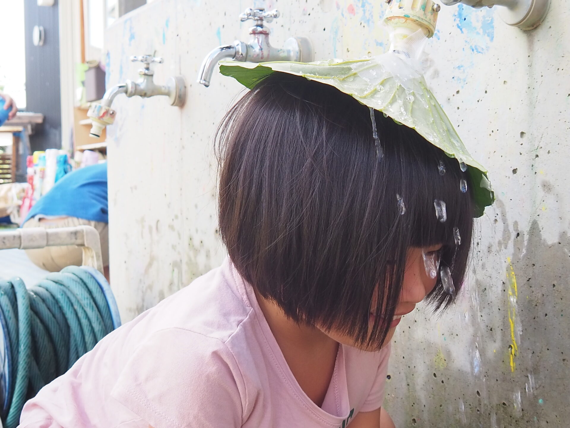 「なんか傘に似てる!この葉っぱを被ってたら髪の毛濡れないんじゃない?」