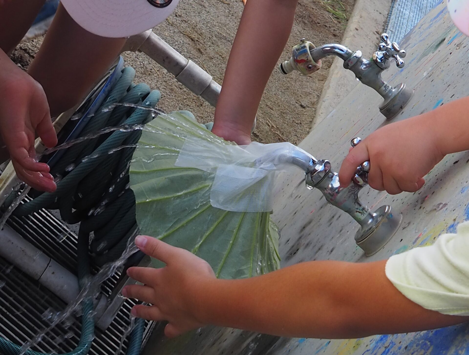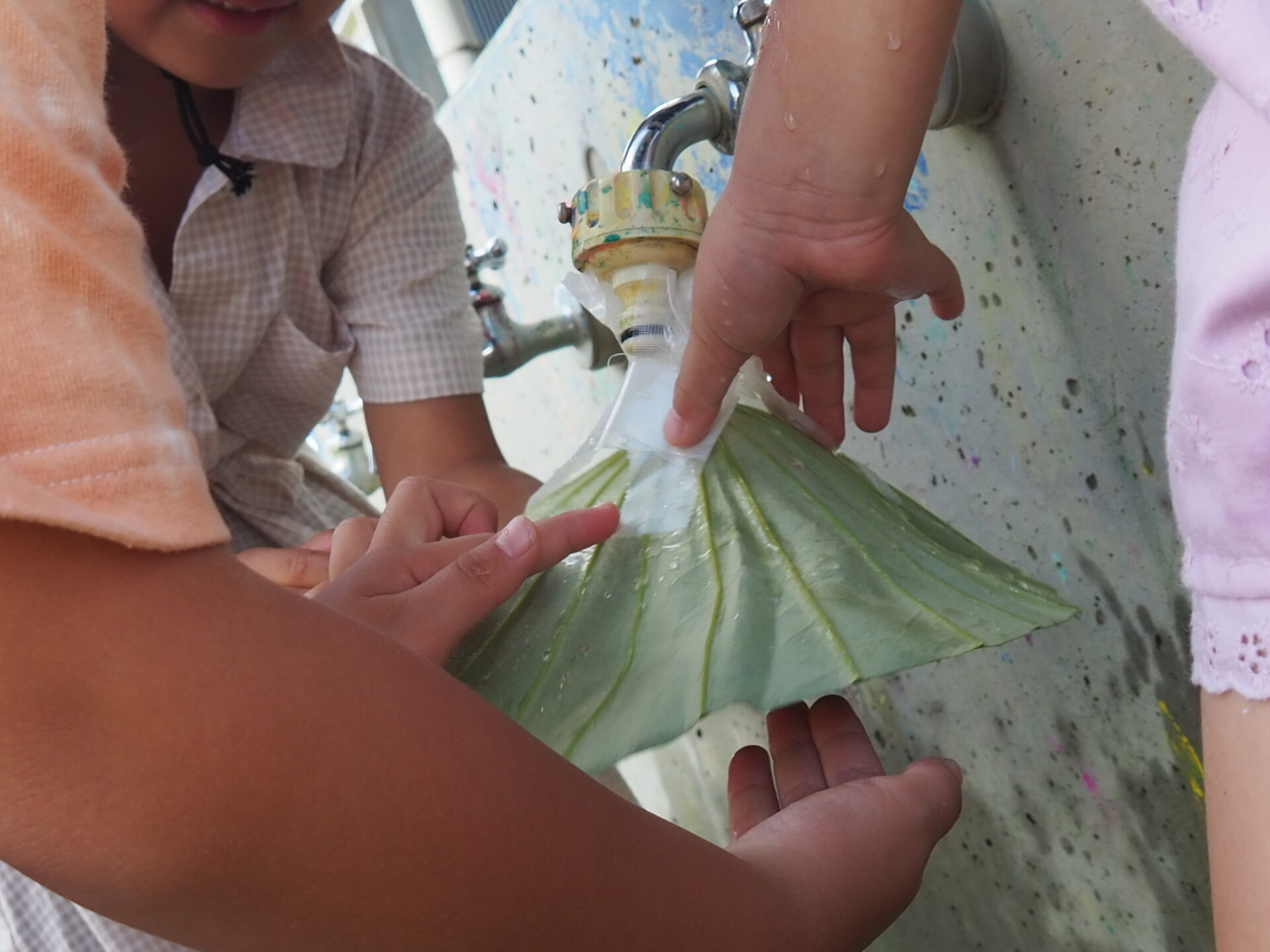 悪戦苦闘しながら、水道の蛇口に蓮の葉をくっつけています。