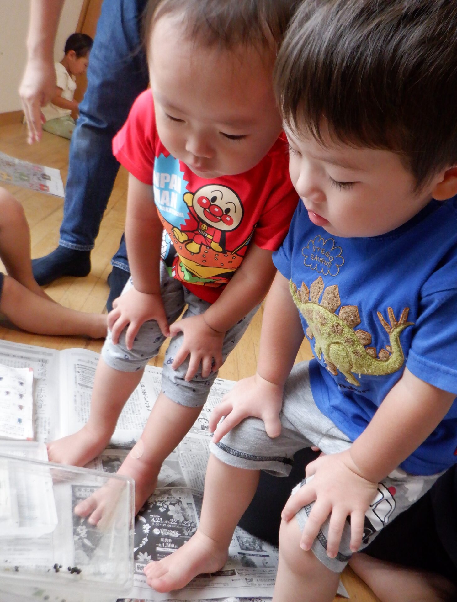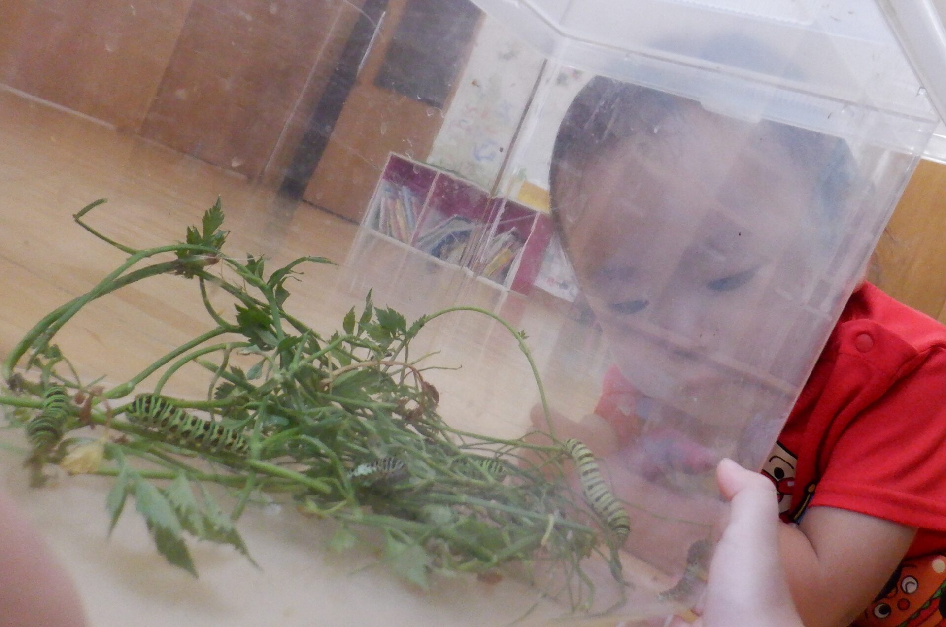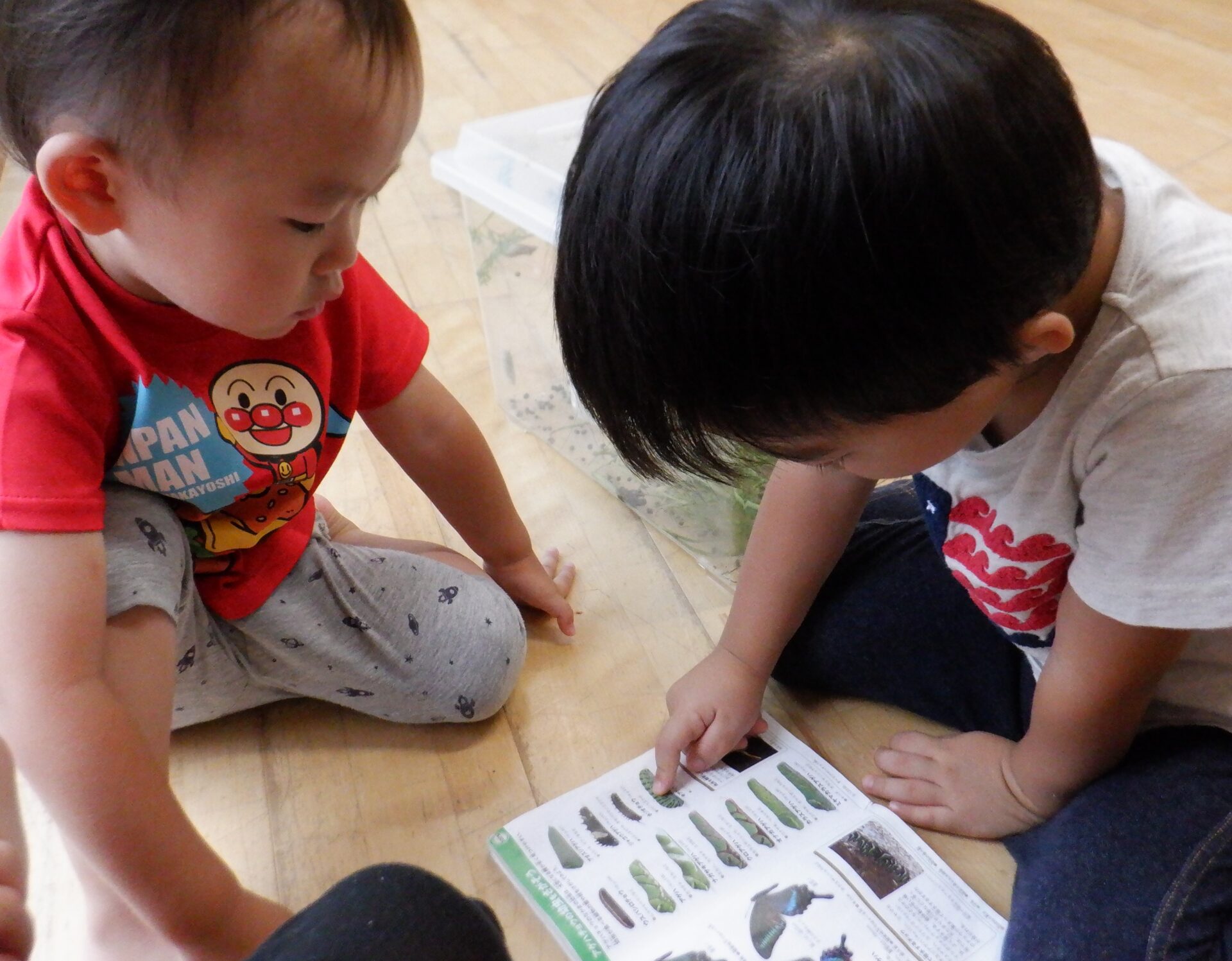 幼虫の様子を夢中で観察する子、図鑑を持ってきて