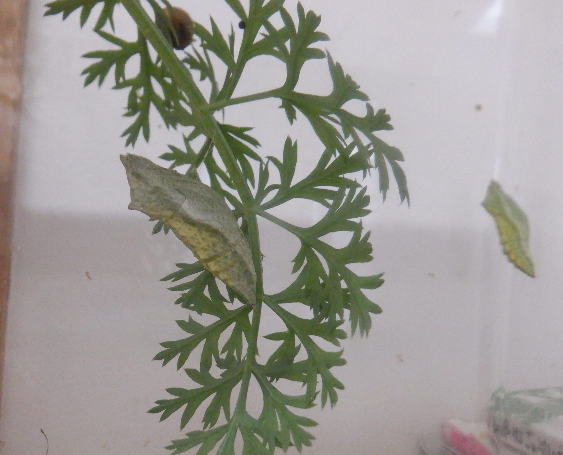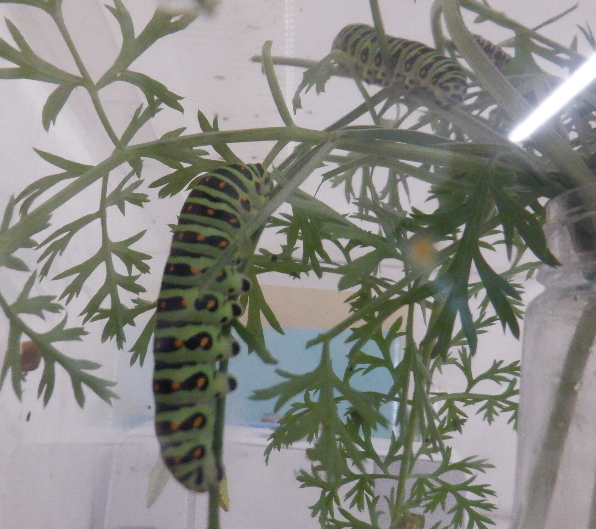 草の茎についている幼虫をそーっと優しく持ち上げ、虫かごに入れて連れて帰ってきました。
