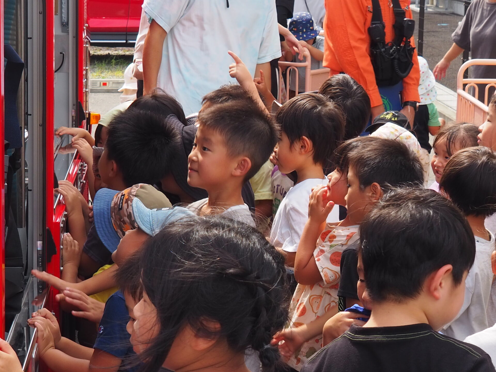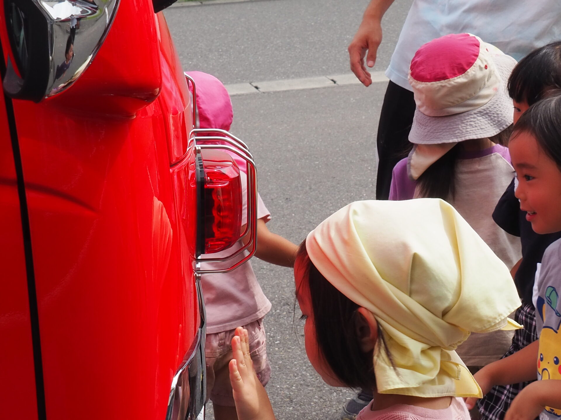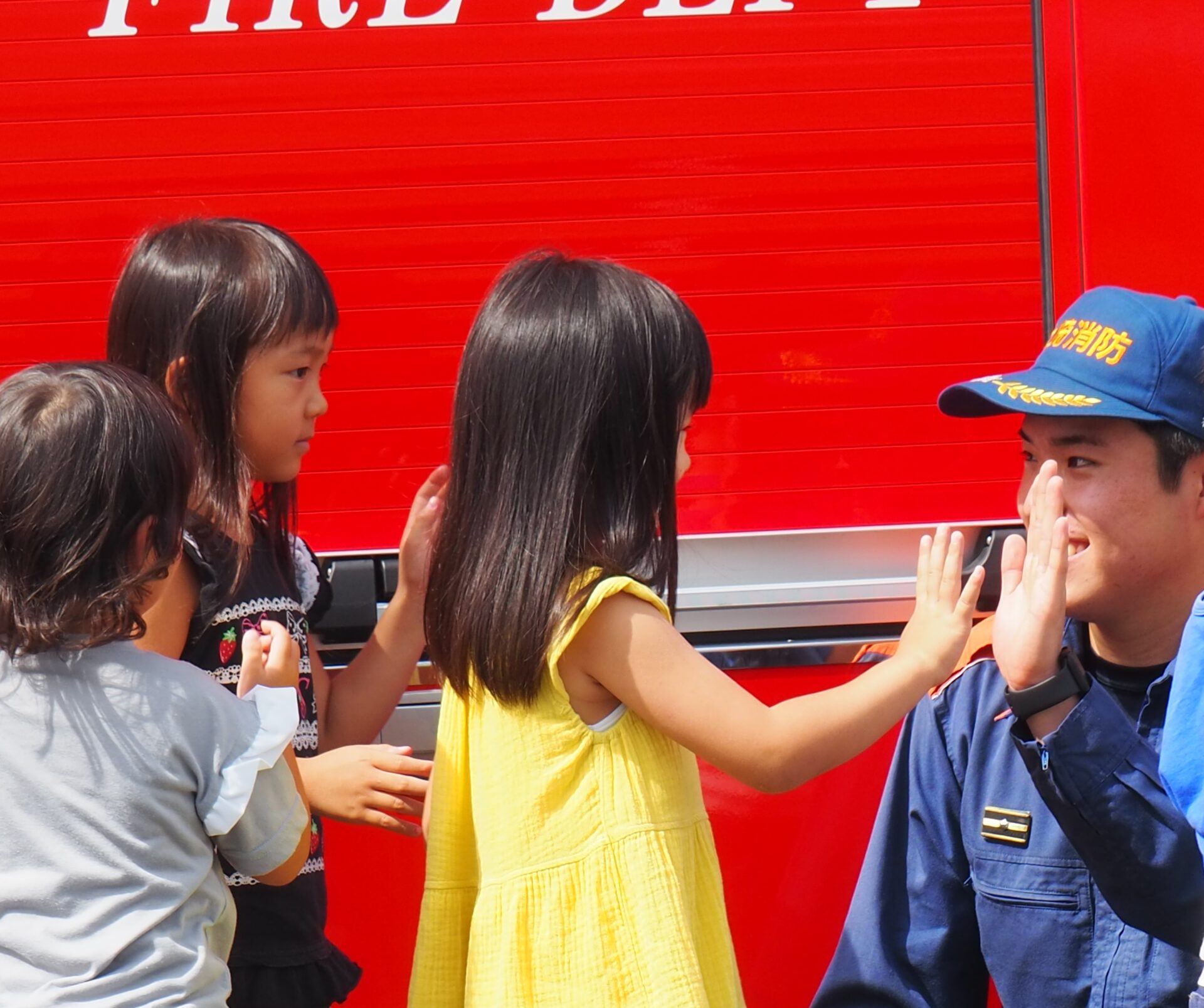 笑顔が素敵な消防士さんとタッチで満足の子ども達です。