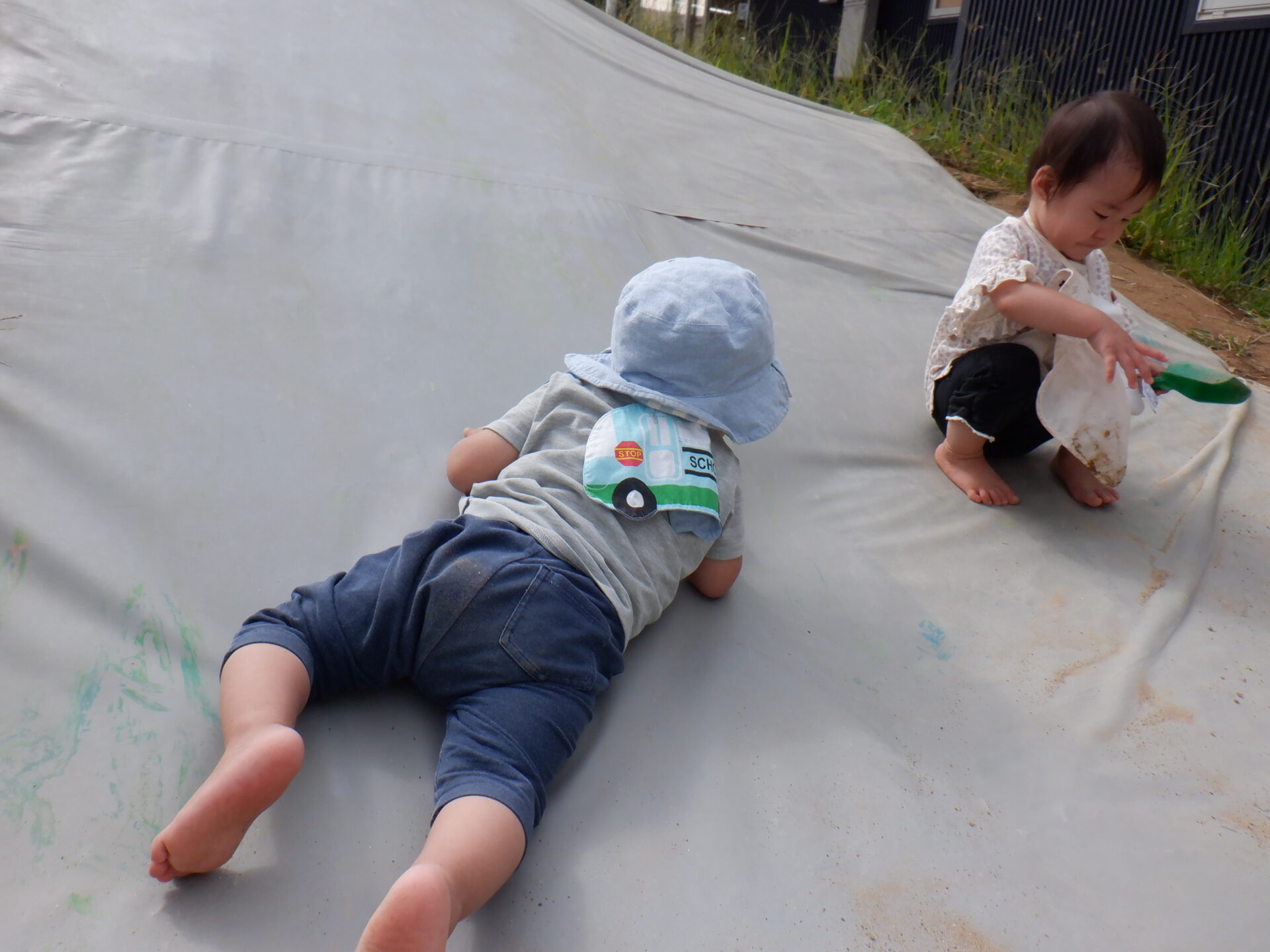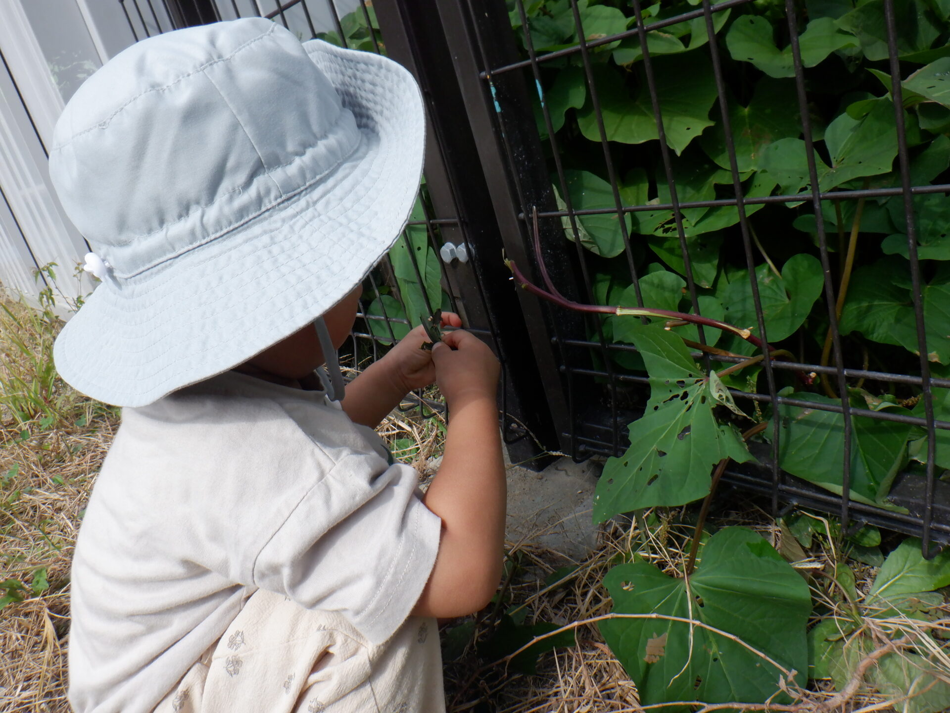 ゴミ収集車を見送った後には、大きな葉っぱを観察したり