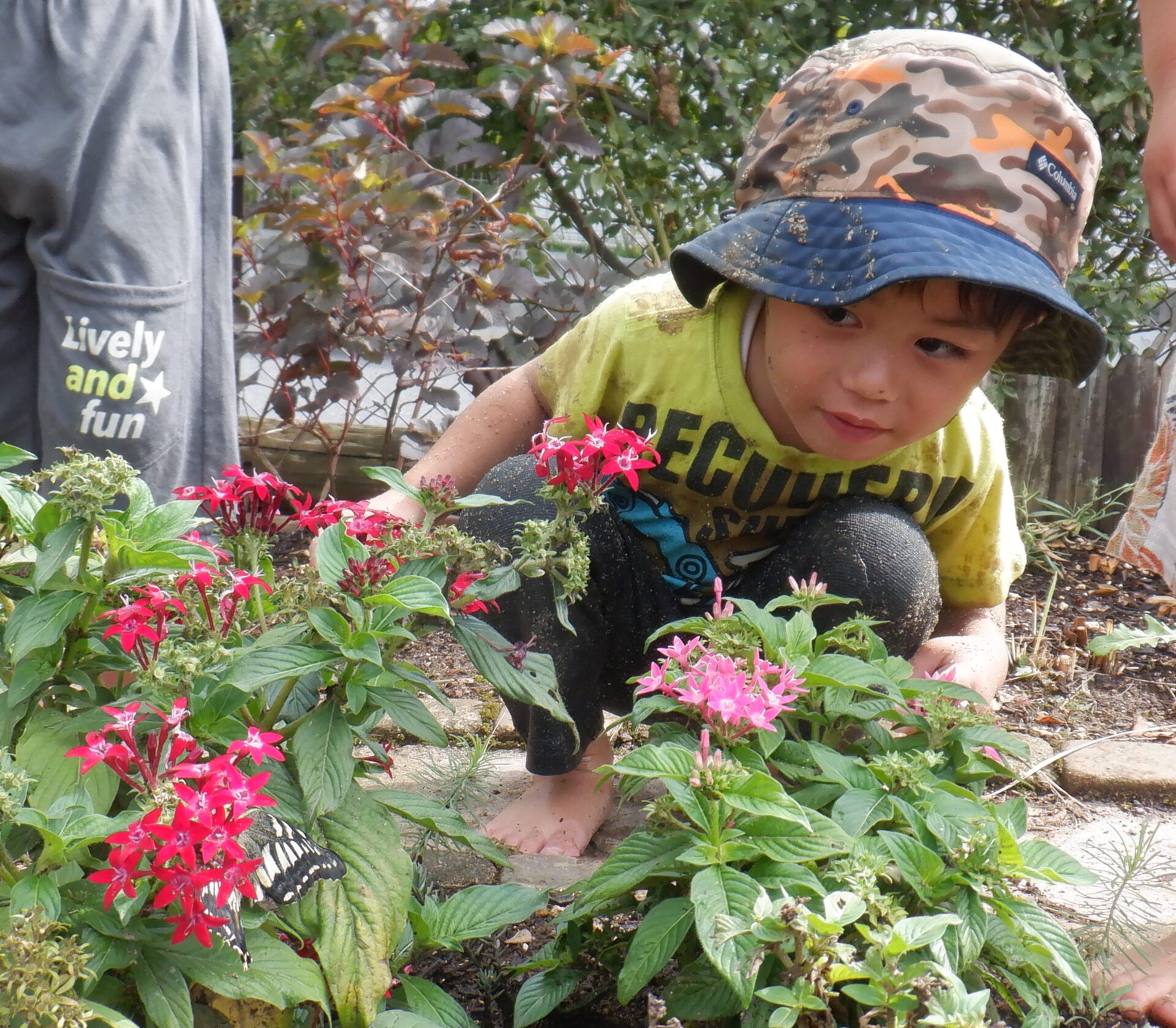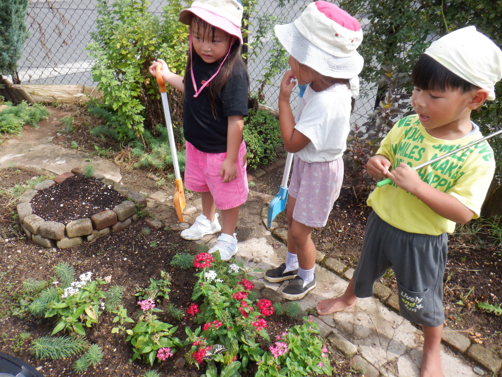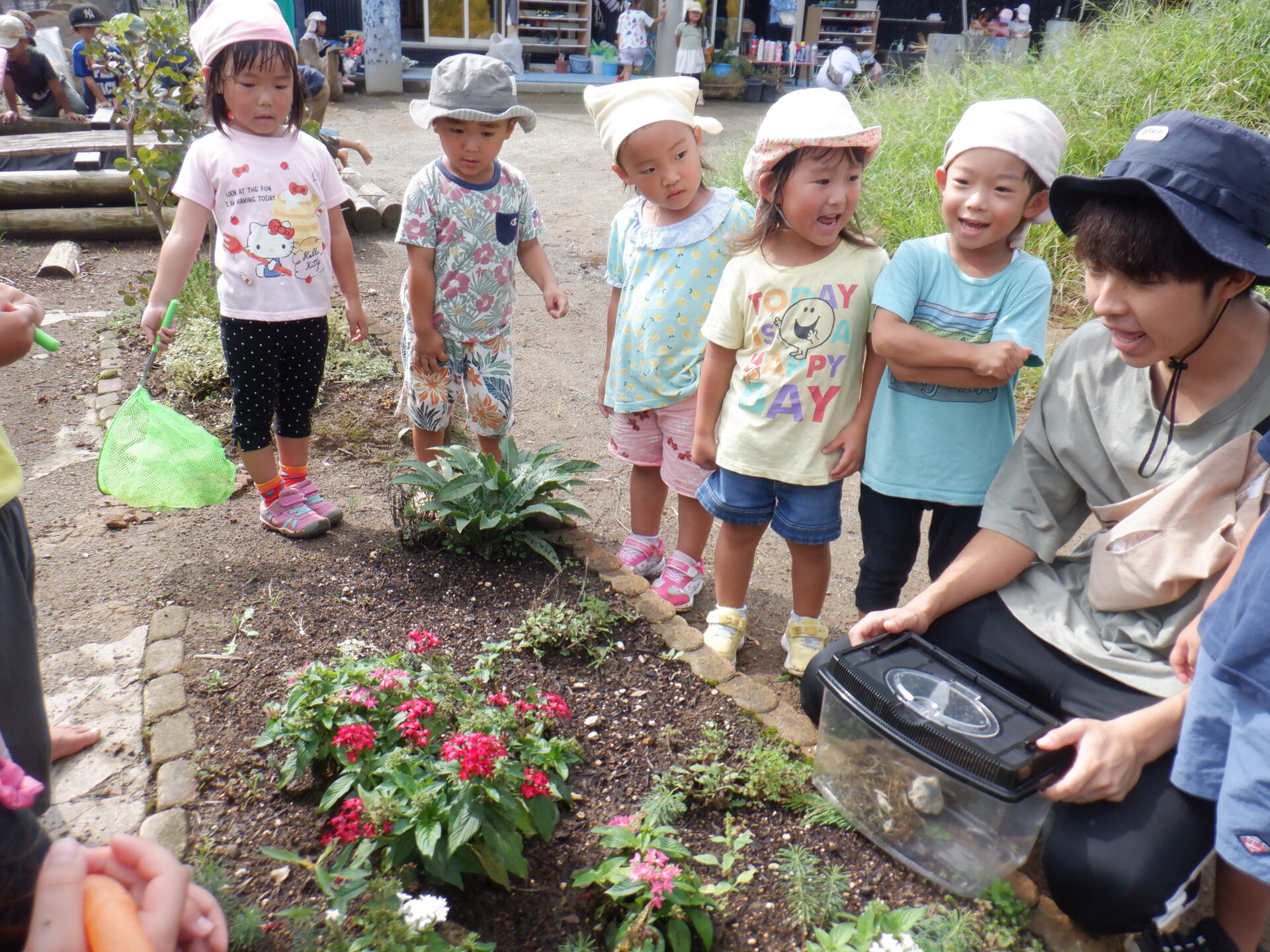 園庭の花壇に逃がすと、