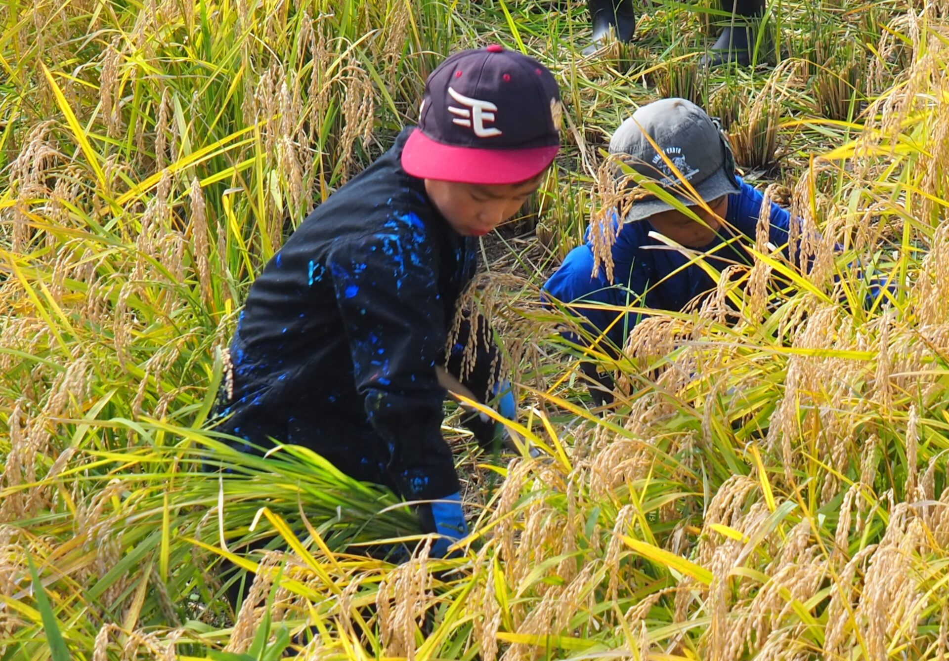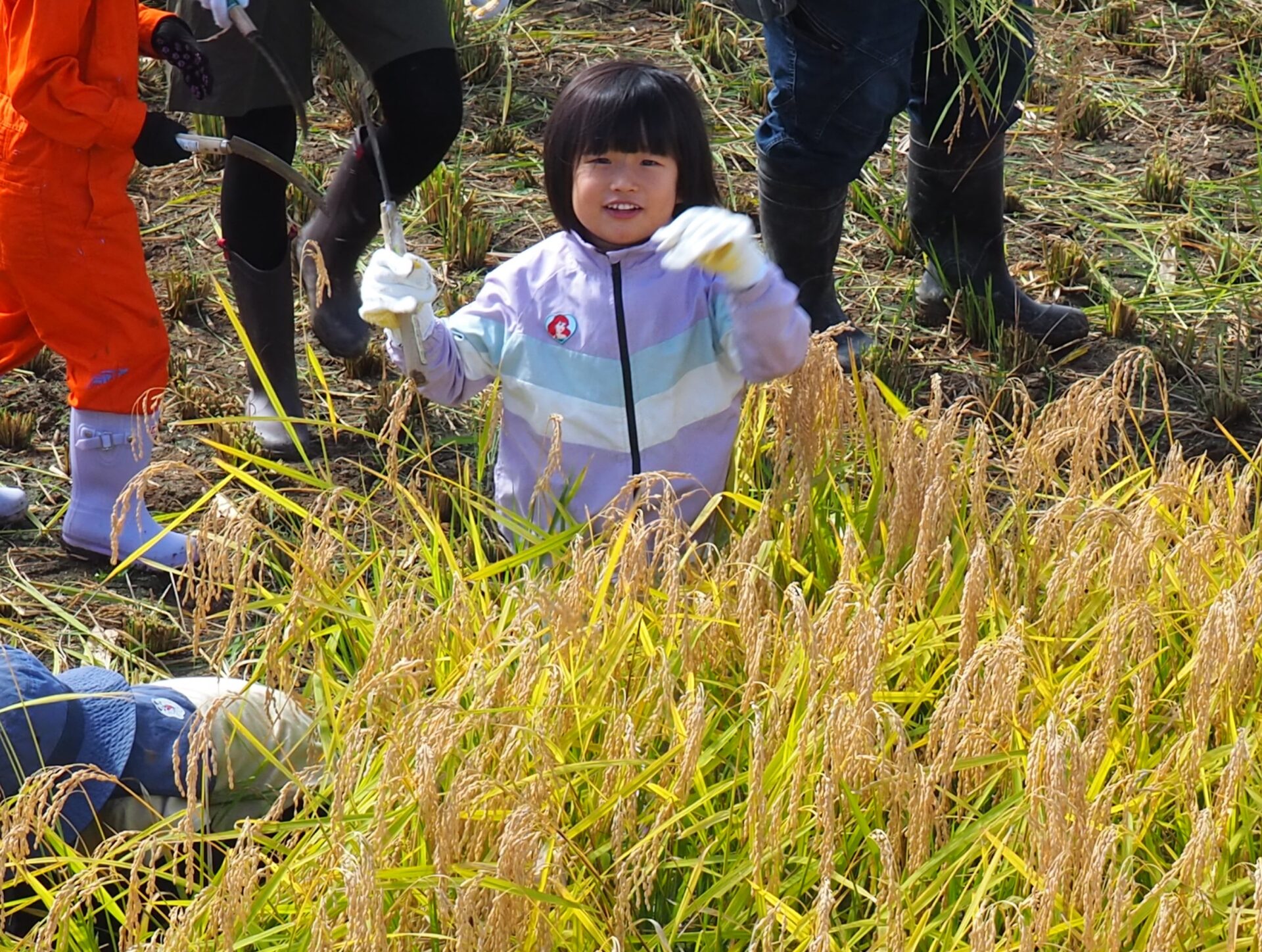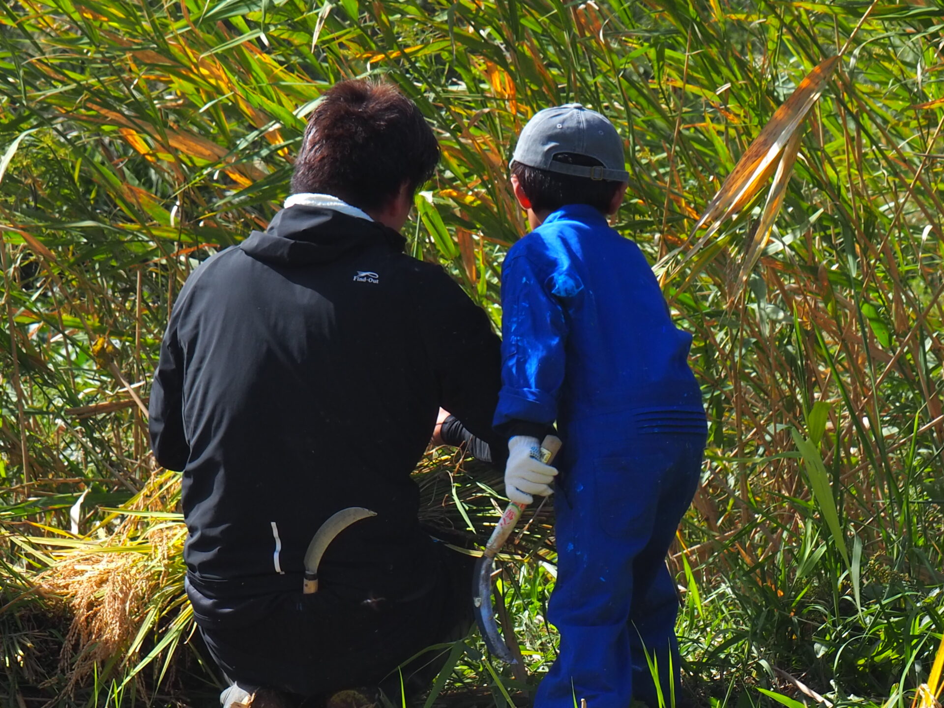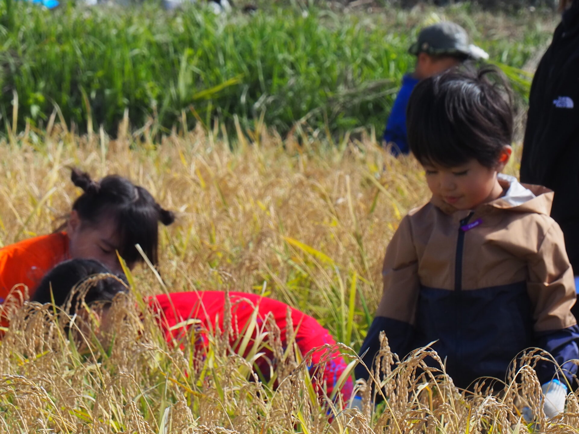 しゃがみながら稲刈りをしている子どもが、どこにいるか分からなくなるほど稲の生育っぷりに驚きです!
