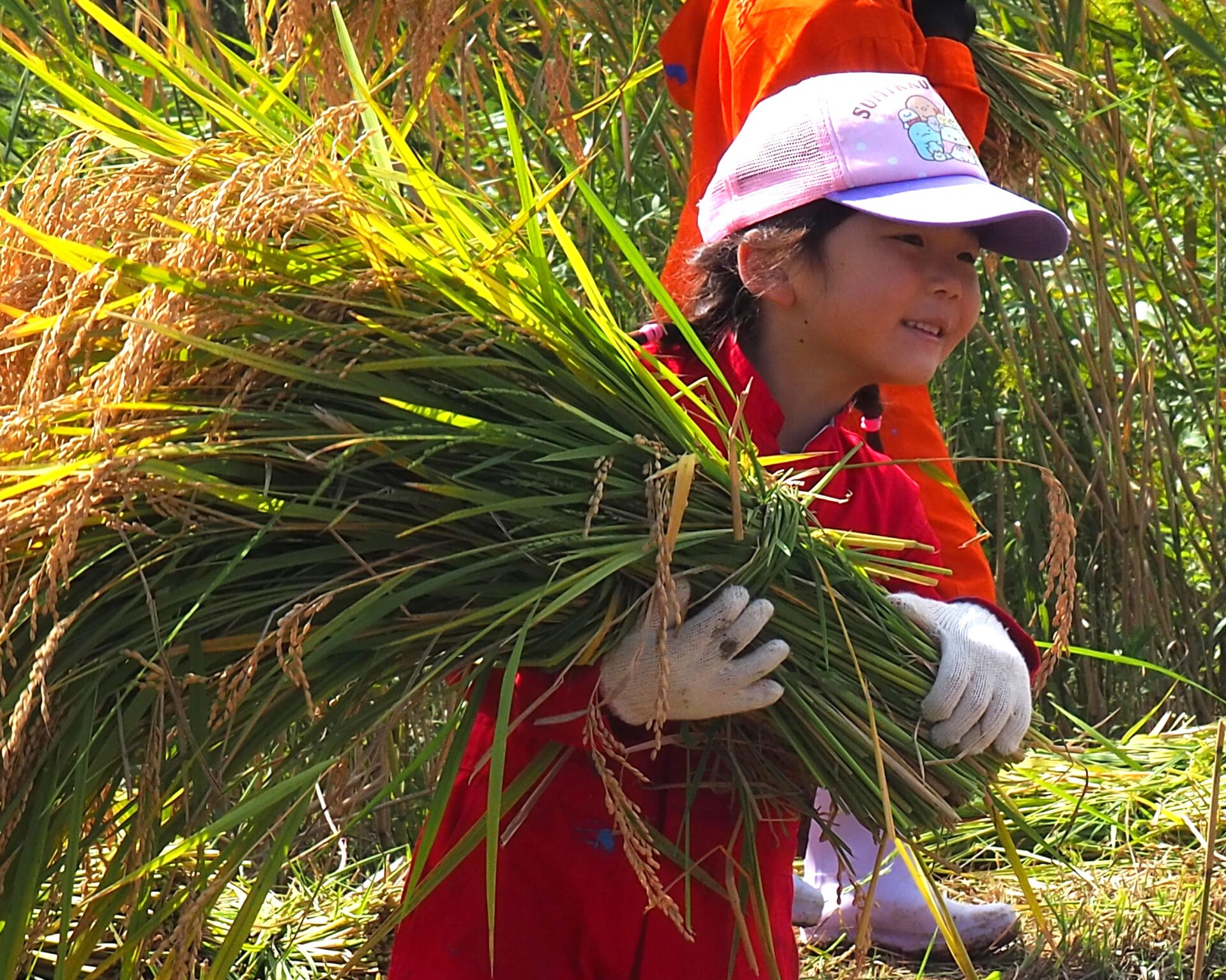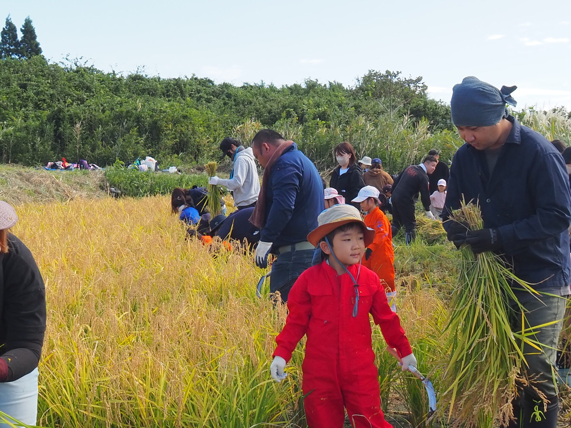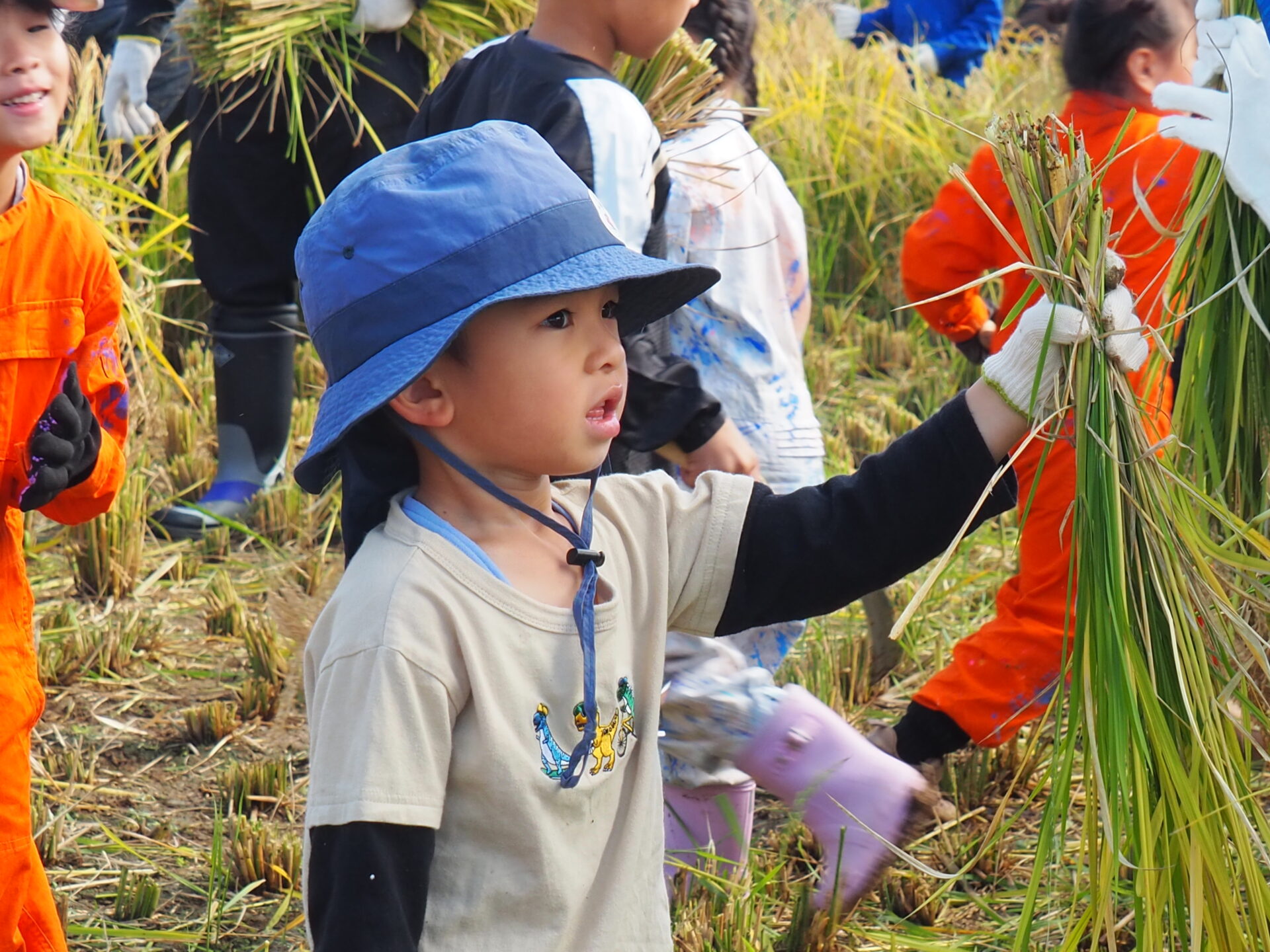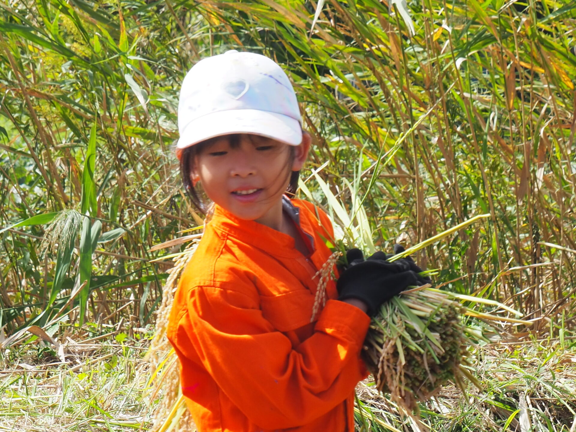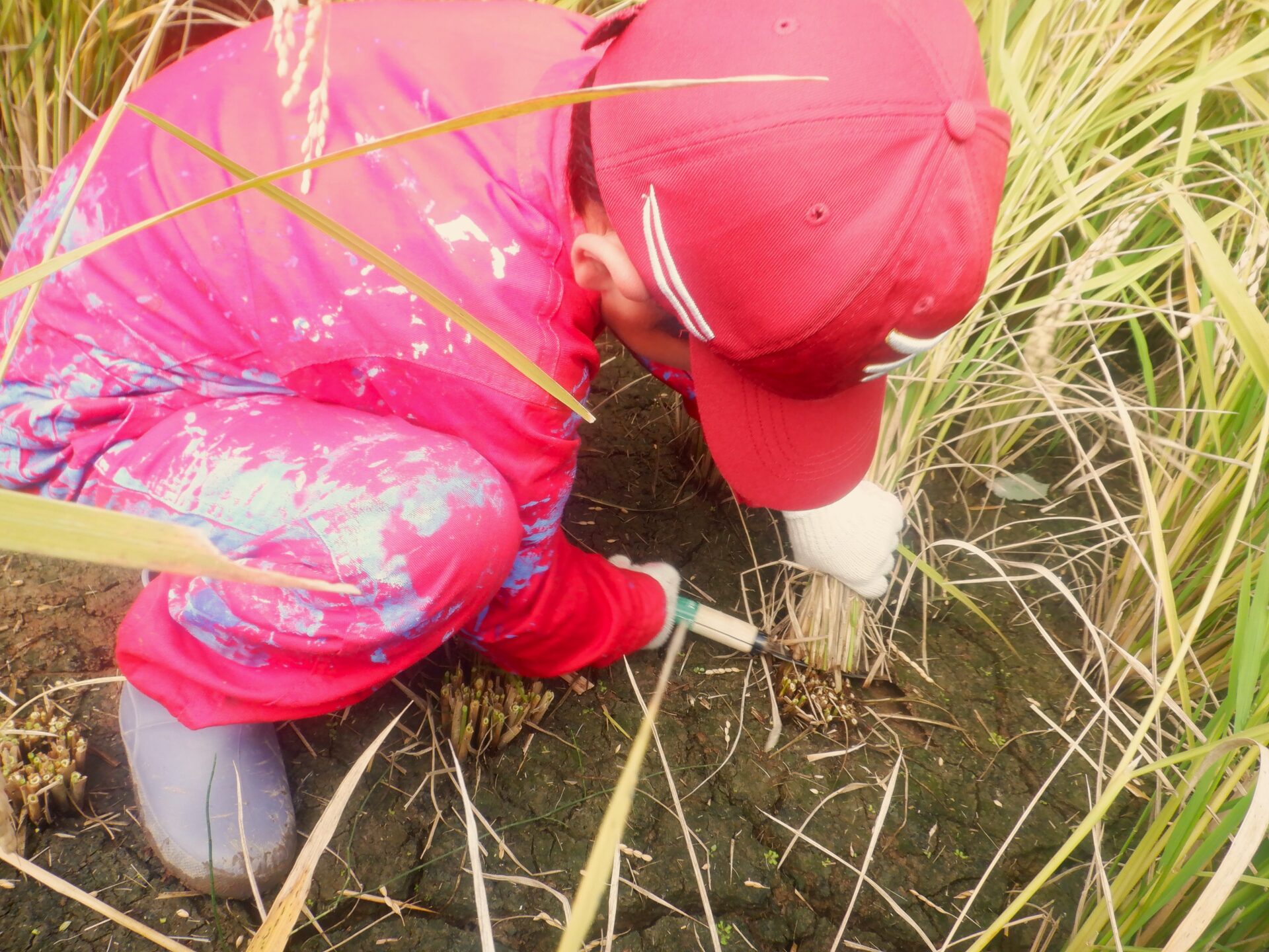 しゃがみながら稲刈りをしている子どもが、どこにいるか分からなくなるほど稲の生育っぷりに驚きです!