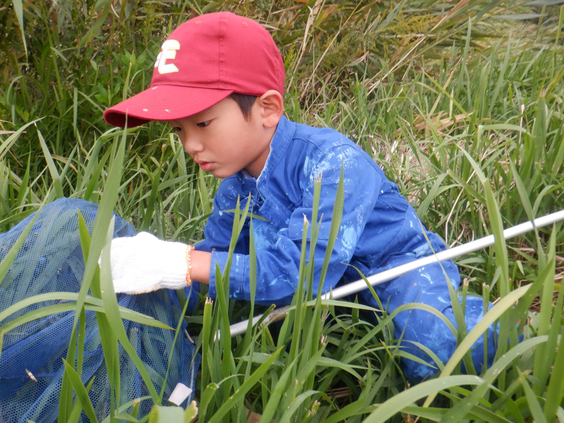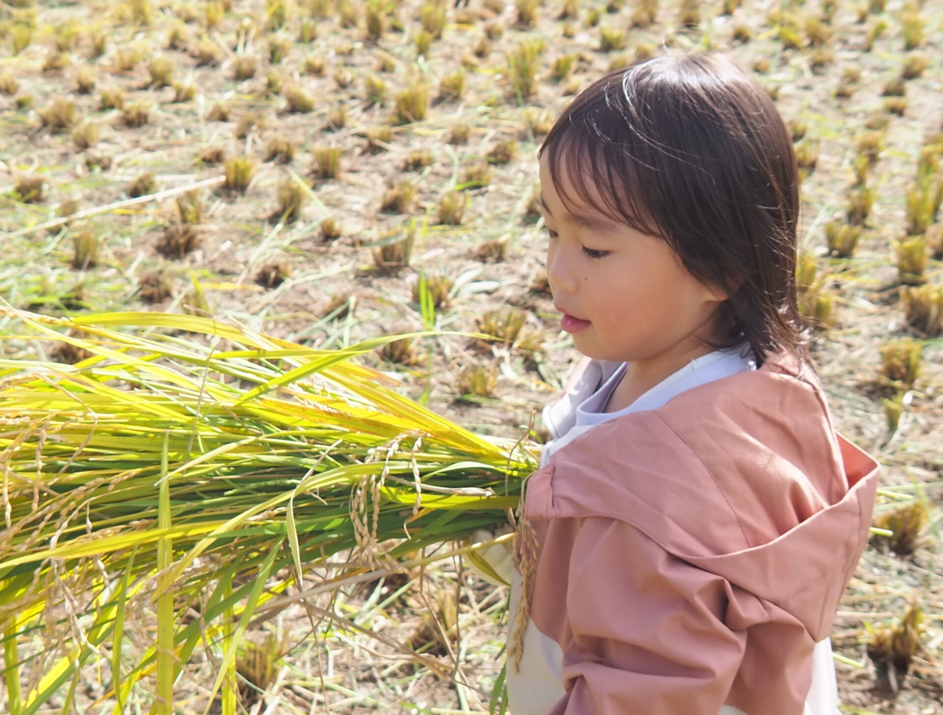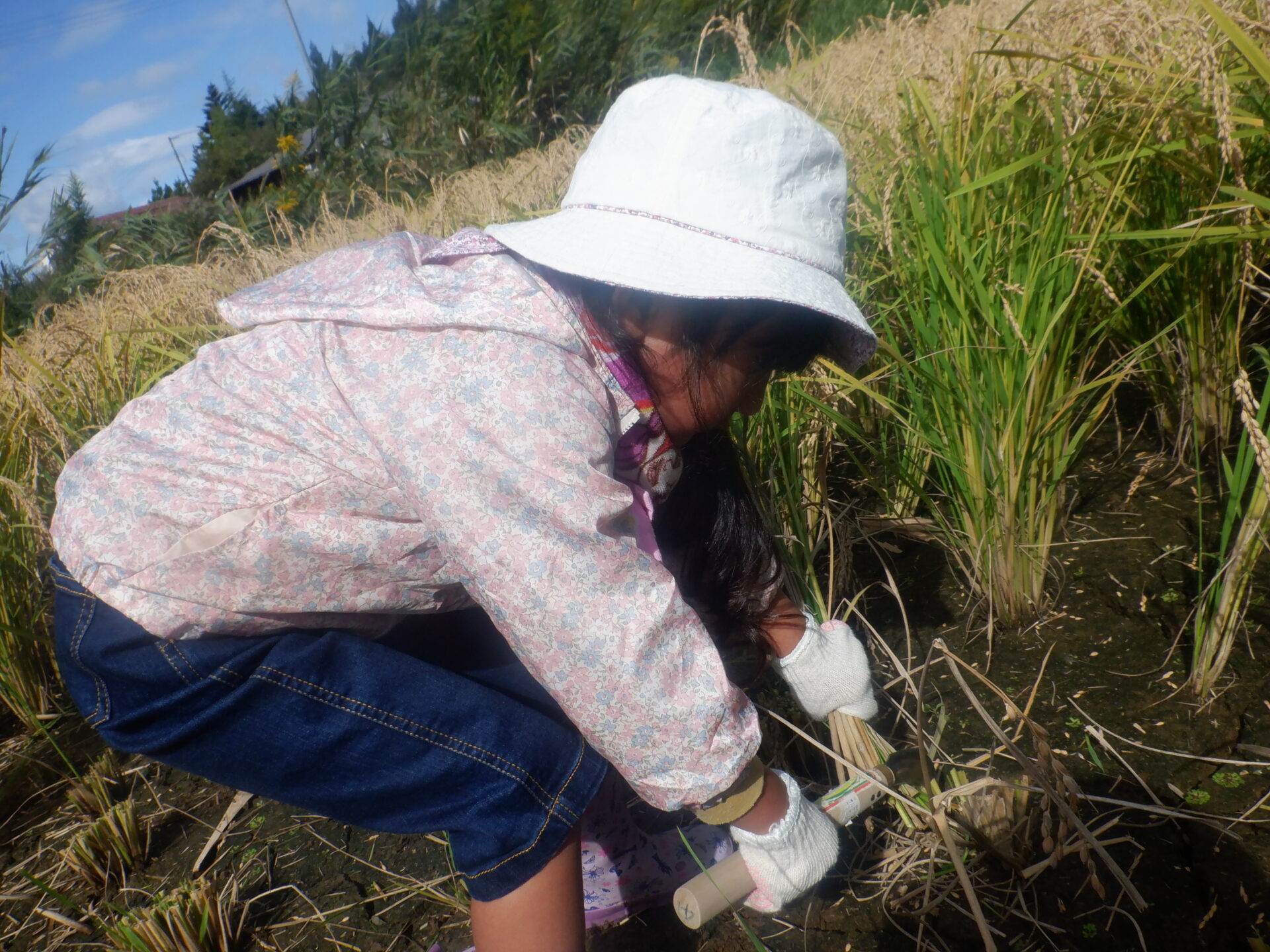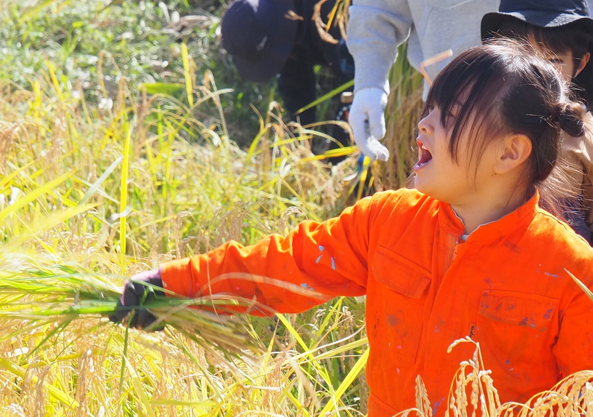 しゃがみながら稲刈りをしている子どもが、どこにいるか分からなくなるほど稲の生育っぷりに驚きです!