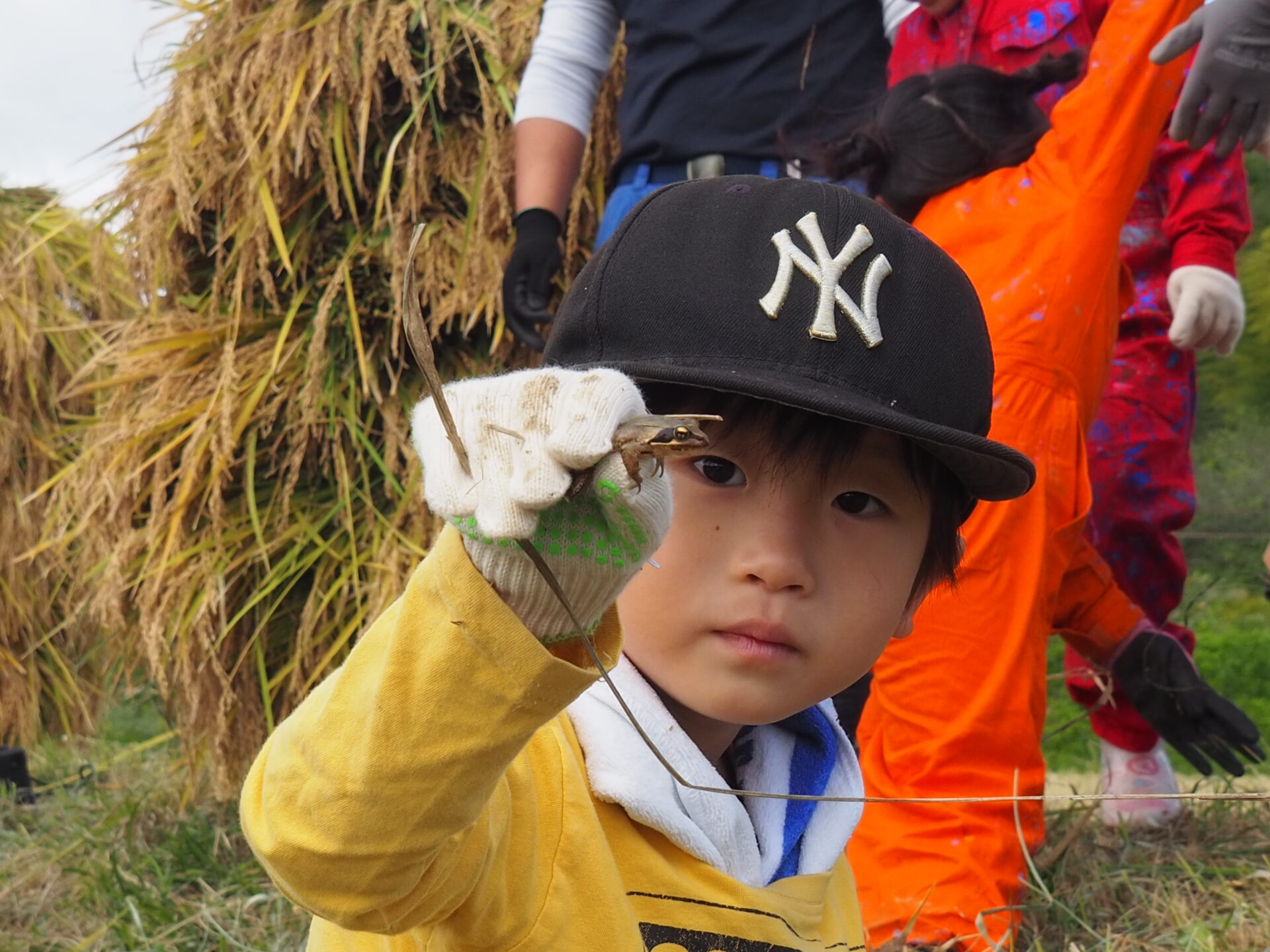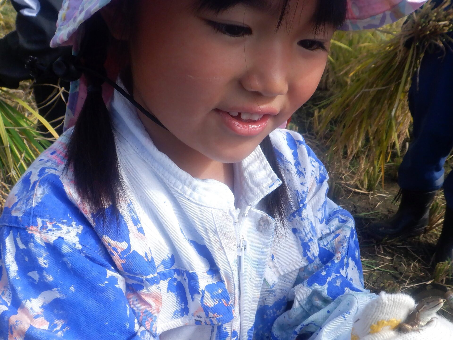 生き物探しやおしゃべりを楽しみ、鎌が稲を切る際の”ザクザク”の音が心地良くて夢中になっていると・・・。