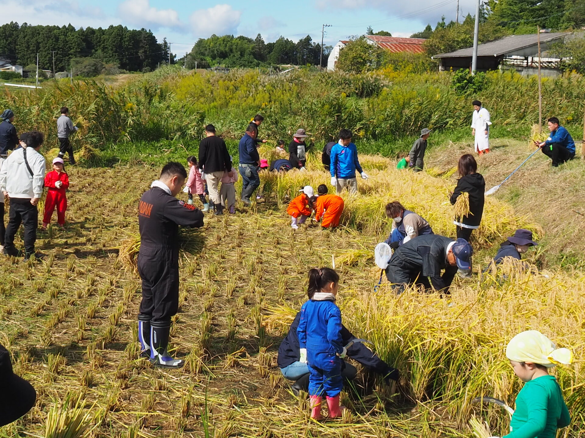 初め慣れない鎌にドキドキの子ども達でしたが、田んぼをお借りしている佐々木さん、大崎自然界部部長の若見さんのご指導のもと、少しずつ慣れてきた様子です。