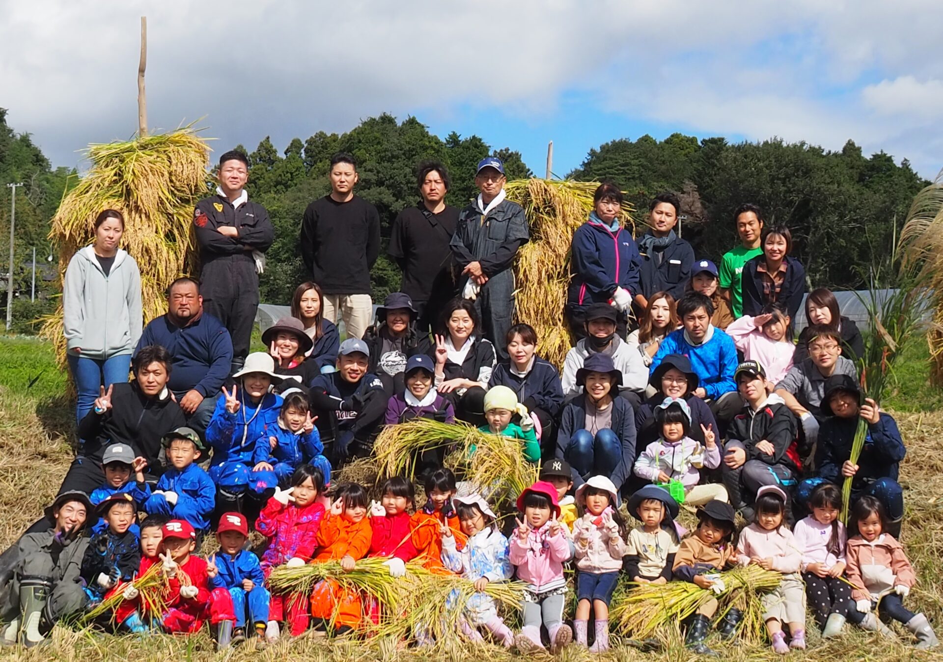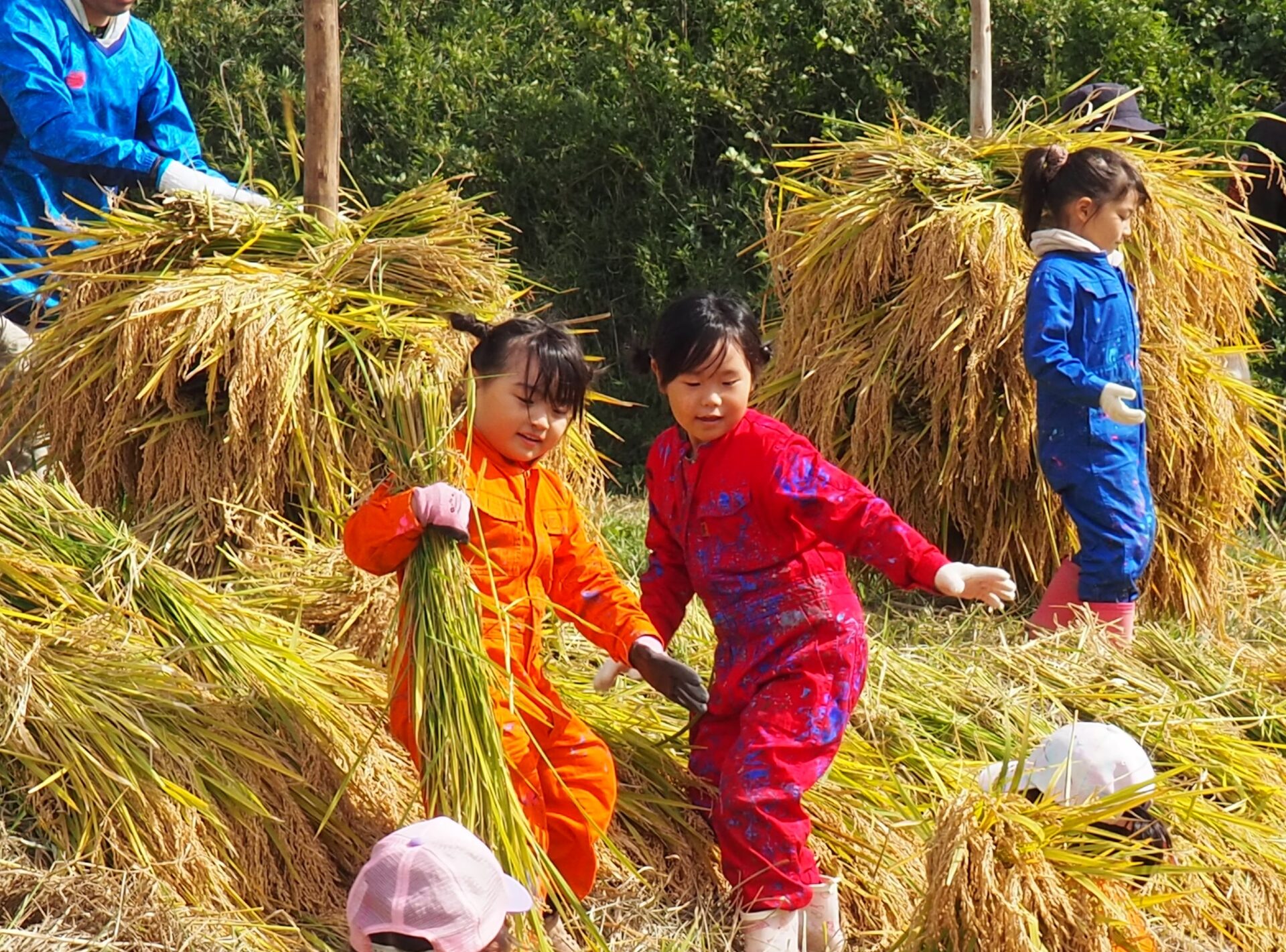 お父さん方の大活躍により、あっという間に6本の立派な【ほにょ】が出来上がって稲刈り終了。
