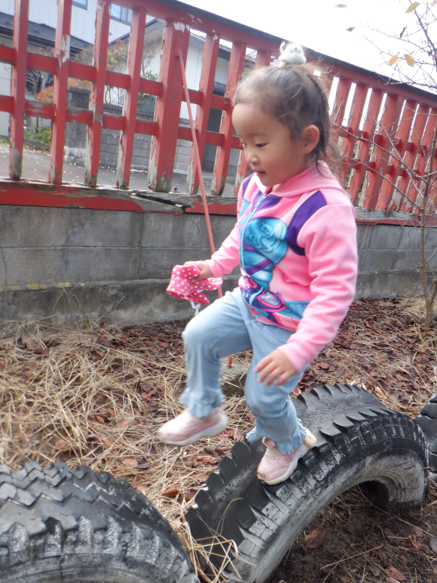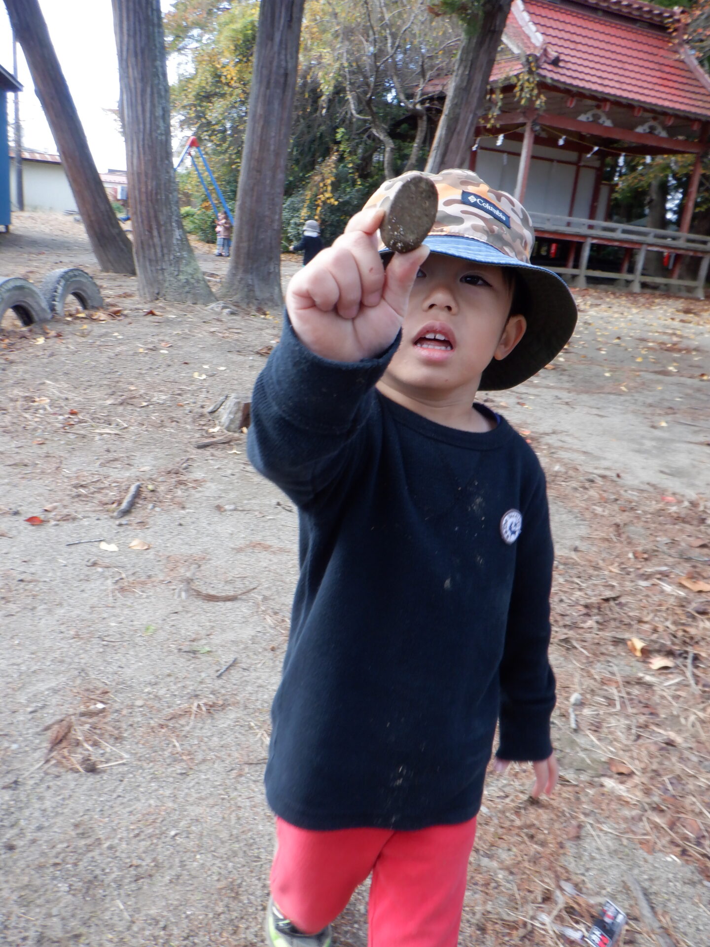 神社には、タイヤの一本橋があったり、落ち葉やどんぐりが落ちていたりしていて、