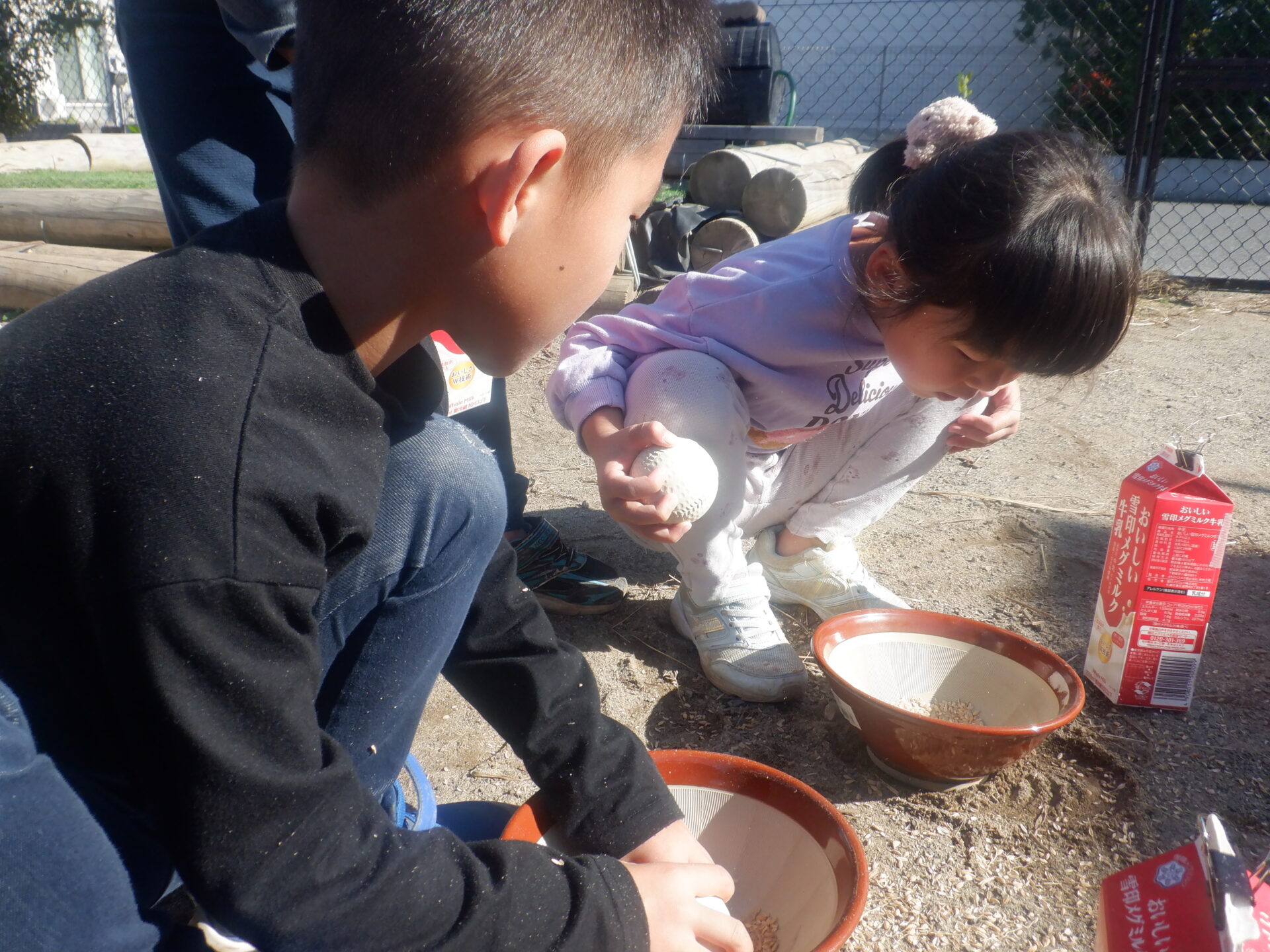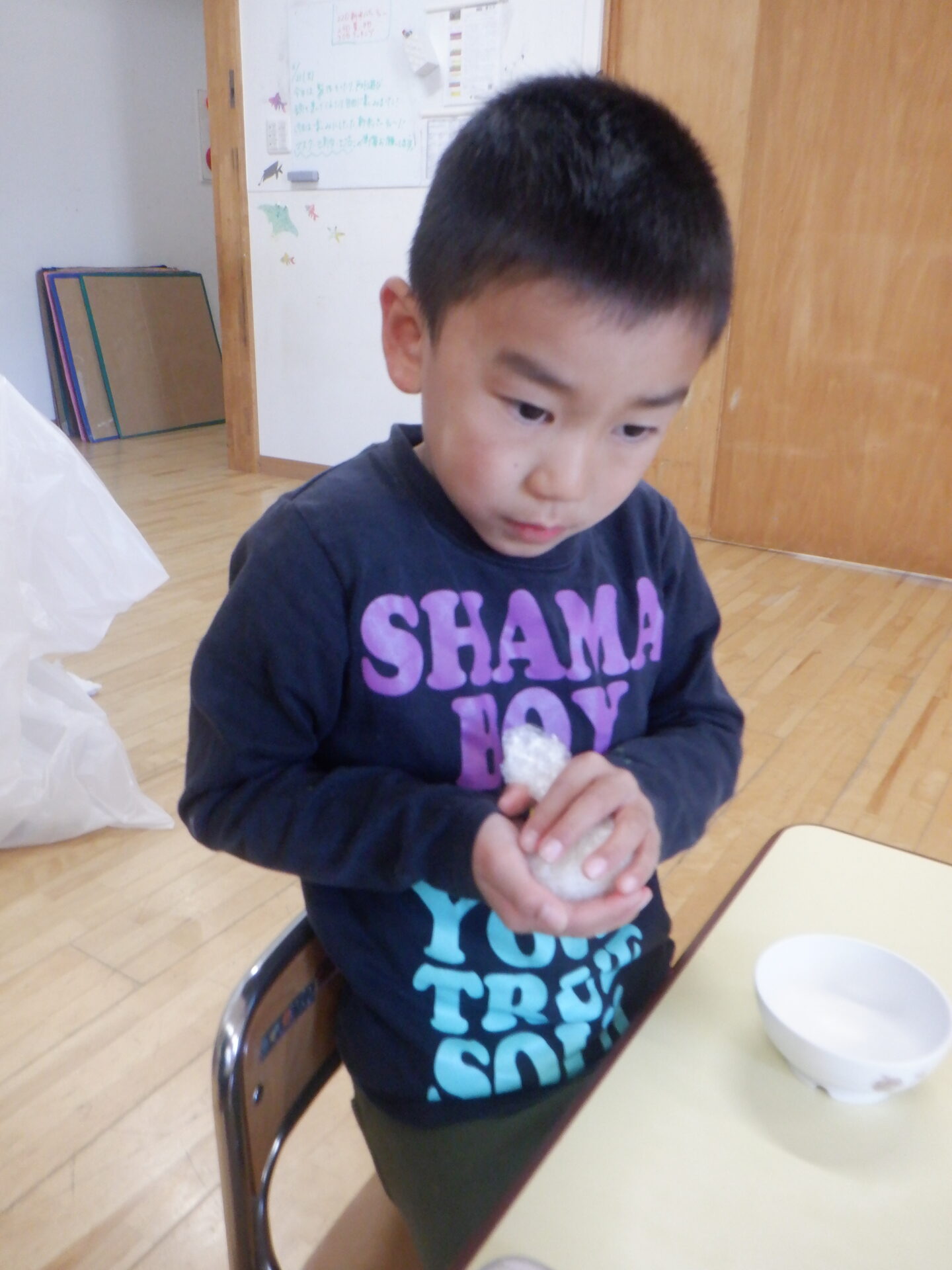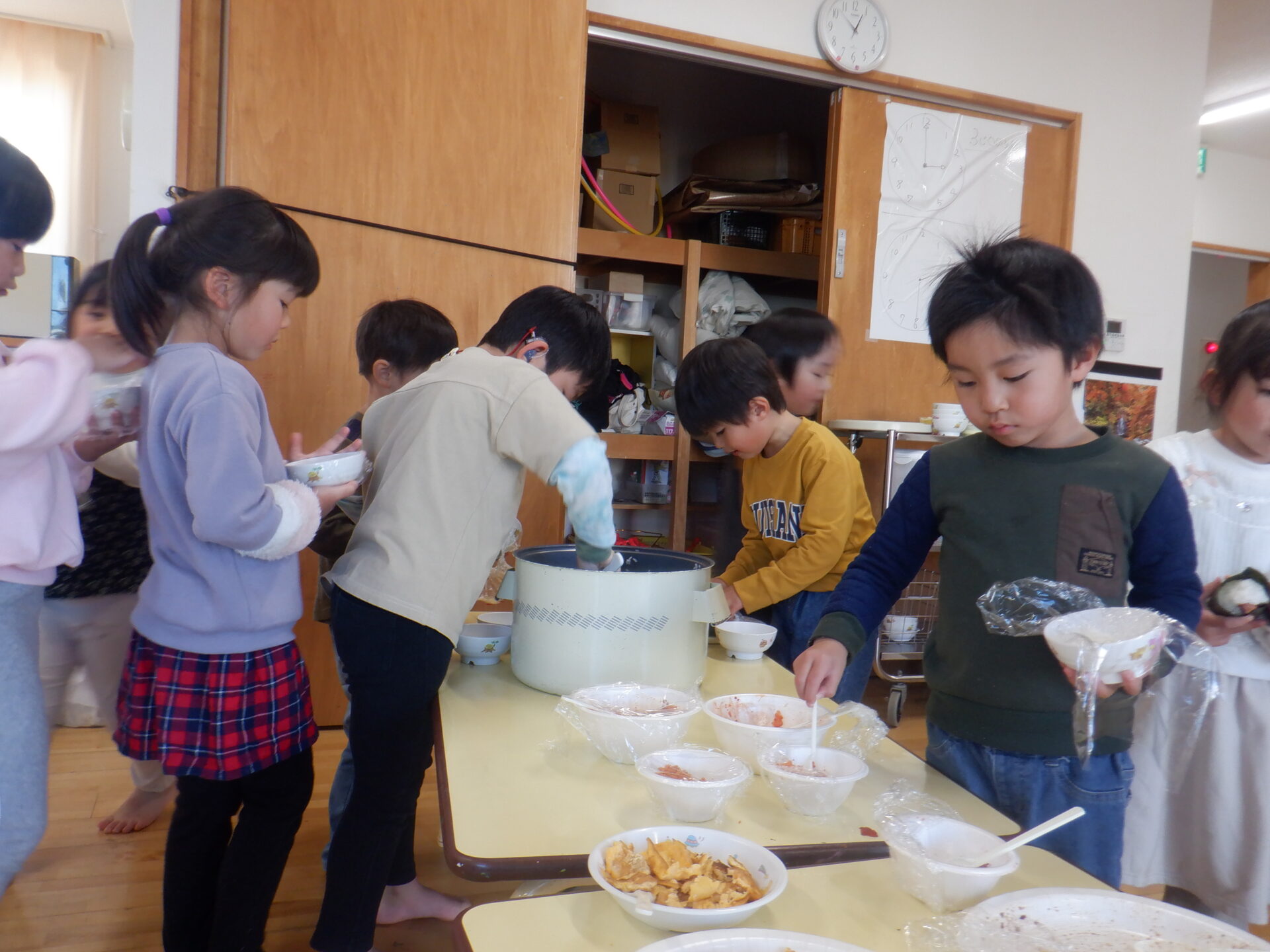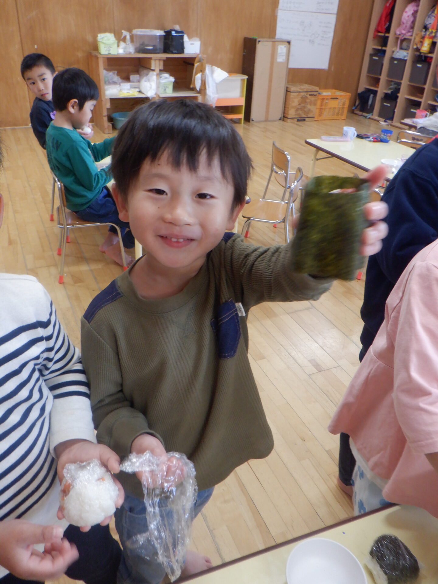 2023.11.22 にじ組(4歳児) バオバブ組(5歳児) ブログ 今日は、新米パーティーの日。 自分たちでしっかり脱穀し準備しました。 バオバブ組のお兄さんお姉さんの上手な包丁の使い方、クッキングの仕方をまねしてにじ組も野菜の切り方にチャレンジ! おにぎりの具はバオバブ組が担当しました。(納豆キムチ・焼肉・スパム・卵焼きなど) 好きな具を選んで握って大きな口の中へ…。 お腹いっぱいで、幸せな日になりました。 一覧へ戻る