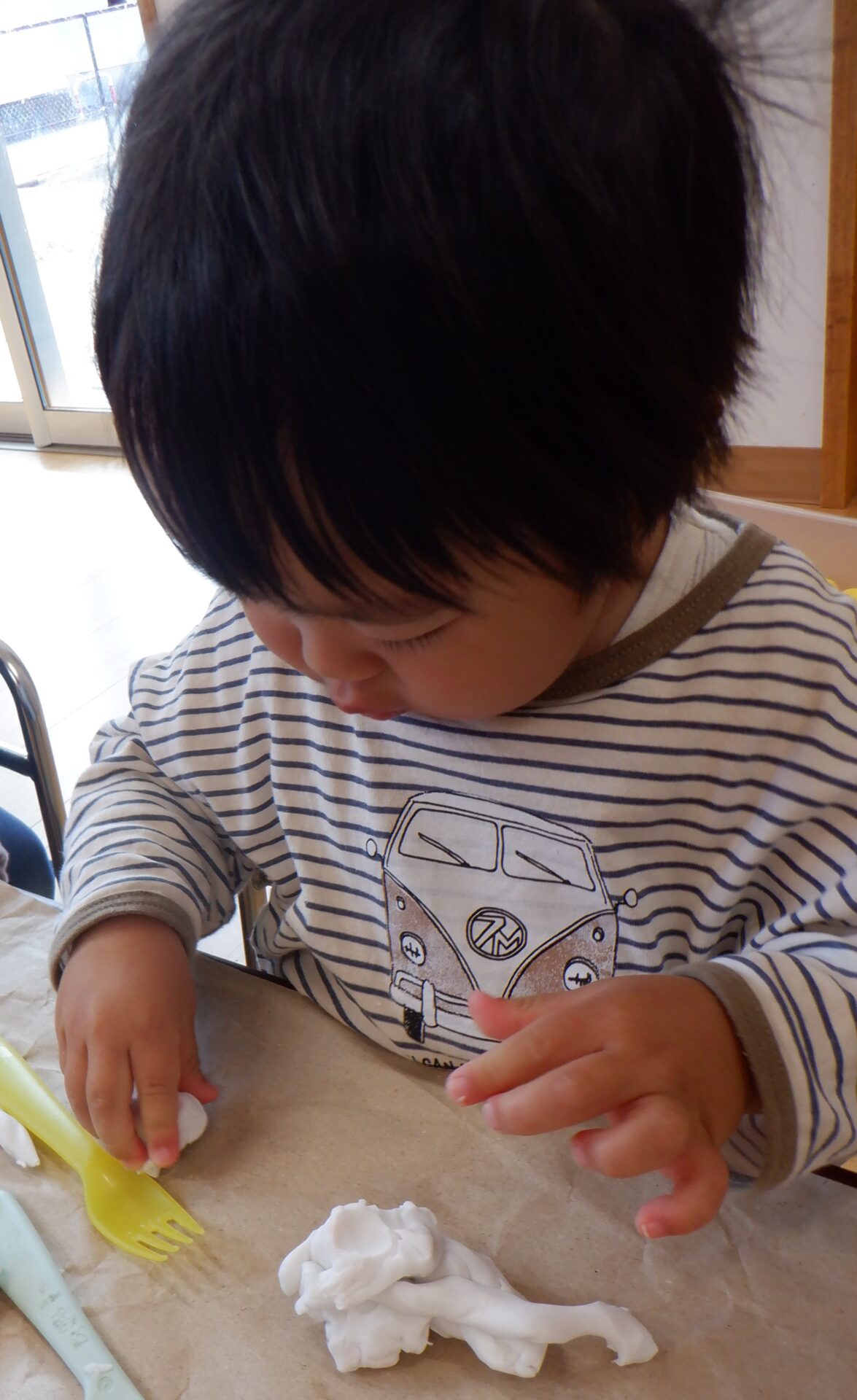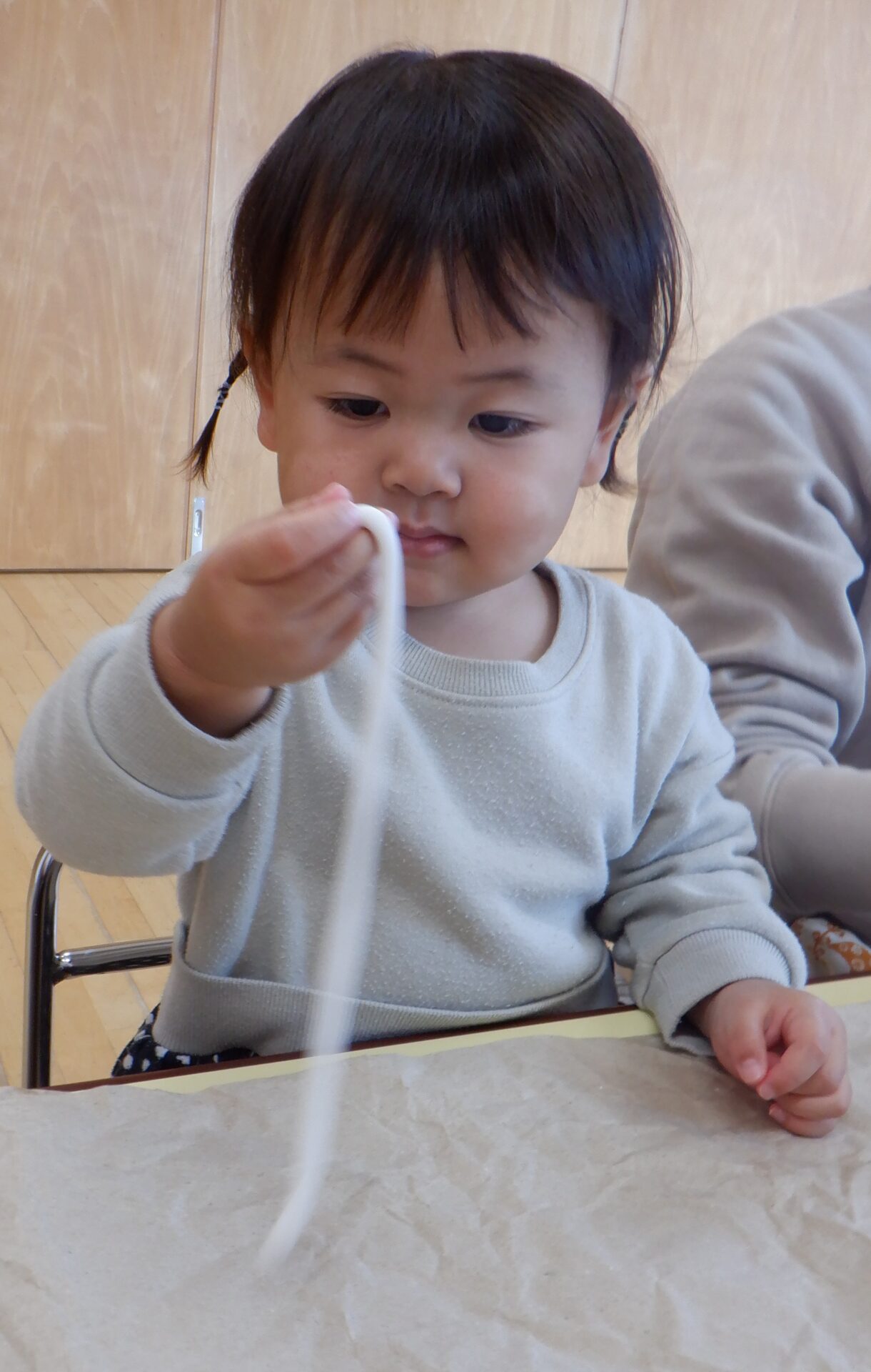 この日は、粘土遊びをしました。粘土を渡すと早速ちぎったり、丸めたり、細くしたり・・・。