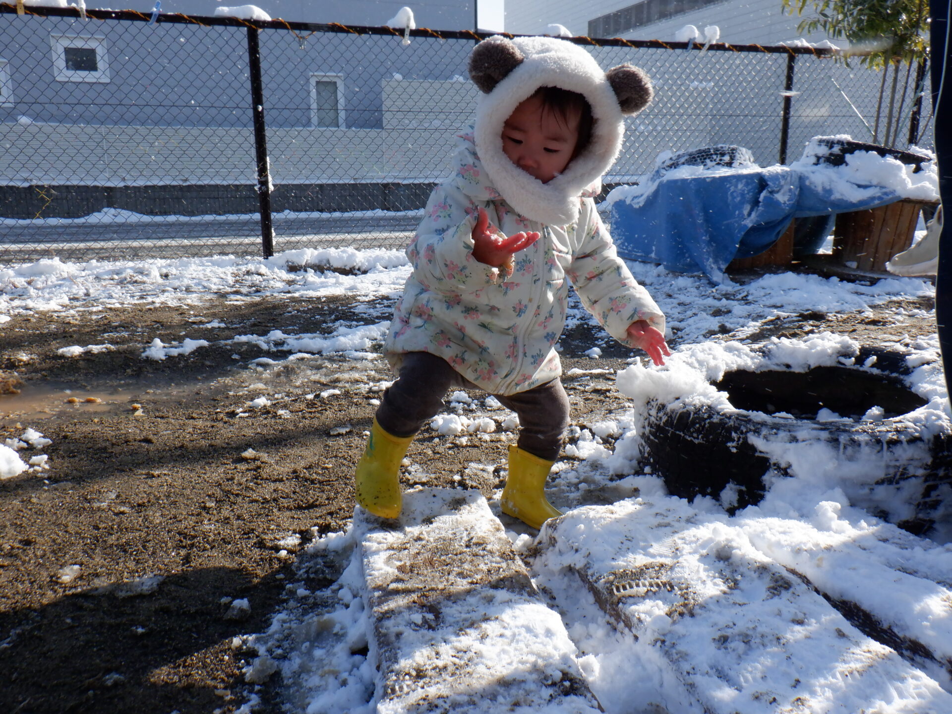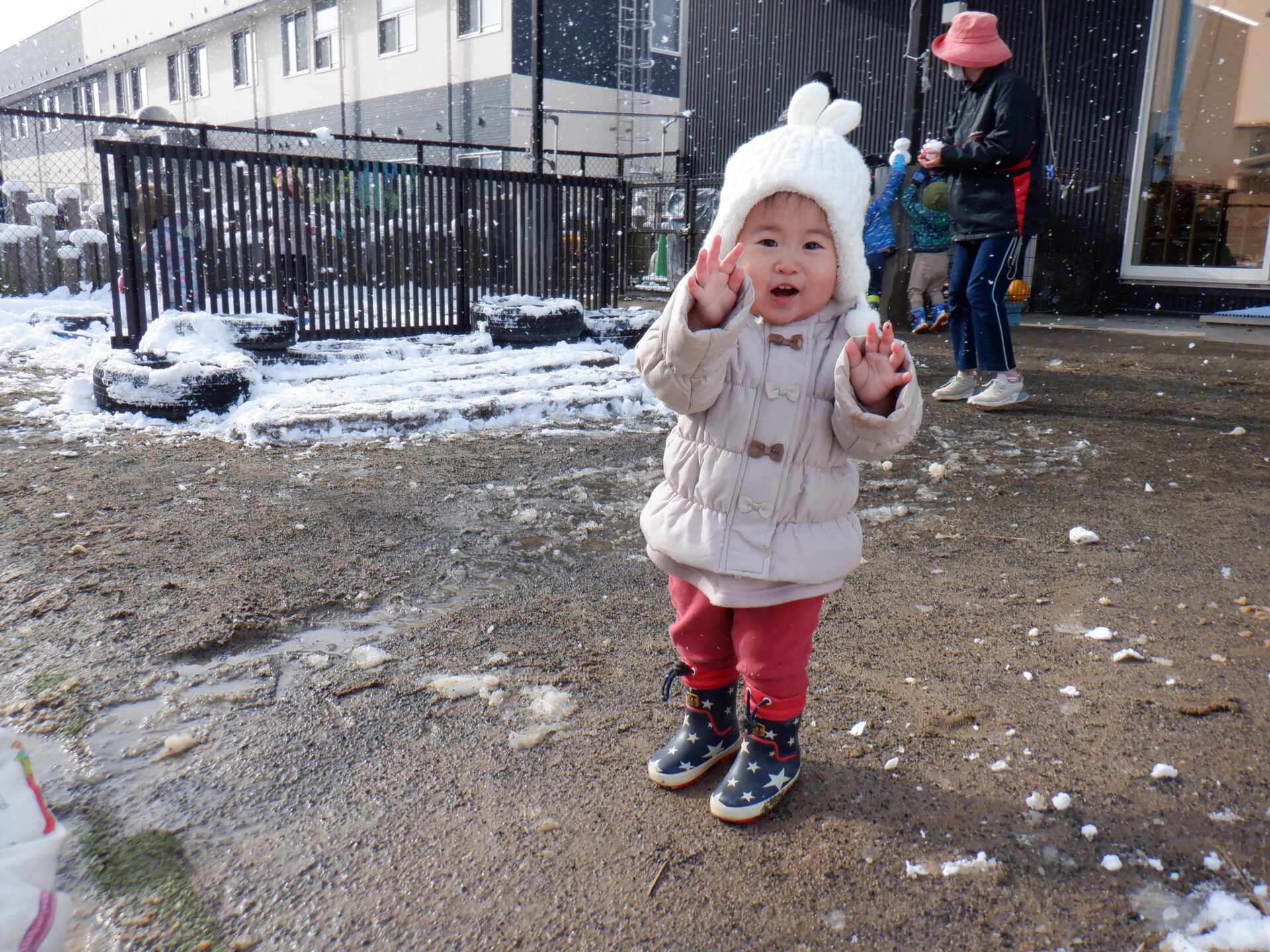 降ってきた雪をつかもうと、手を伸ばしたりするお友だちもいました!