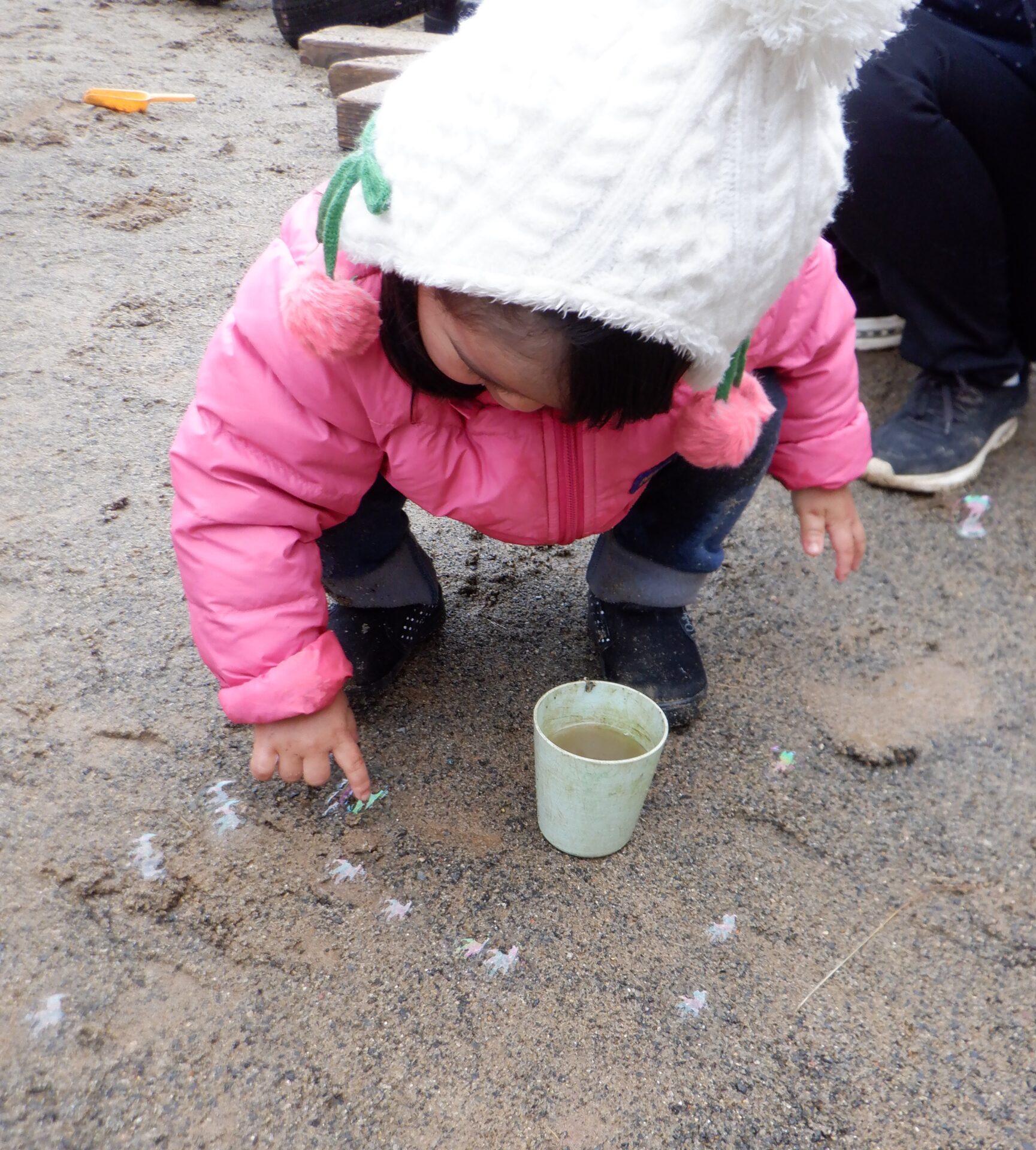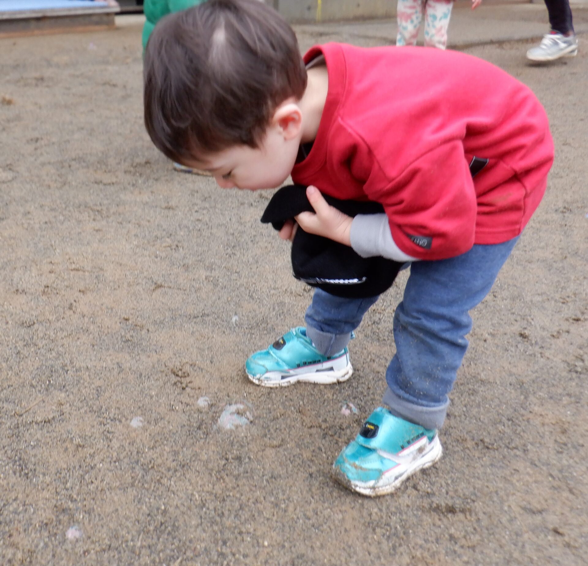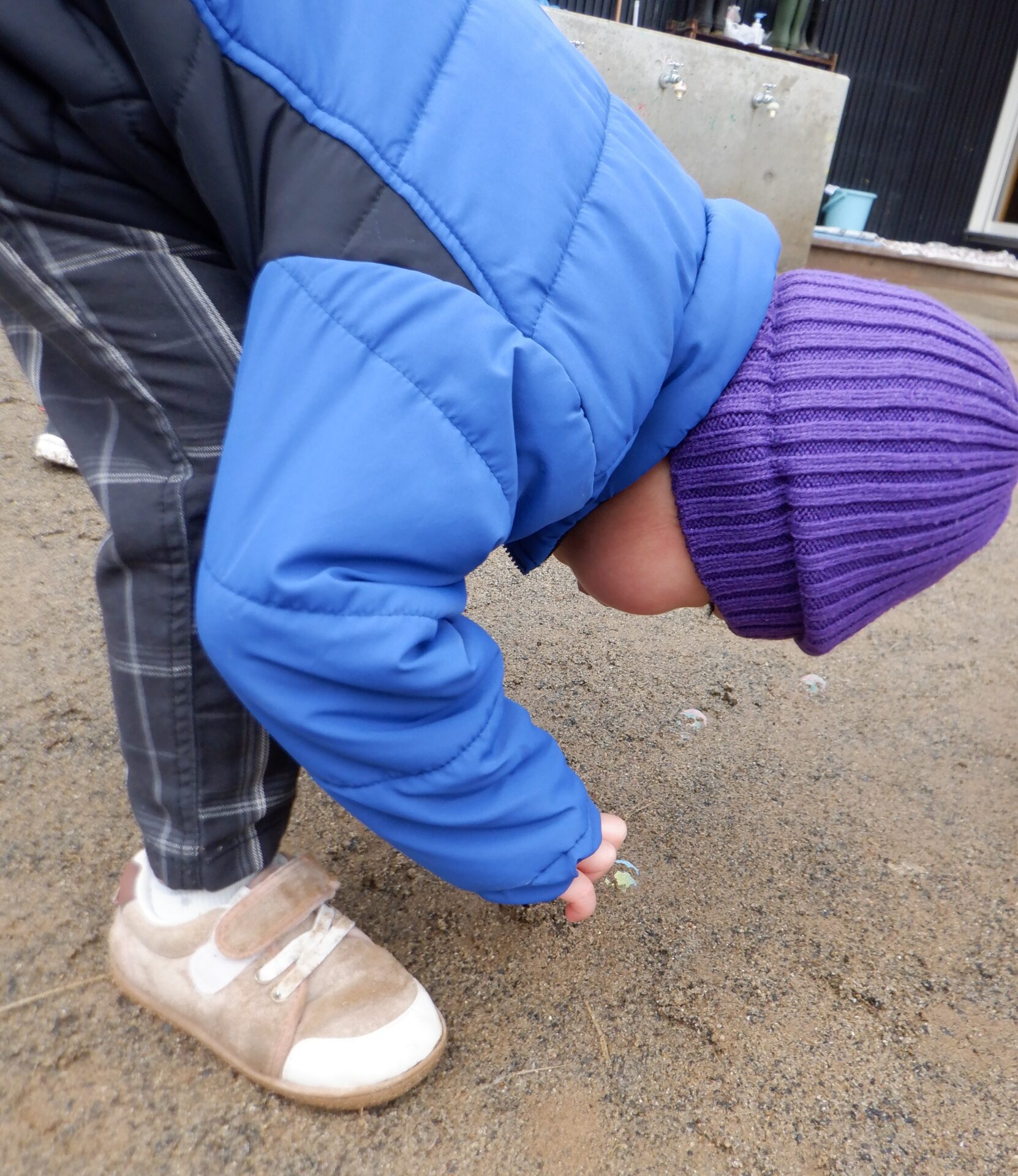地面にくっついたシャボン玉にツンツンと触ってみたり・・
