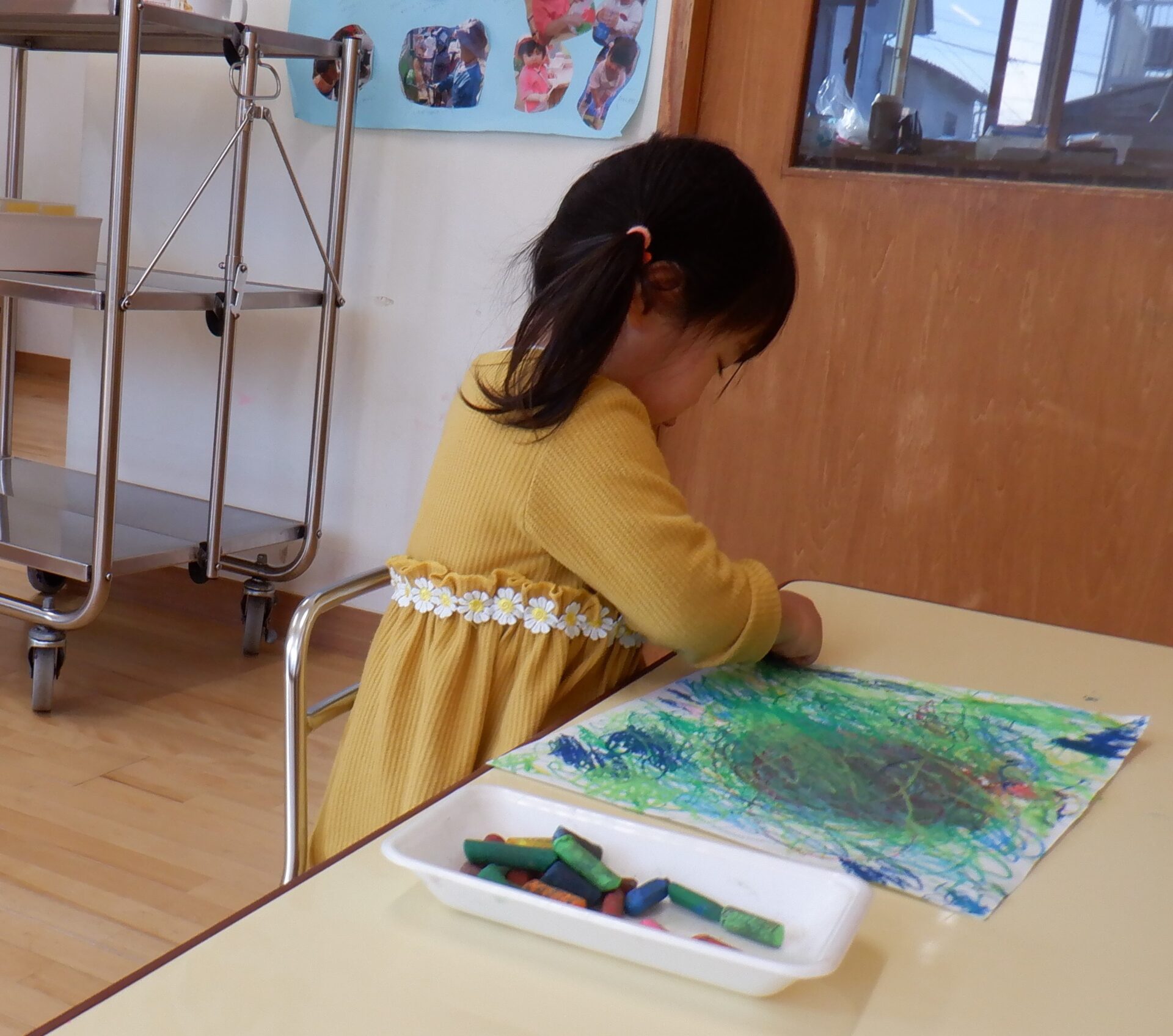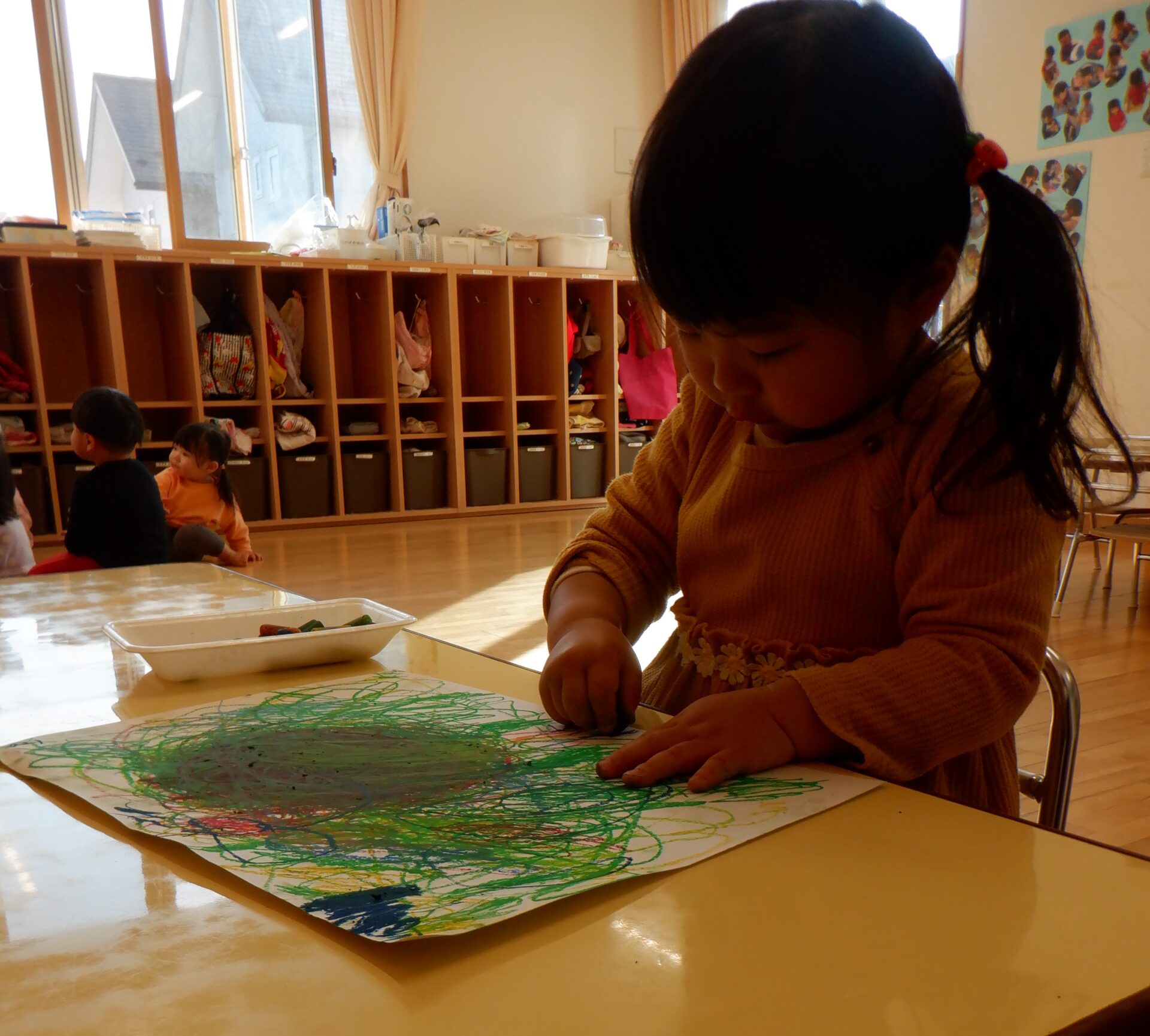 2024.02.21 しずく組(1歳児) ブログ 描きたい思いは止められない 白い画用紙にお絵描きが始まりました。 いろいろな色を使って楽しいな! みんなが絵本を見ていても・・・。 みんながおやつを食べていても・・・。 ひたすら描くことに夢中です。 やっとできた大作!! ねっ!素敵でしょ!! 一覧へ戻る