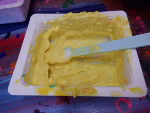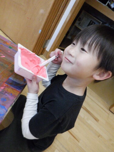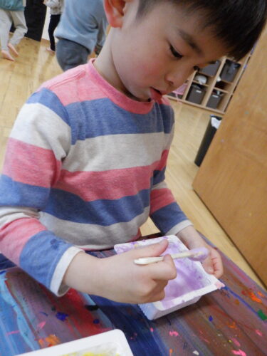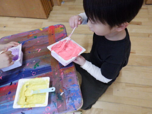 保育室の一角で、一生懸命何かを混ぜているにじ組の男の子たち。